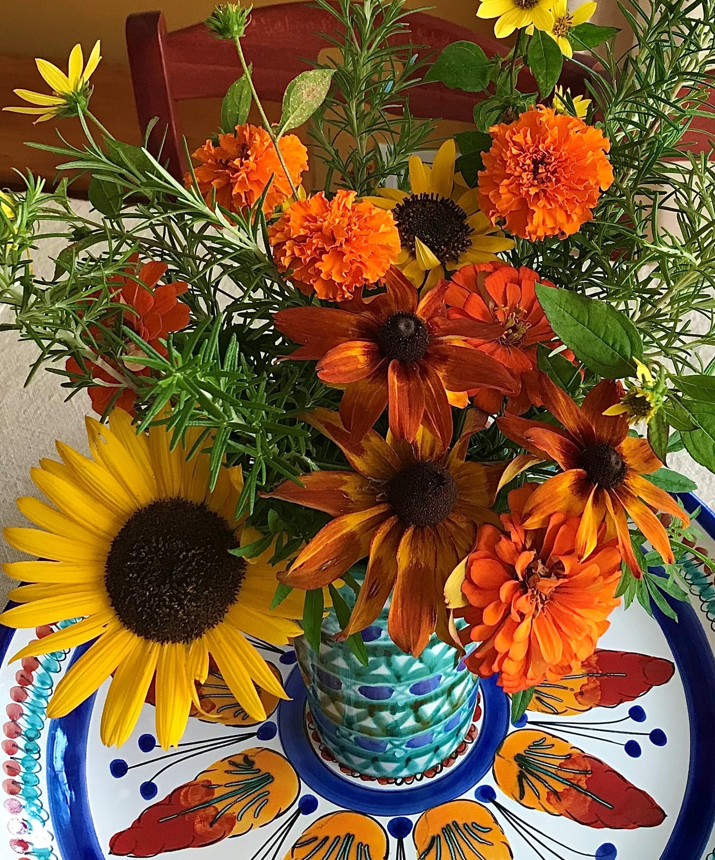 Late Summer...Sunflowers, zinnias, marigolds, and orange rudbeckia (or Black-eyed Susan) are arranged with rosemary from the herb garden in a vintage ceramic vase from France atop a vintage Italian platter.