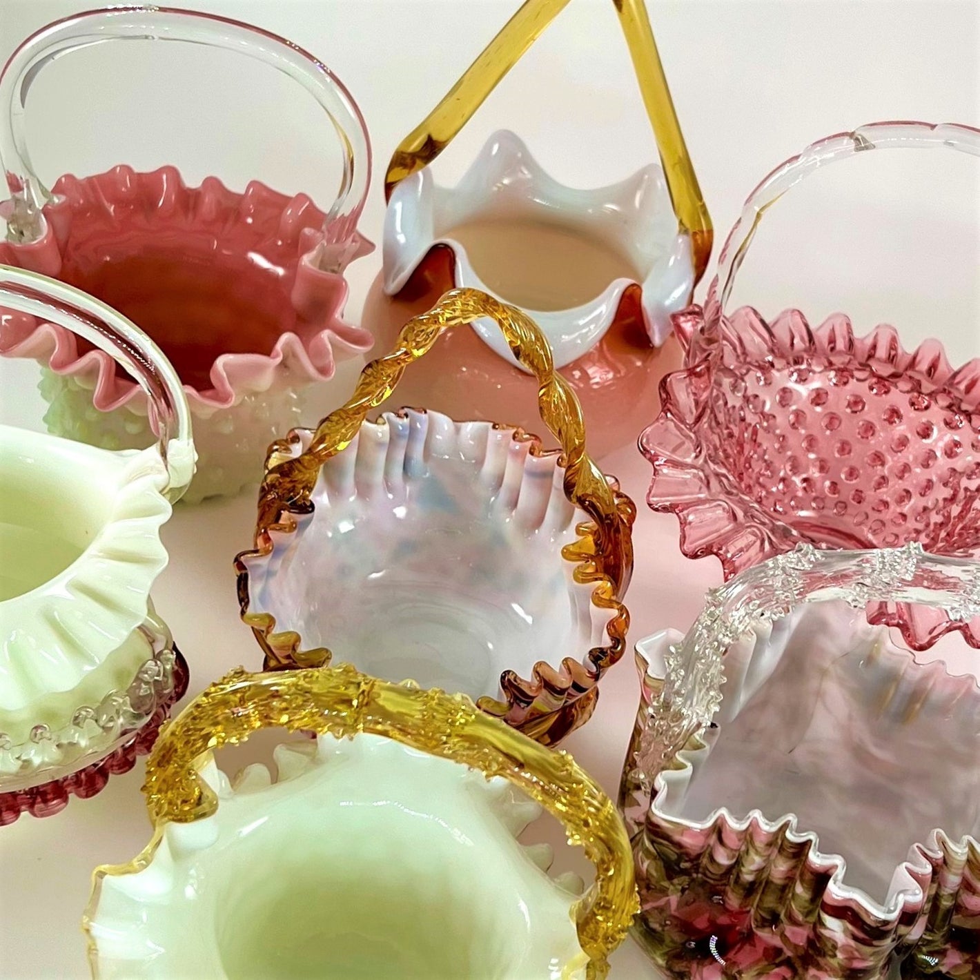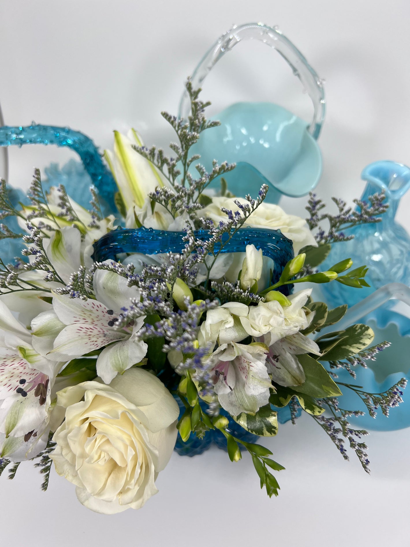 Winter...Roses, lilies, and alstromeria in a sea of hand-blown glass baskets and vases.