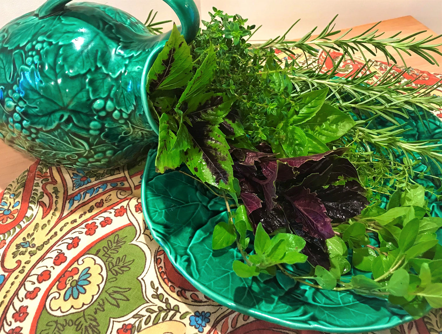 Majolica pitcher and plate with basils, rosemary, thyme, and marjoram.