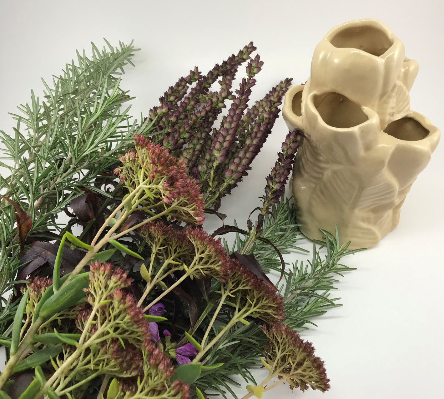 Niloak tulip vase with Autumn Joy sedum, rosemary, and obedient plant.