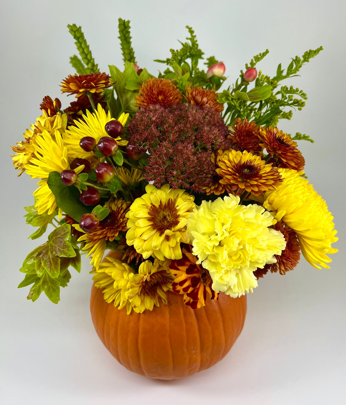 Autumn...Chrysanthemums, marigolds, carnations, and sedum blooms, are arranged with greens from Obedient plants (or false dragonhead), geraniums, and goldenrod, with berry accents, all in a pumpkin vase.