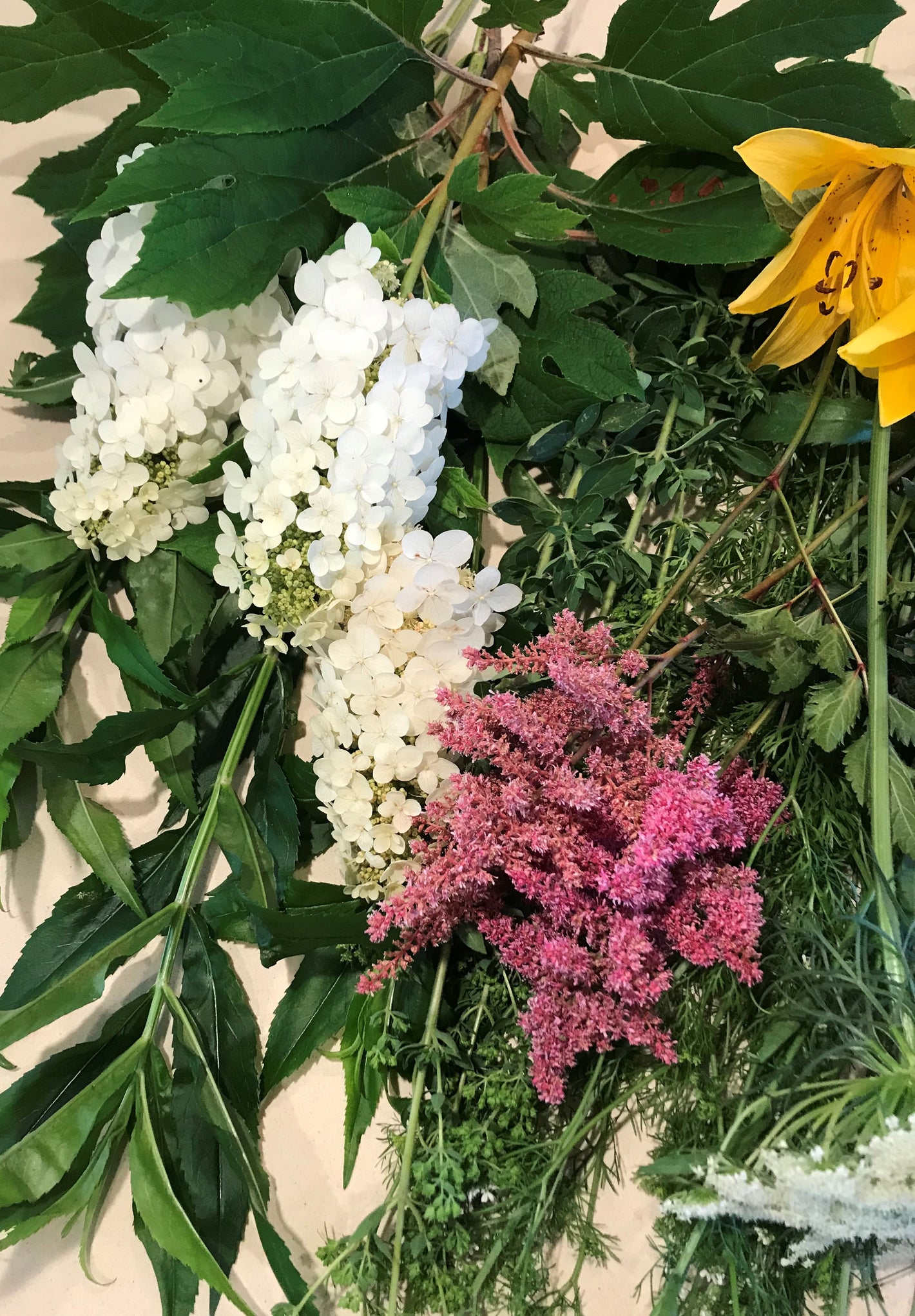 Oakleaf hydrangeas, daylilies, astilbe, and carrot blossoms