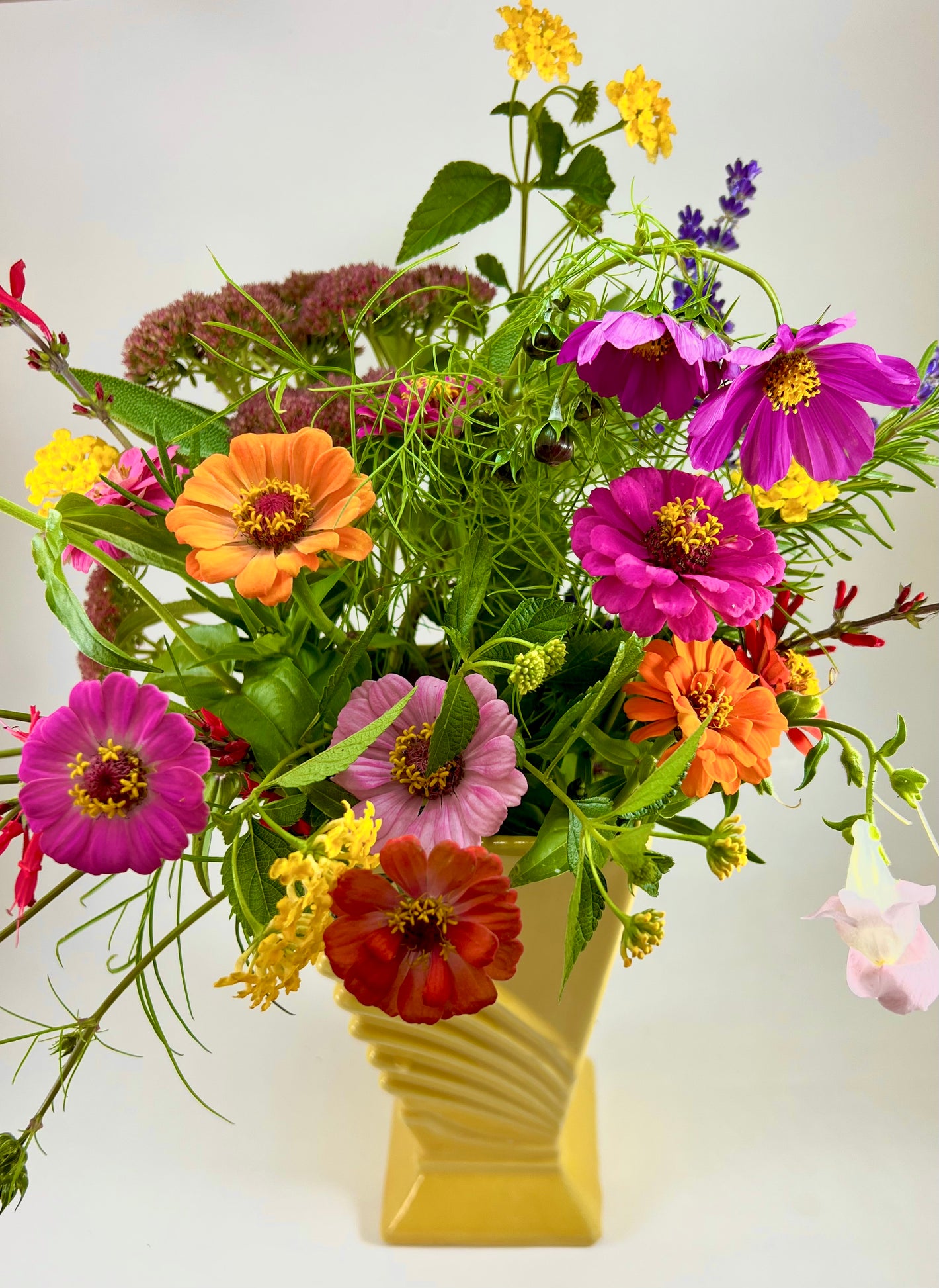 Summer...Zinnias, cosmos, snapdragons, lantana, and sedum are arranged with lavender and pineapple sage blossoms from the herb garden in a vintage yellow McCoy vase.