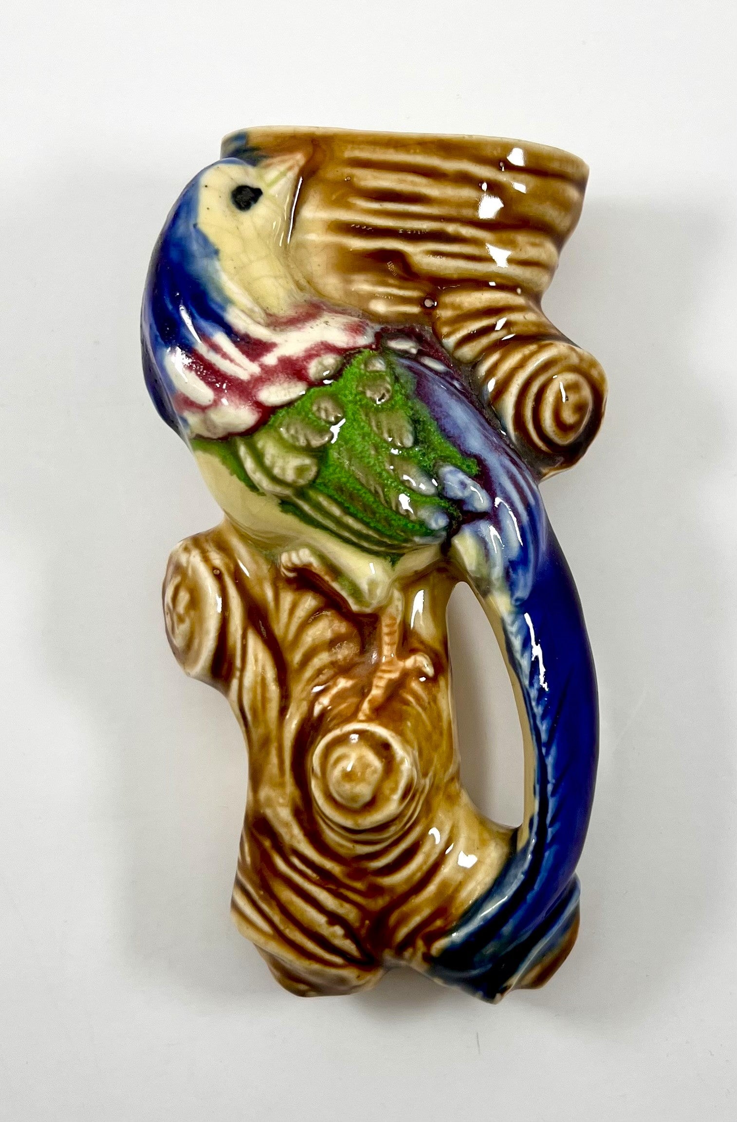 Beautifully detailed ceramic wall pocket featuring a blue-feathered bird on a tree.
