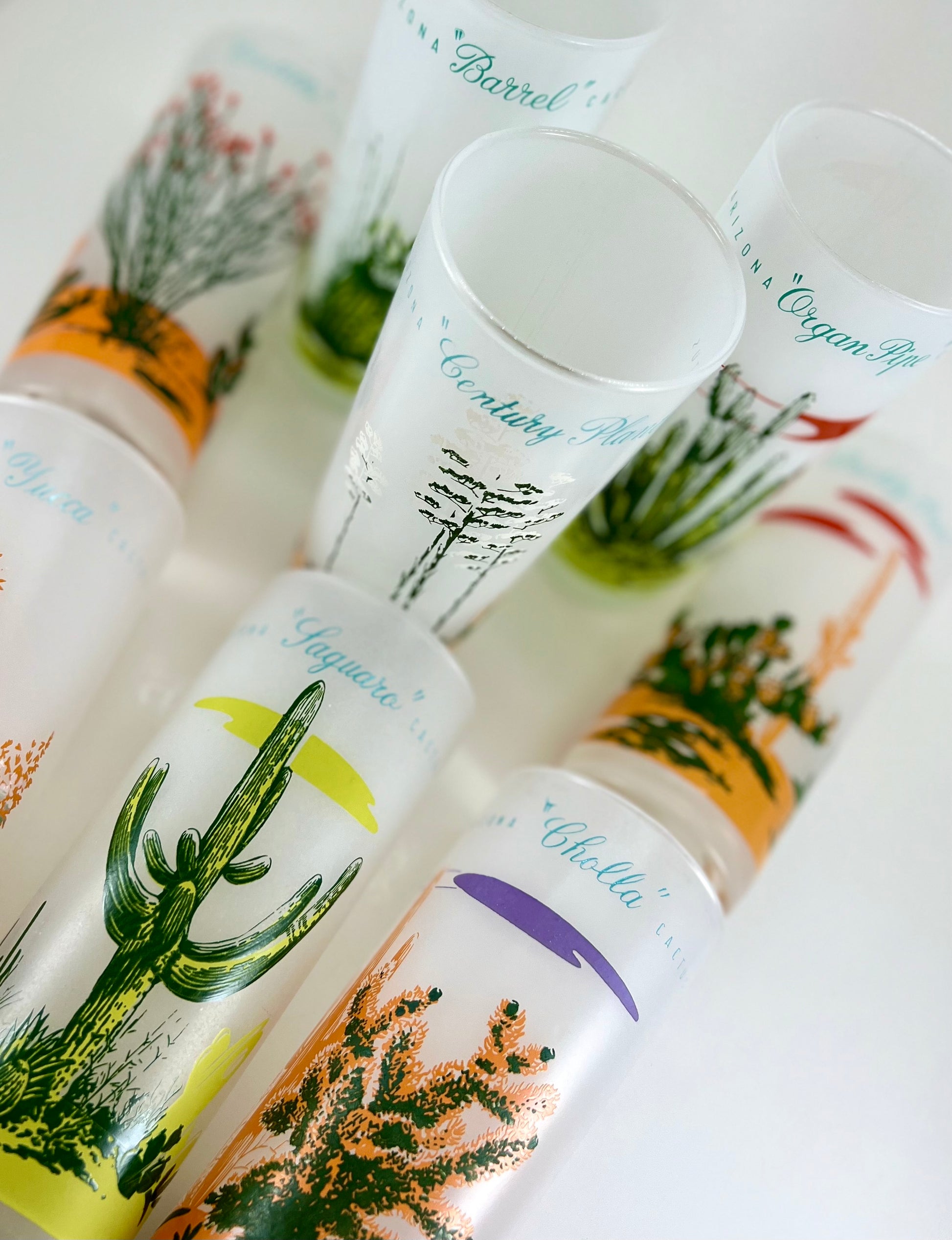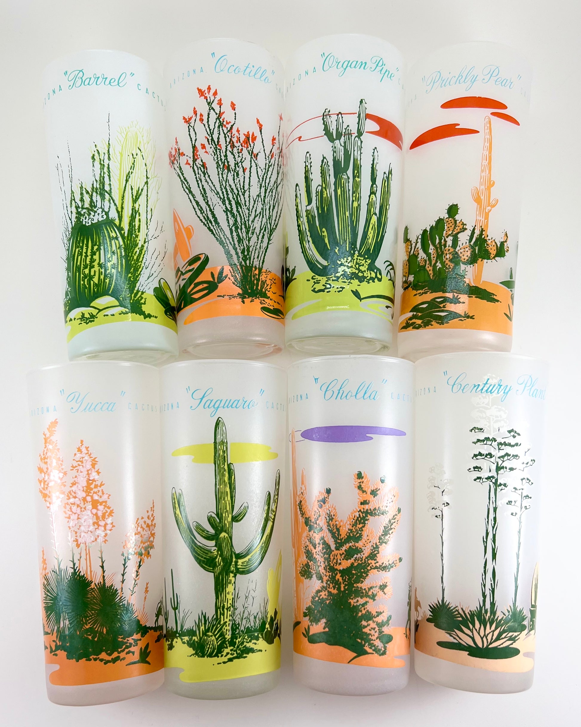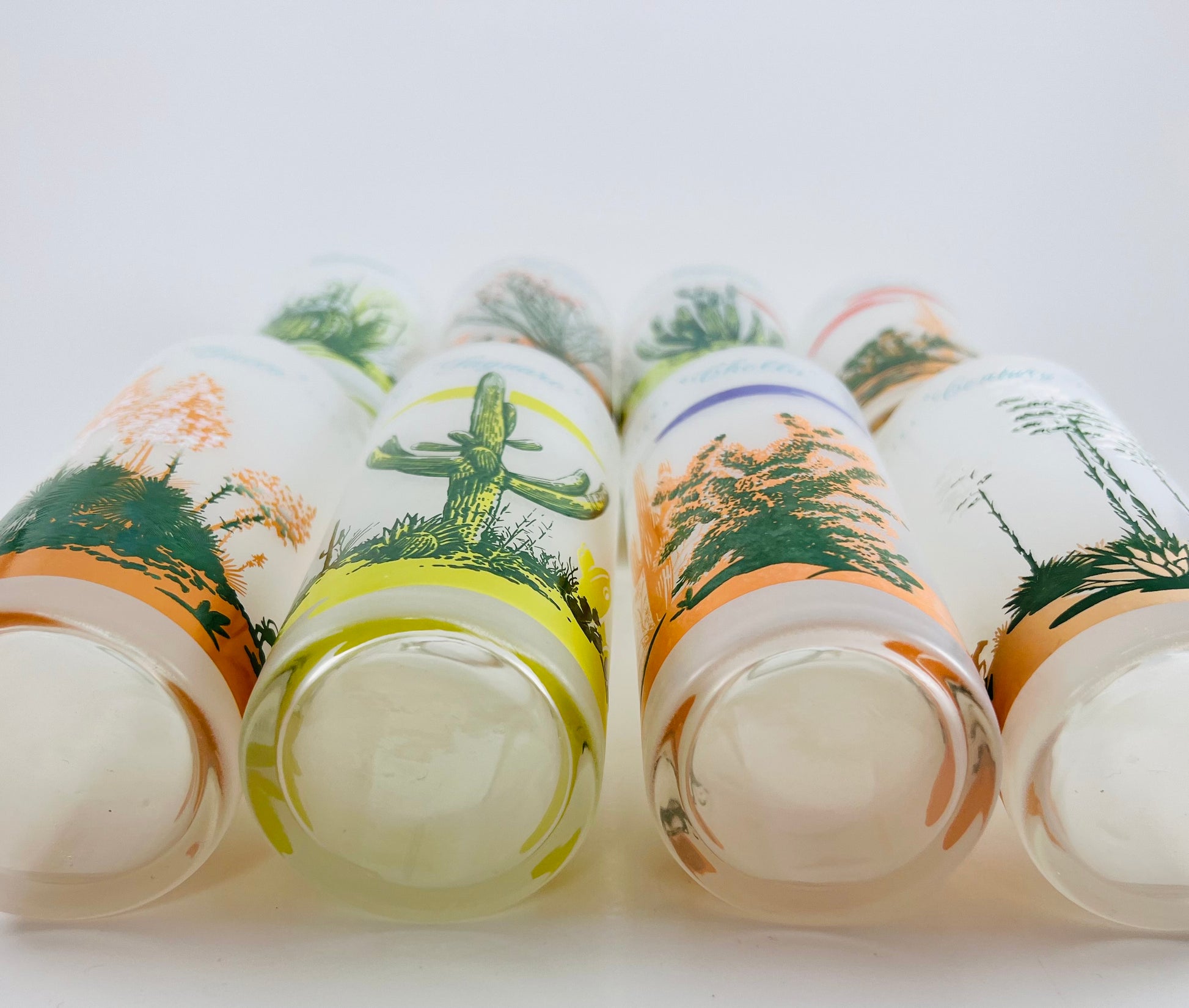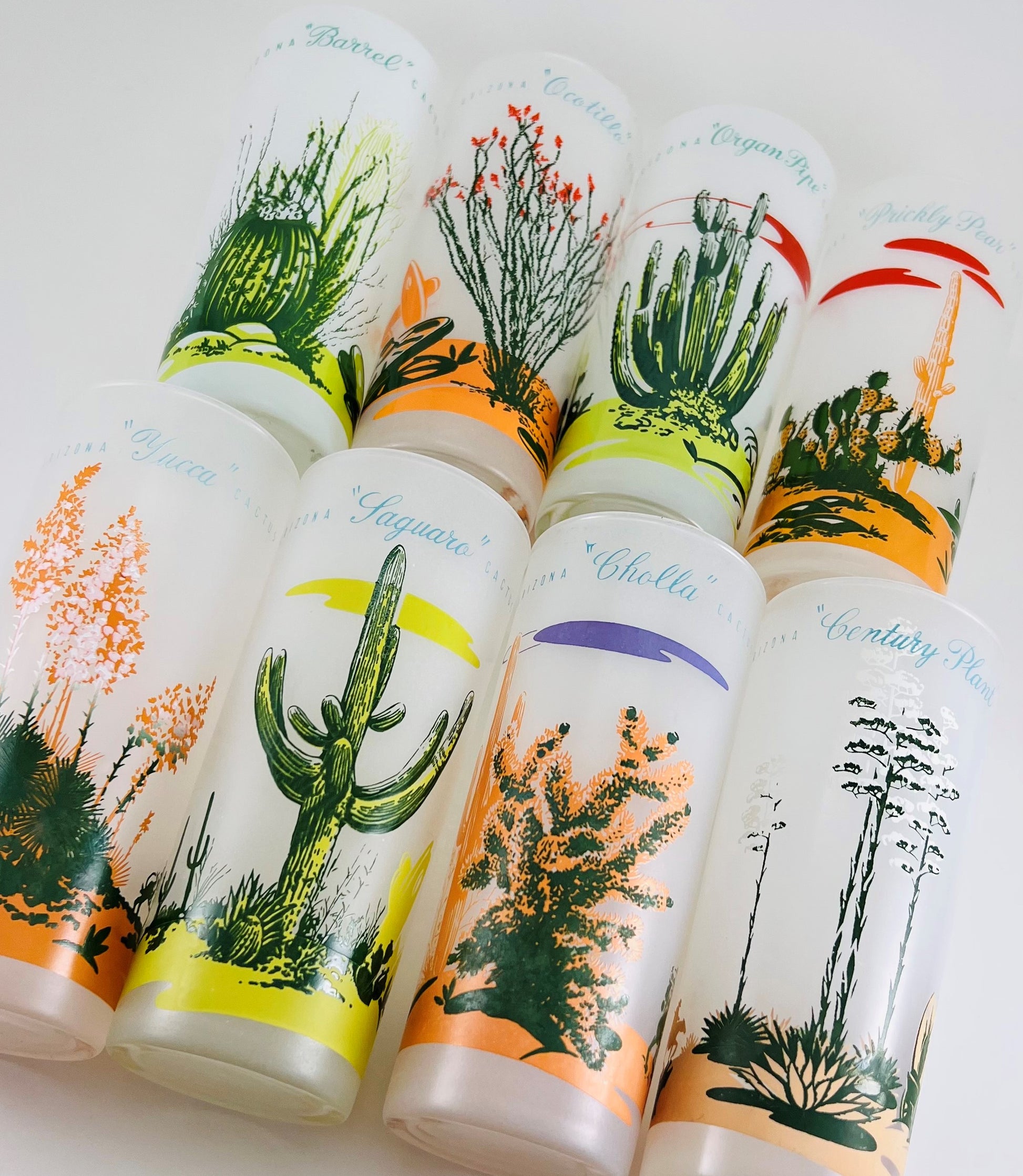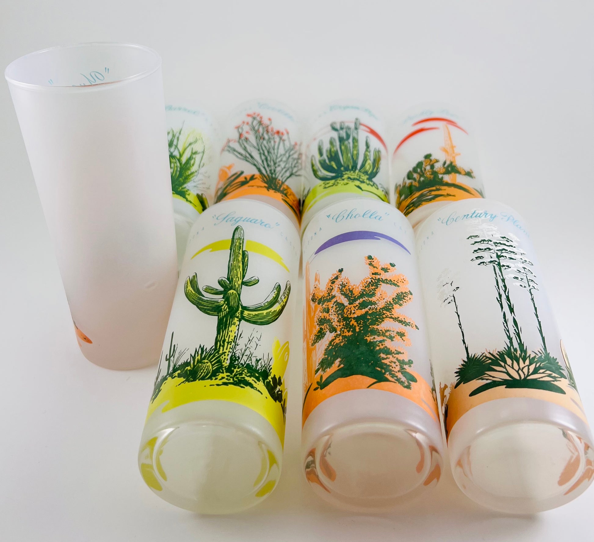 This set of eight, purchased from the original owner who collected them while living in Arizona in the middle years of the 20th century, is in excellent condition with vibrant colors. Included are the following cactus varieties: Saguaro, Yucca, Prickly Pear, Cholla, Century Plant, Organ Pipe, Barrel , and Ocotillo. Measuring apaproximately 6 1/2" tall with a diameter at the opening of 2 3/4", these glasses were perfectly designed for tall, cool drinks of iced tea or lemonade or something a bit stronger to beat the Arizona heat!