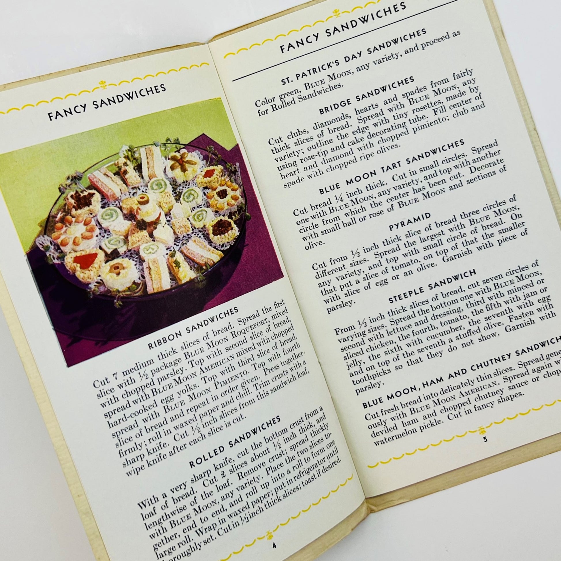 According to Blue Moon, they "cannot in such limited space present a complete repertoire of sandwiches, but, how old Lord Sandwich would sigh could he know of the spread delights he missed!" In addition to numerous sandwich recipes, including our favorites, those for "the unexpected guest," the booklet includes appetizers, canapes, breads, biscuits, salads, and luncheon and supper dishes as well as the delightfully named "savories and novelties!"