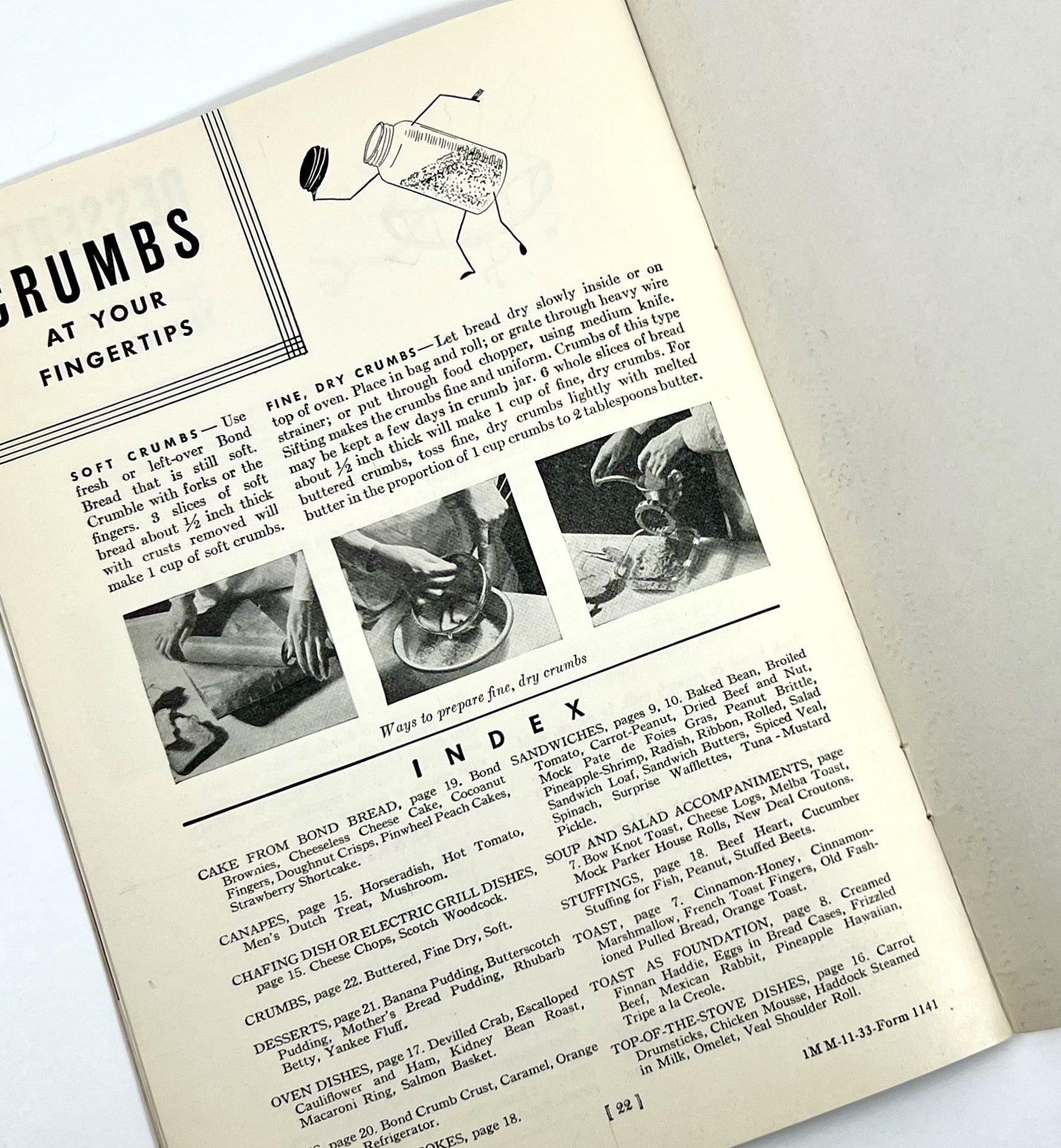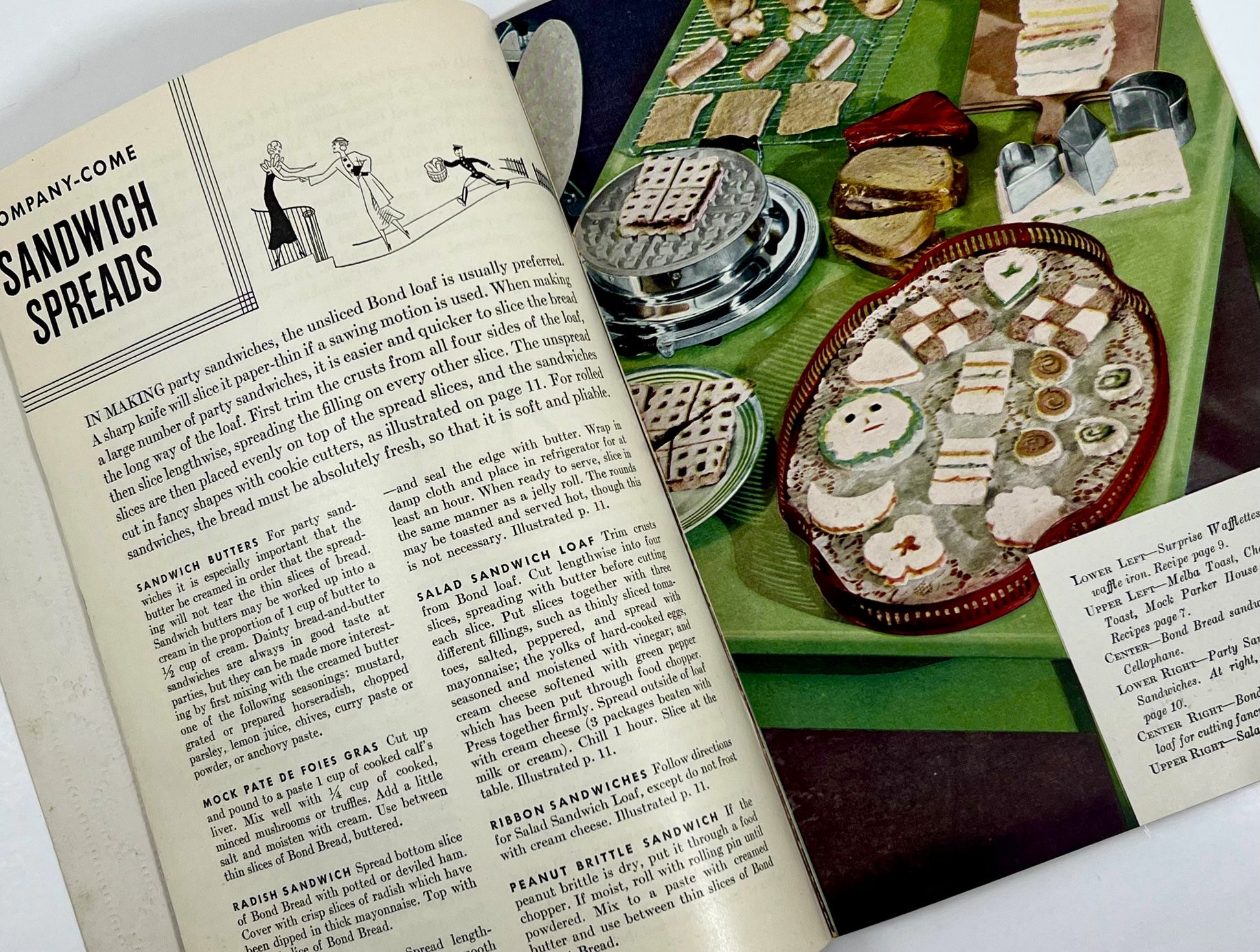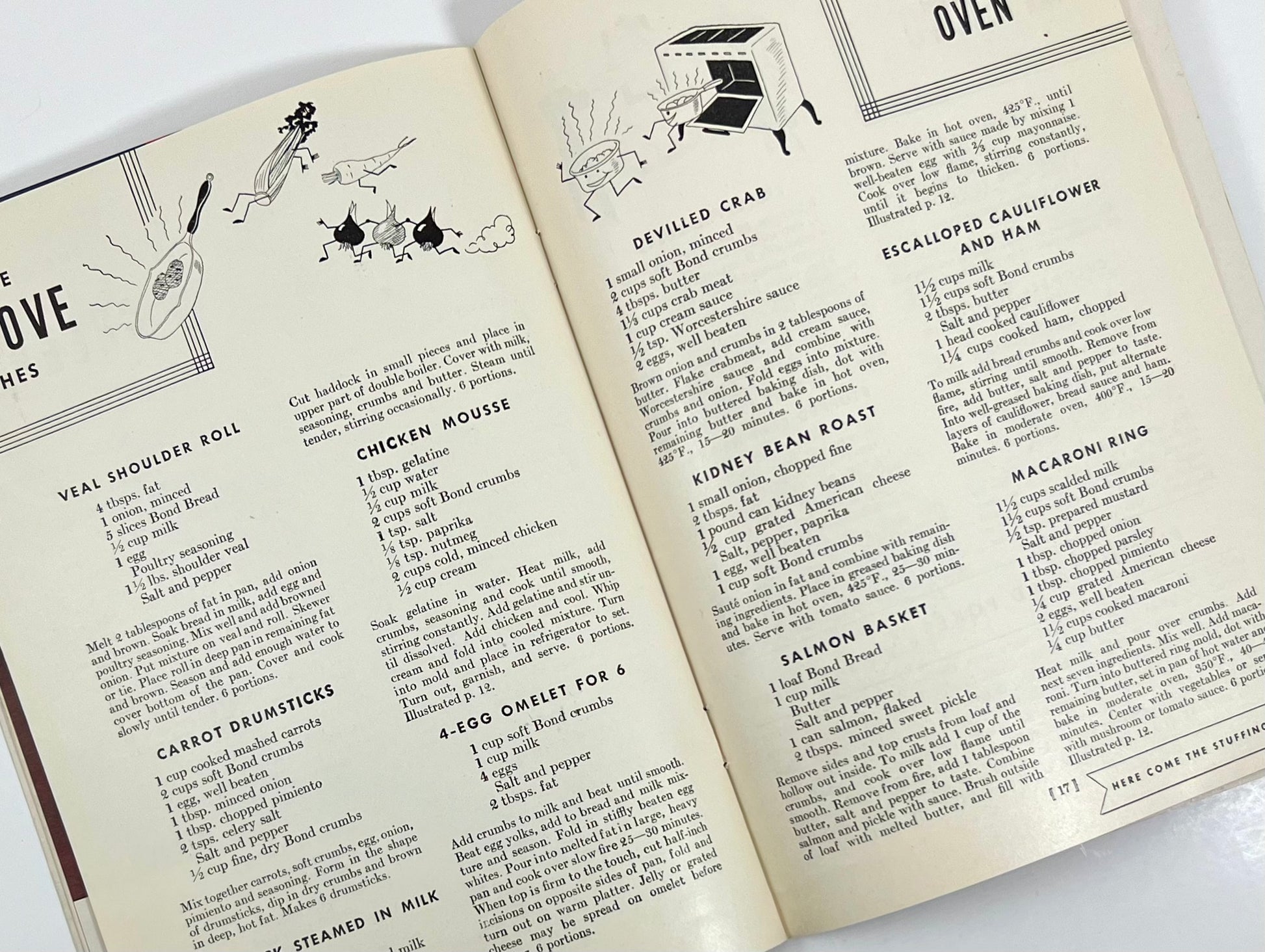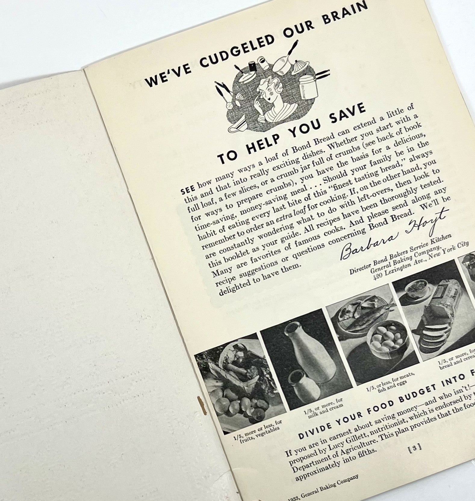 "We've cudgeled our brain to help you save." This sentence provides the introduction to a cook book from Bond Bread that is filled with the everyday person's food budget in mind. "See how many ways a loaf of Bond Bread can extend a little of this and that into really exciting dishes." Entrees, canapes, stuffings, toasts, and desserts -- all are included in this Depression-era guide to stretching the food dollar. And who doesn't still need that today?