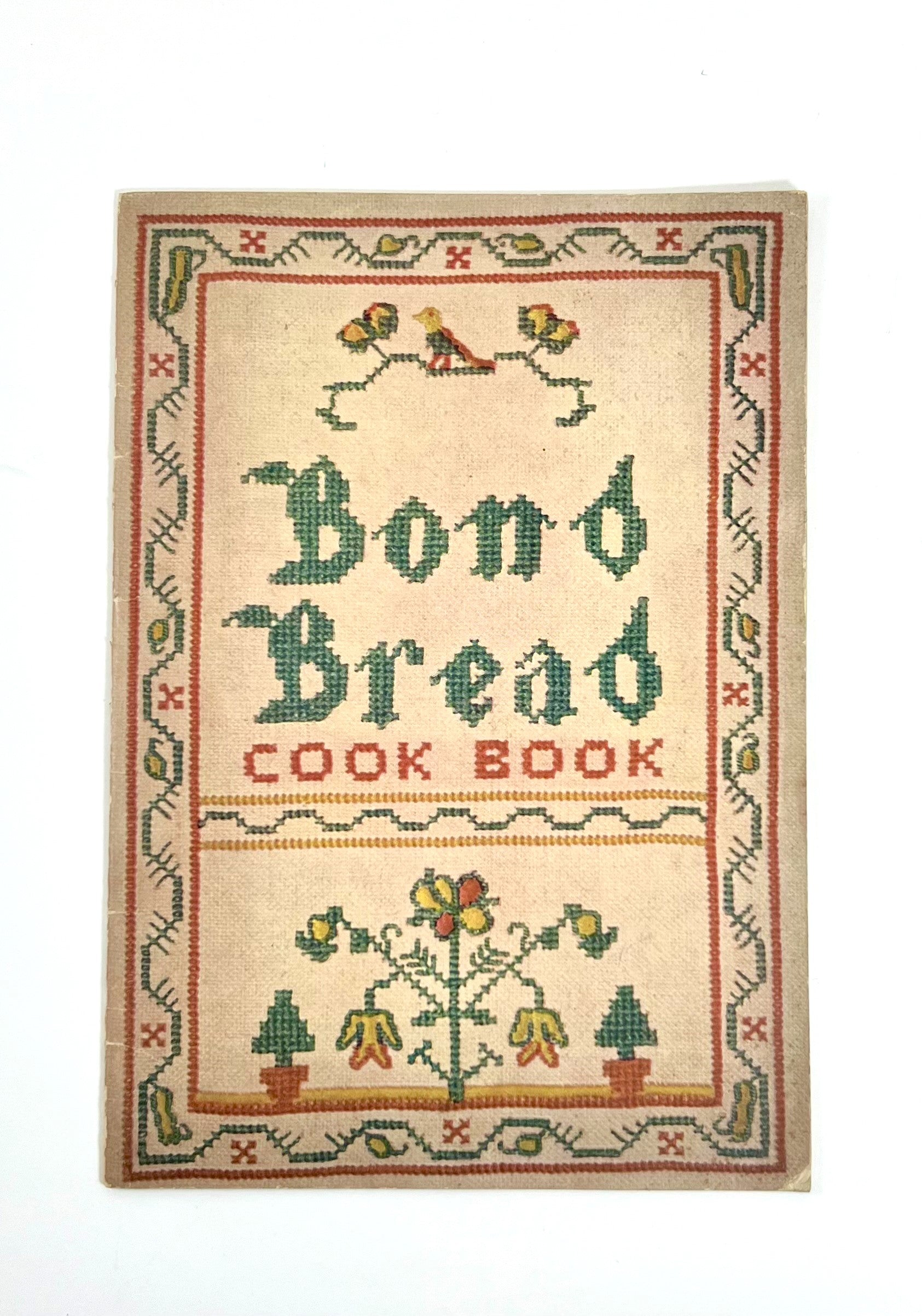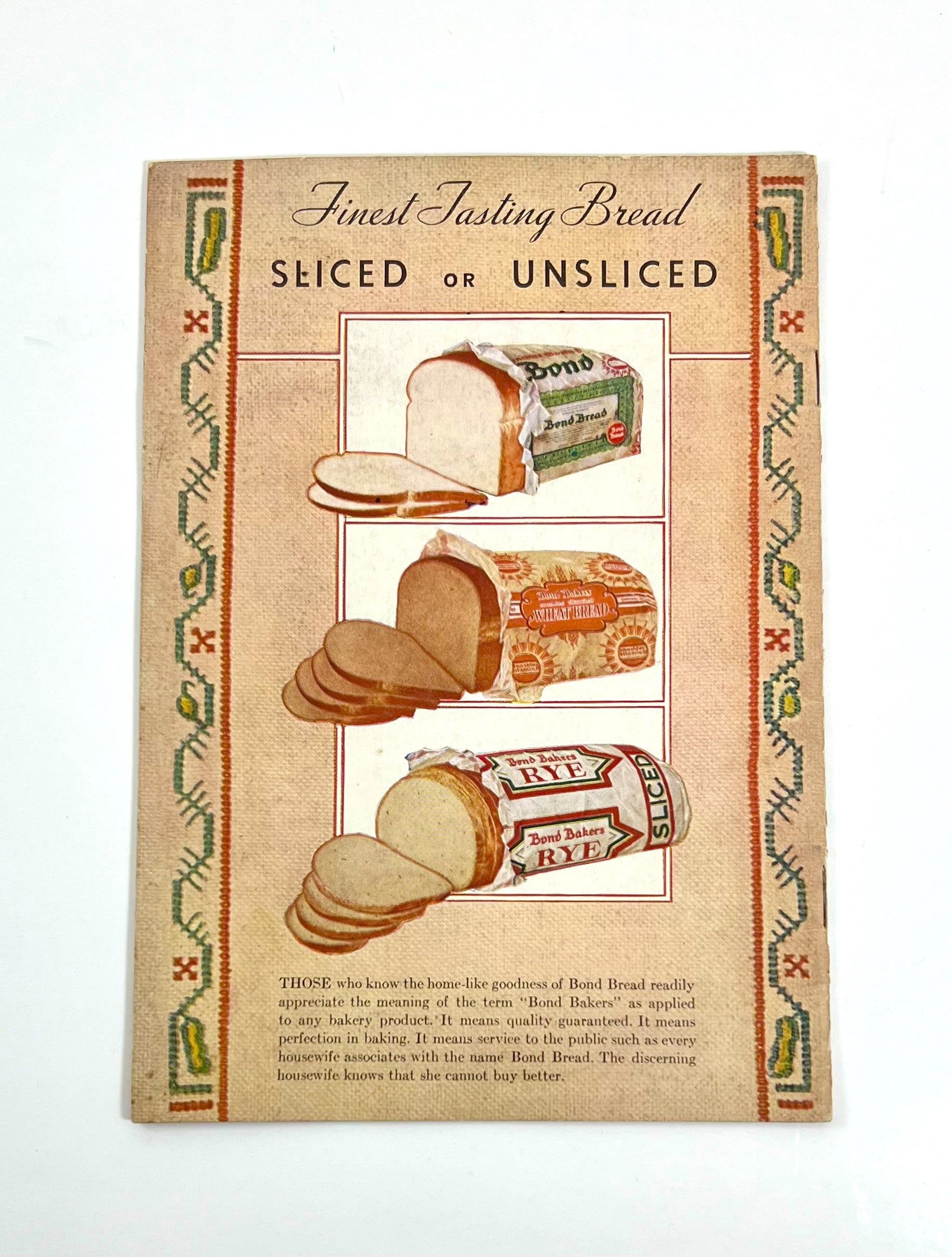 Measuring approximately 8 1/4" x 5 3/4" with 22 pages, the Bond Bread Cook Book has something for everyone. Particular favorites are the sections on Company-Come Sandwich Spreads, The Bite That Cheers, and Bread Into Cake.