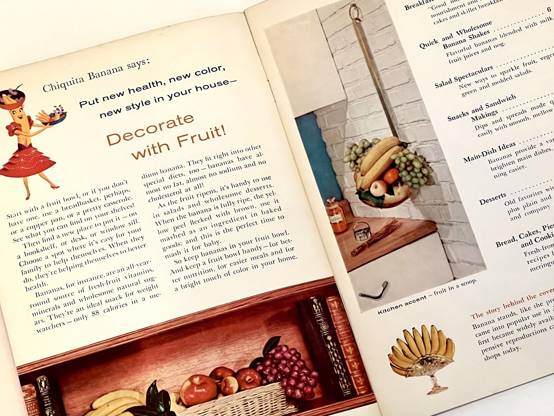 This book opens with Chiquita Banana (yes, the name of the female mascot for the United Fruit Company's brand of bananas) saying "Put health, new color, new style in your house -- Decorate with Fruit!" She then goes on to tell the reader that bananas are "an ideal snack for weight watchers" and that they are perfect as decor "on a bookshelf, or desk, or window sill." There is even a description of the banana stand featured on the front cover with a guide to wear to find your own. A kooky mid-century approach to a promotional cookbook for sure!
