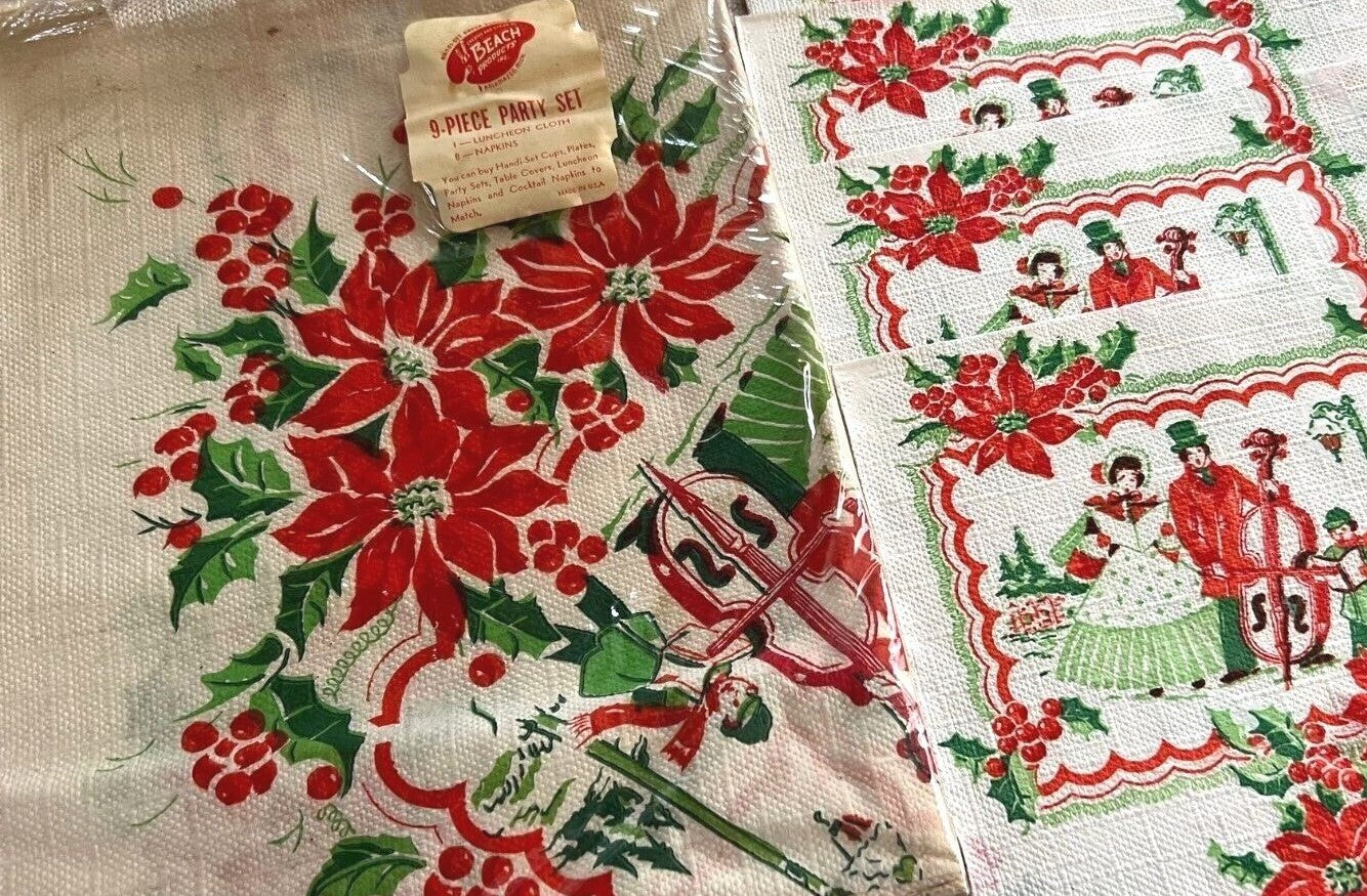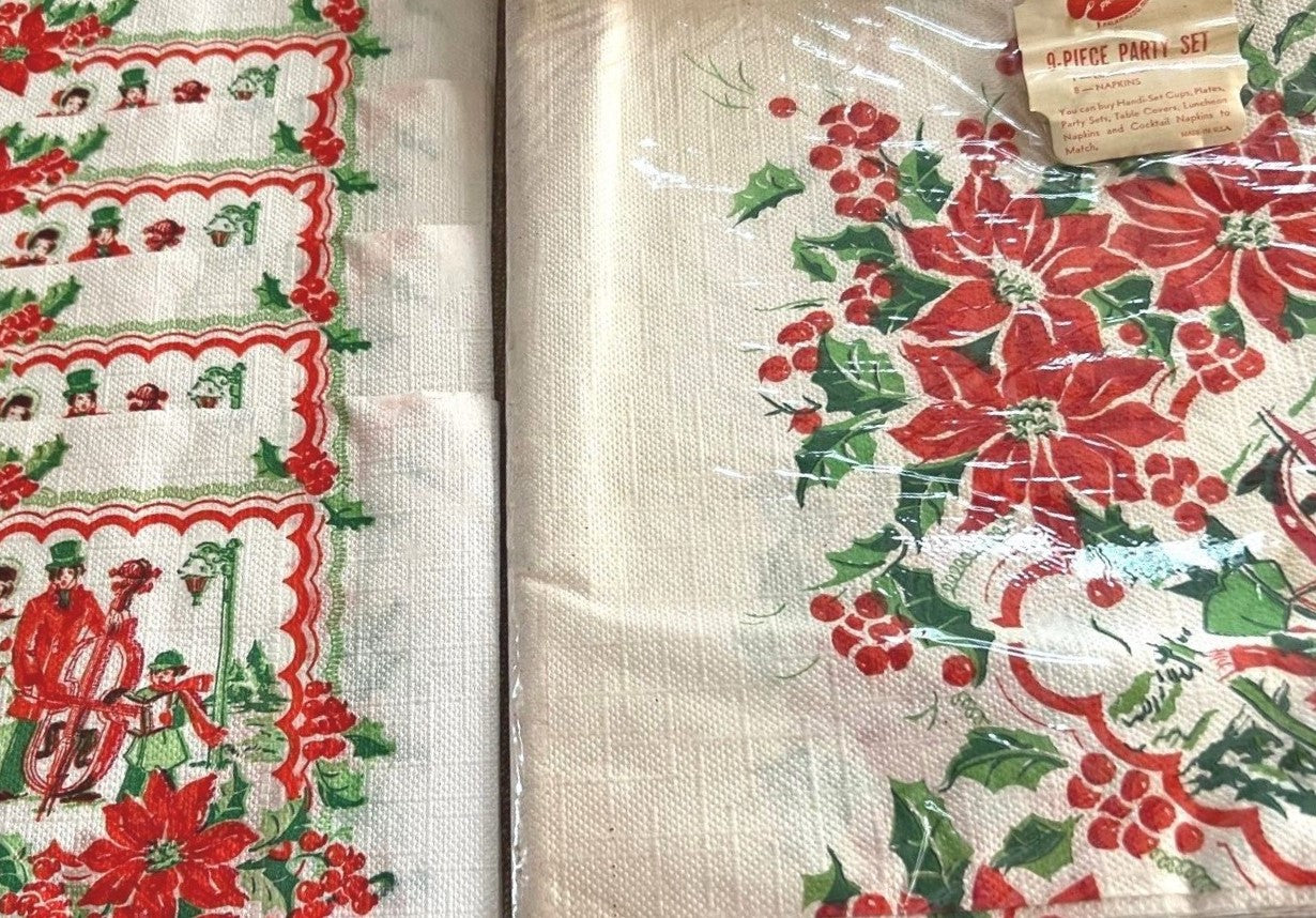 Mid-century Christmas paper napkin and tablecloth set featuring carolers and instruments with holly and poinsettia accents.