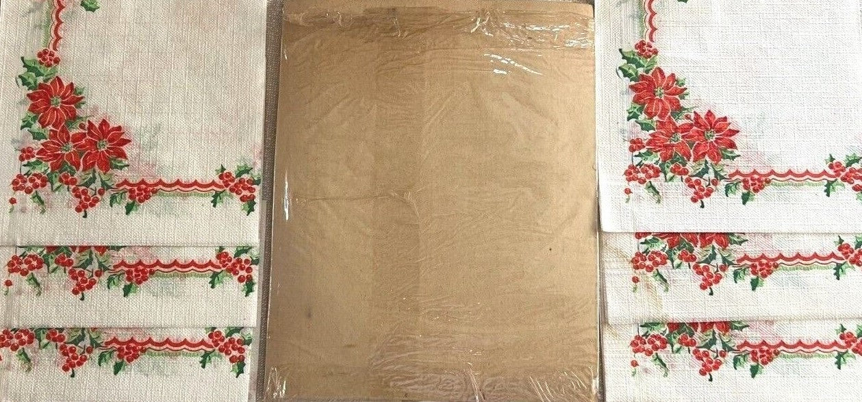 While the set is unused, there is some discoloration from age and storage. However, we think this adds to the charm and authenticity of this delightful set. We did not remove the tablecloth because we did not want to risk tearing the original package. Napkins measure approximately 6 3/4" x 6 3/4" folded. The package measures approximately 8" x 10 1/4".