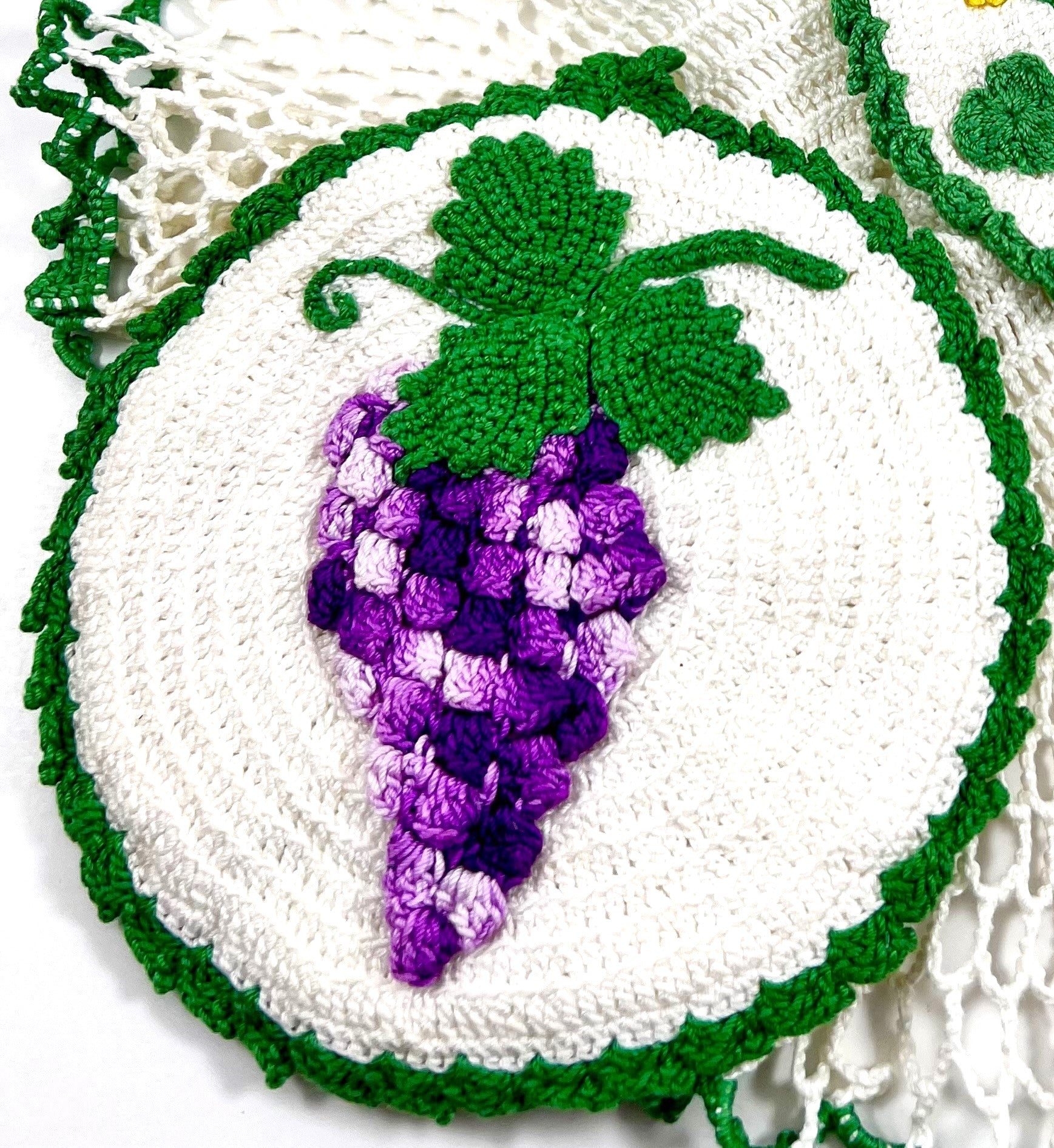 Crocheted Garden Potholder Pair, Yellow Buttercups and Grapes, Mid-century