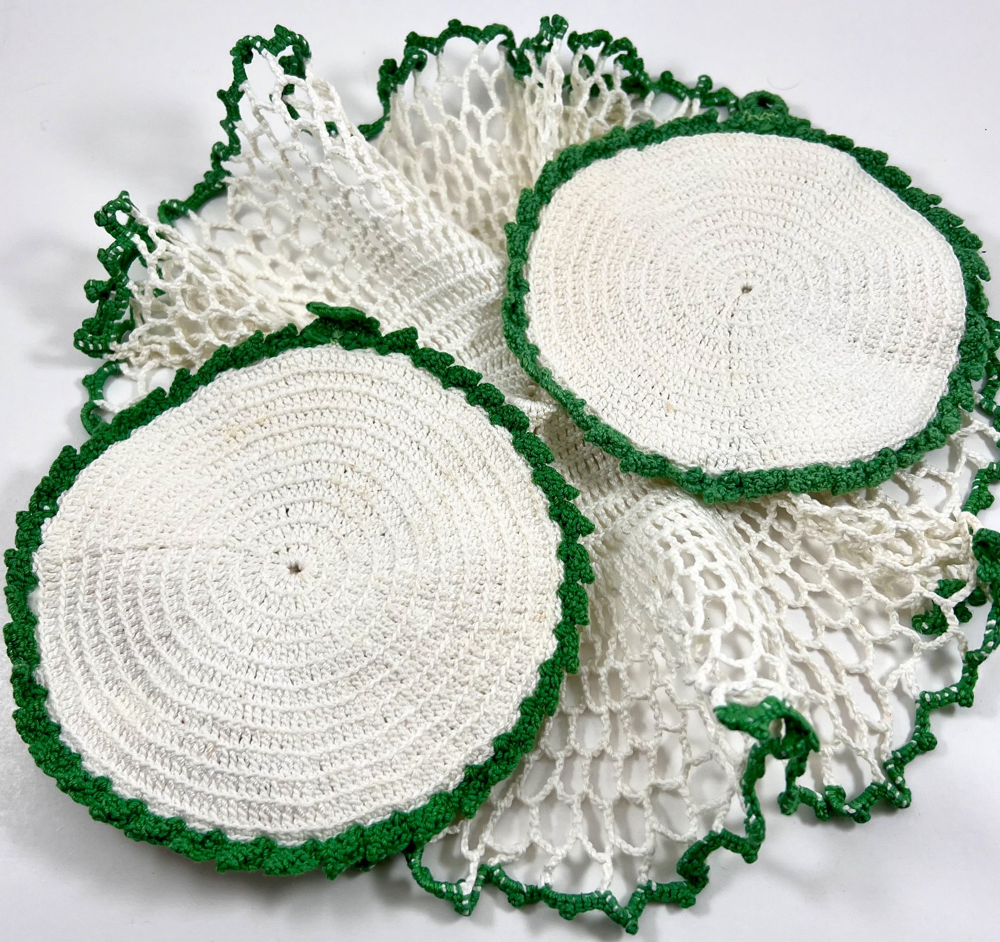 Crocheted potholder or hot pads, as they were sometimes called, were all the rage in the middle years of the 20th century with patterns ranging from floral, fruit, and vegetable themes to hearts and geometric patterns. Often circular shape, many homes in America had versions of these in their kitchen.