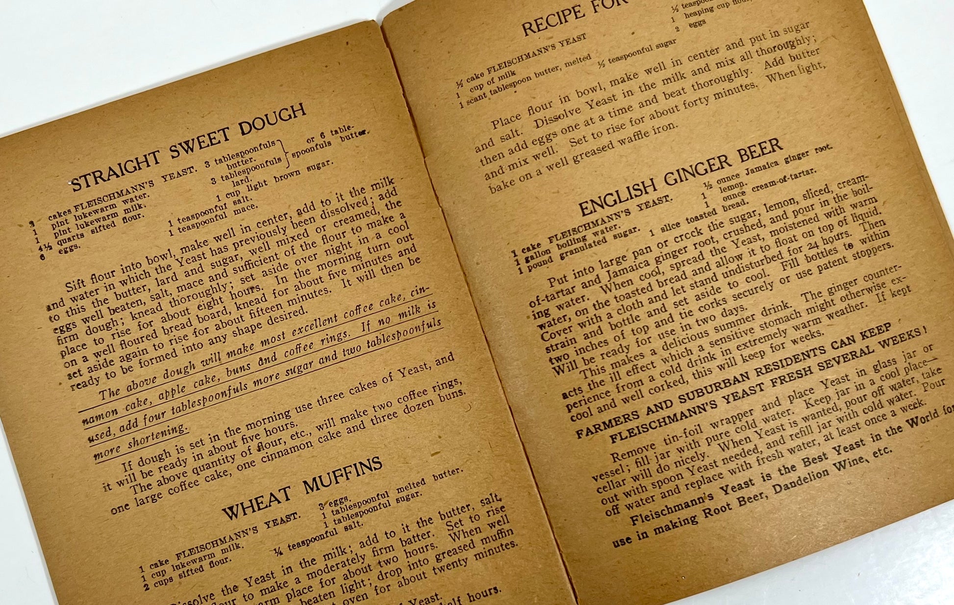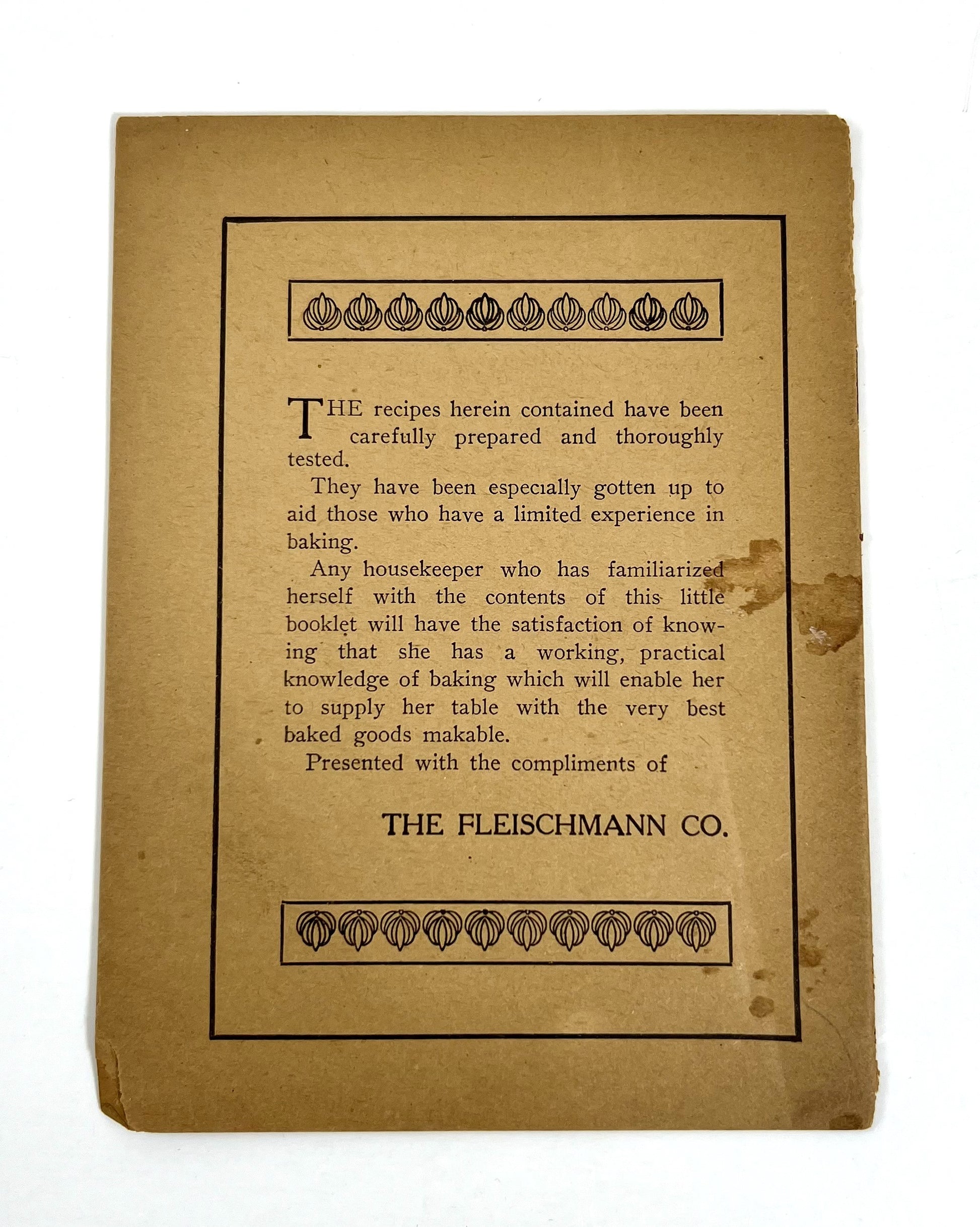 Being as old as it is, the Fleischmann's Booklet is both rare and fragile. There is discoloration and wear with the cover attached loosely.