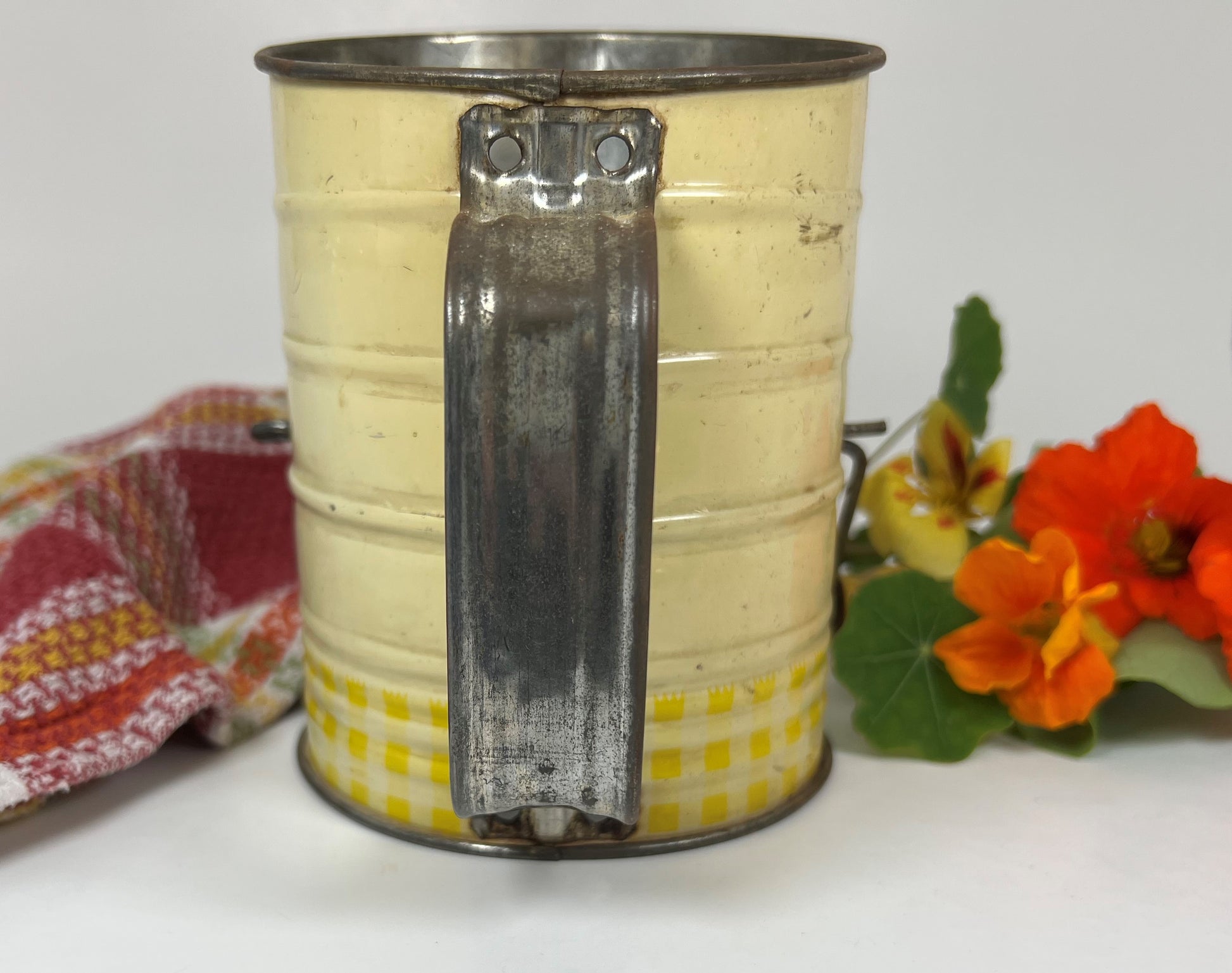 Made of lithographed tin with a wooden handle, it is apparent how well-loved and treasured this 1940s flour sifter was in its previous home. A sifter like this would have been found in most kitchens in early and mid-century America, each with a design that was special to the baker in the house. Imagine the celebratory cakes, after-school cookies, holiday pies, and everyday breads this kitchen treasure has seen!