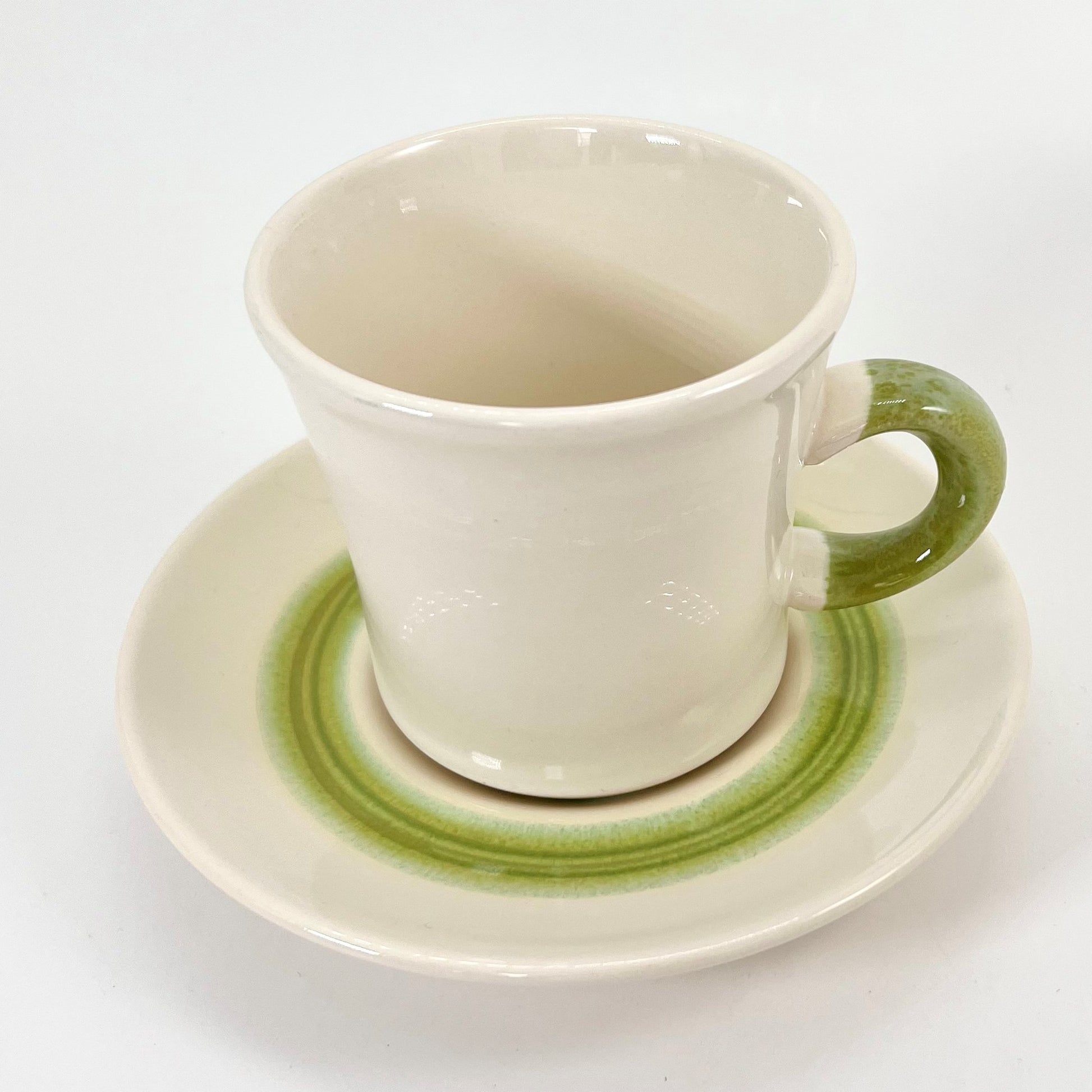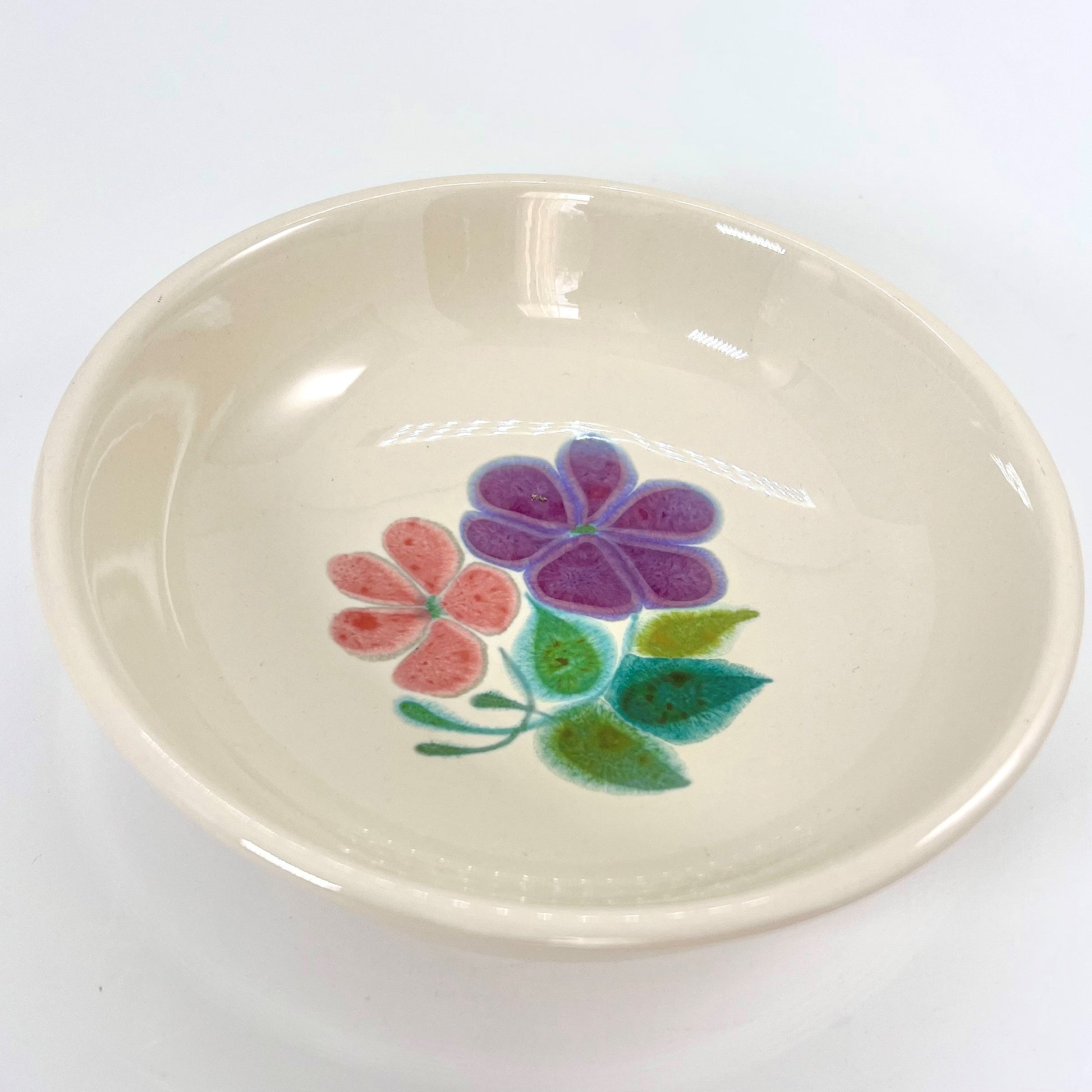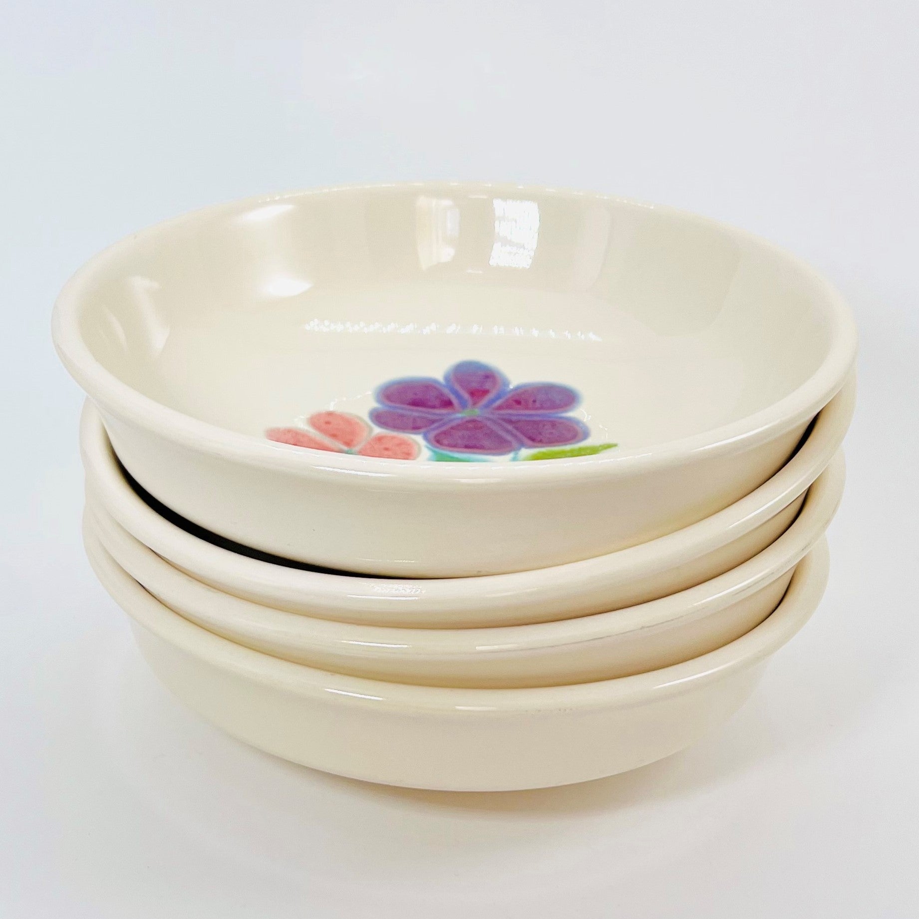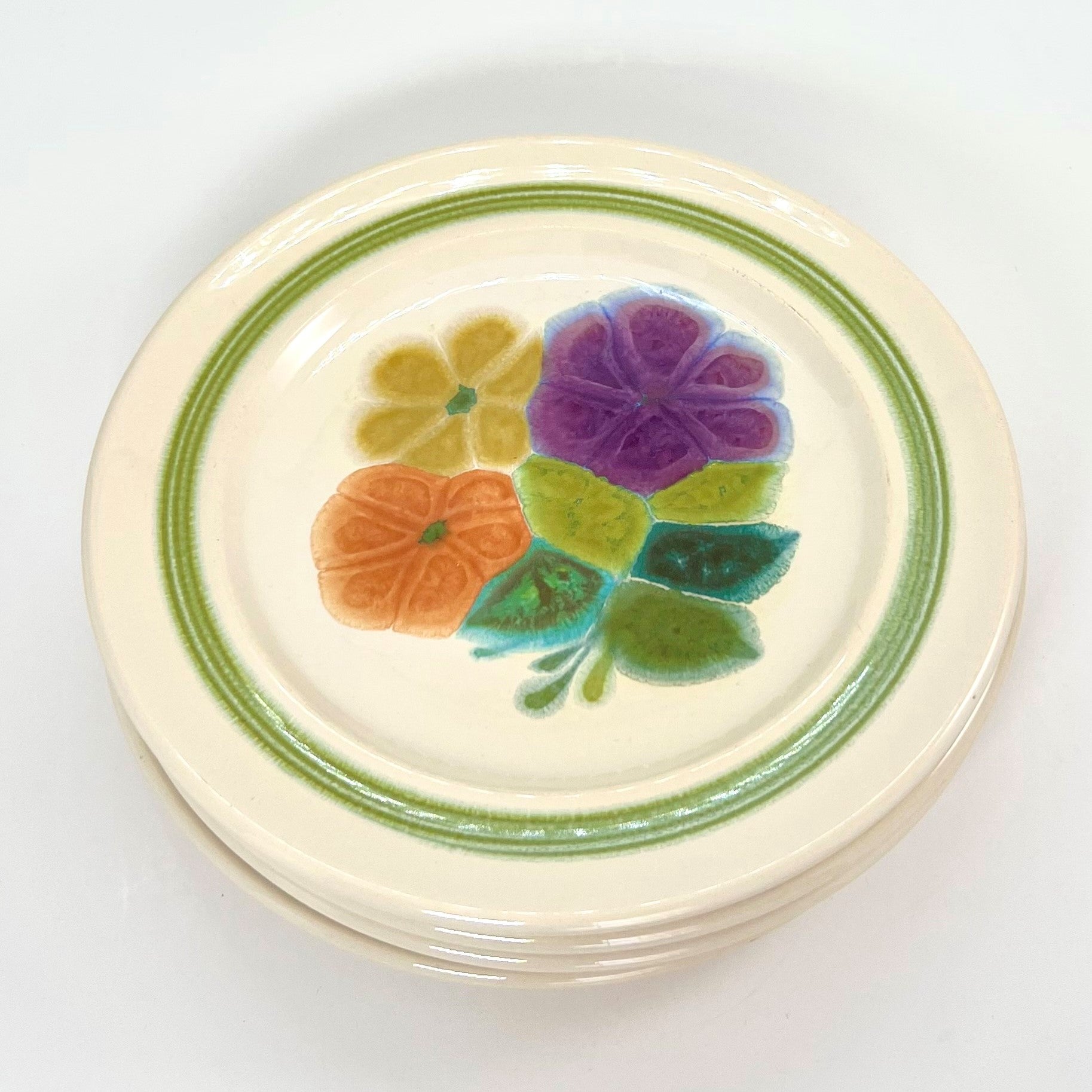 The Floral pattern was one of Franciscan's most popular earthenware lines in the 1970s. Manufacturing of this "flower power" design began in 1971 and continued until 1977. Vibrantly colored flowers in shades of purple, orange, yellow, and pink adorn the centers of the plates, saucers, and bowls with leaves in various shades of green. A jaunty bright green band pops around the edge of the plates and saucers.