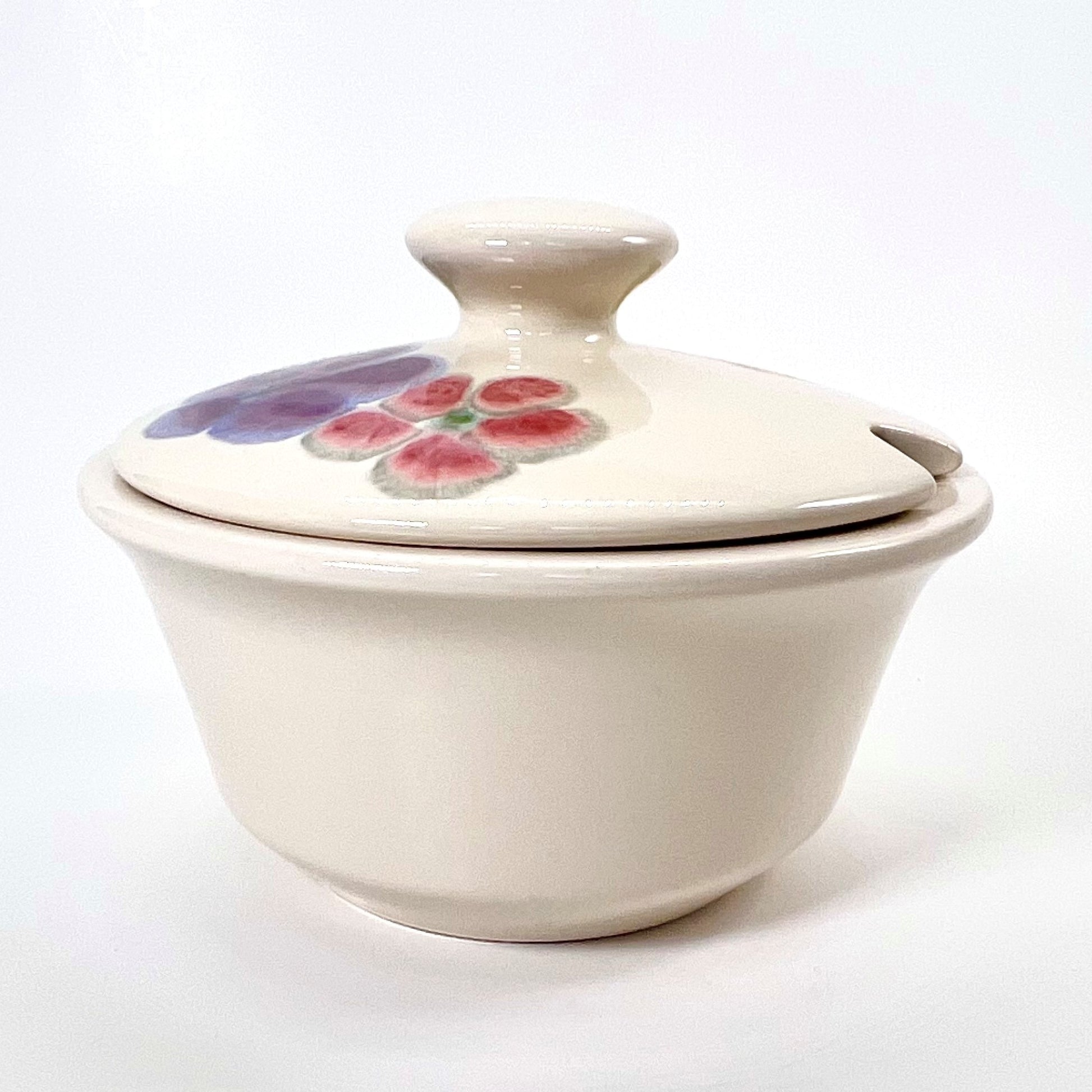 The Floral pattern was one of Franciscan's most popular earthenware lines in the 1970s. Manufacturing of this "flower power" design began in 1971 and continued until 1977. Vibrantly colored flowers in shades of purple, yellow, and pink adorn the lid of the bowl (5 3/4" diameter x 4 1/4" tall). The lid has a spoon opening on one edge. Made in the U.S.A.