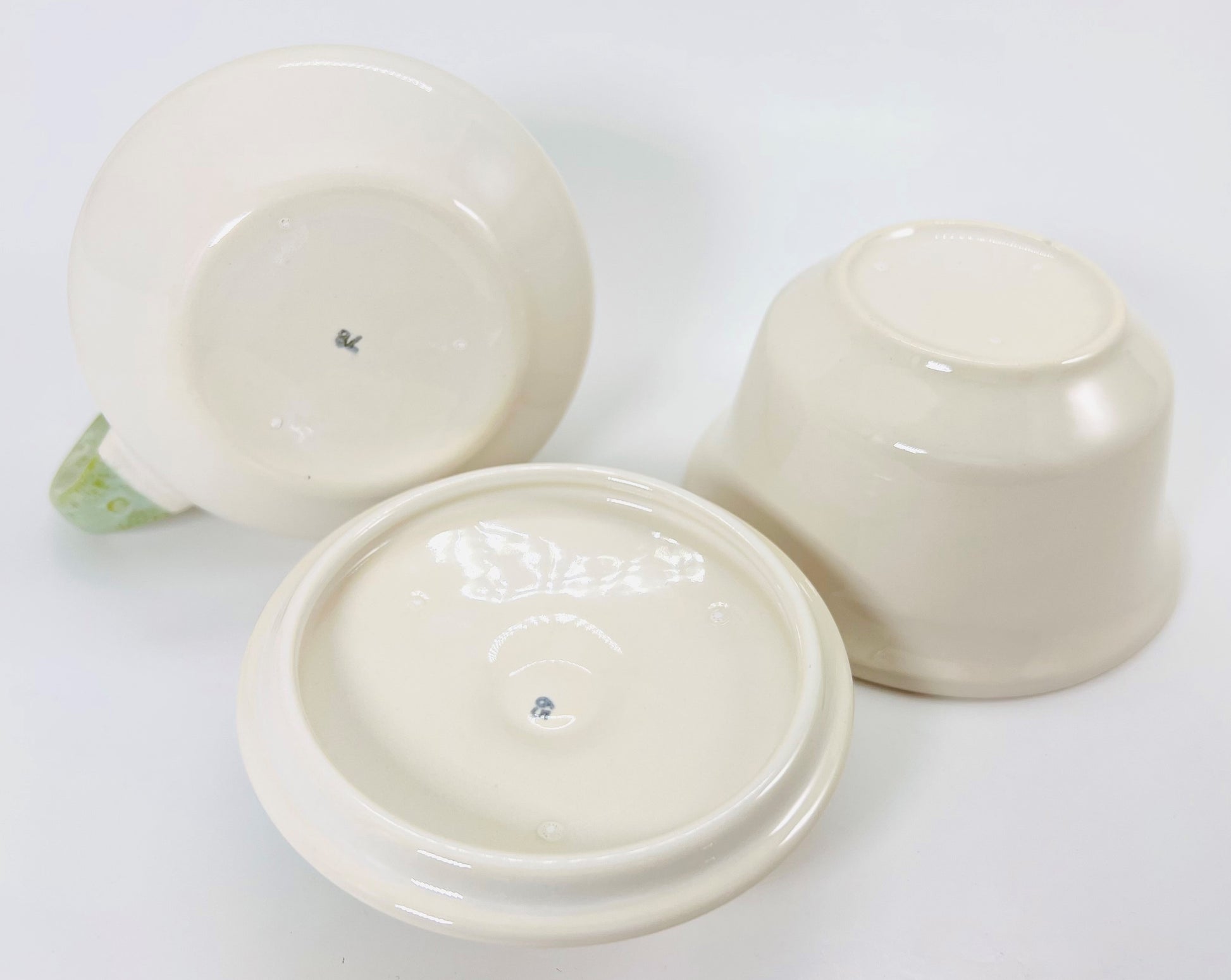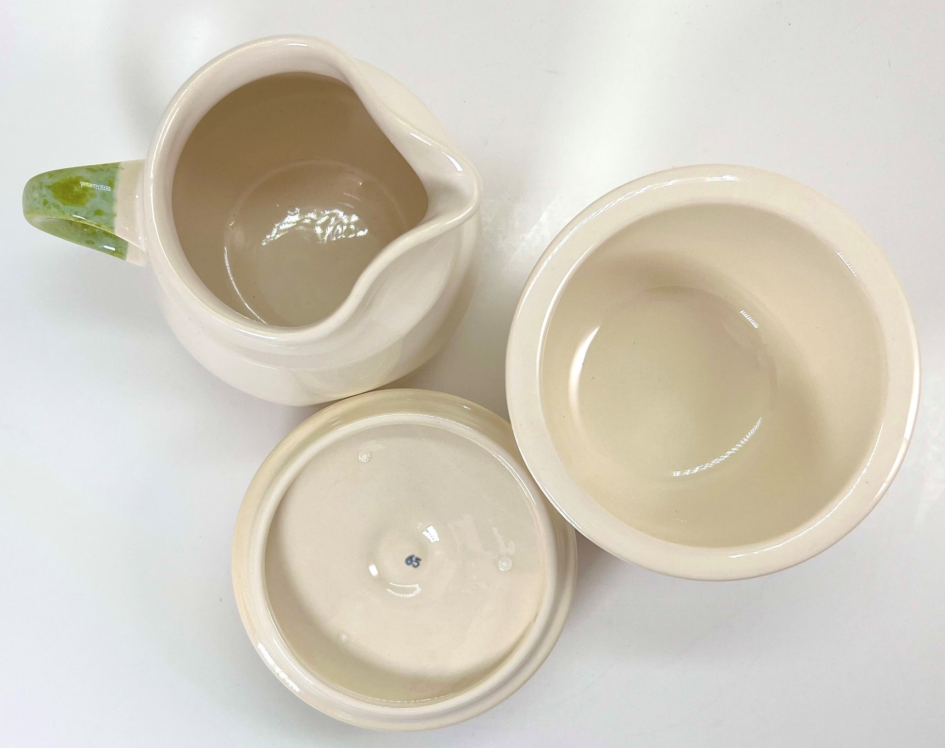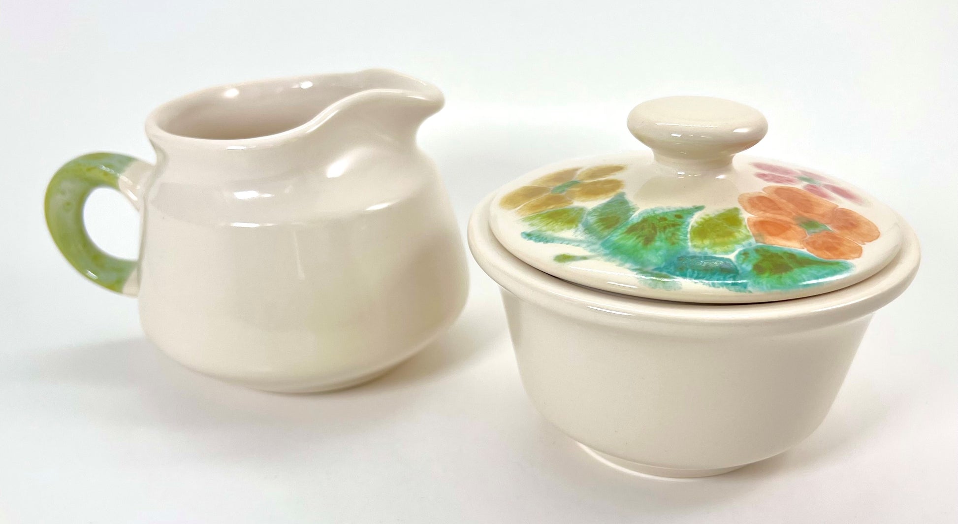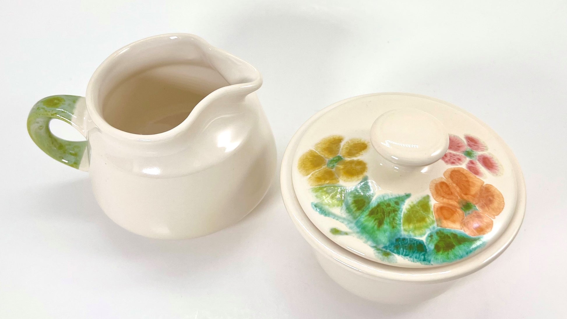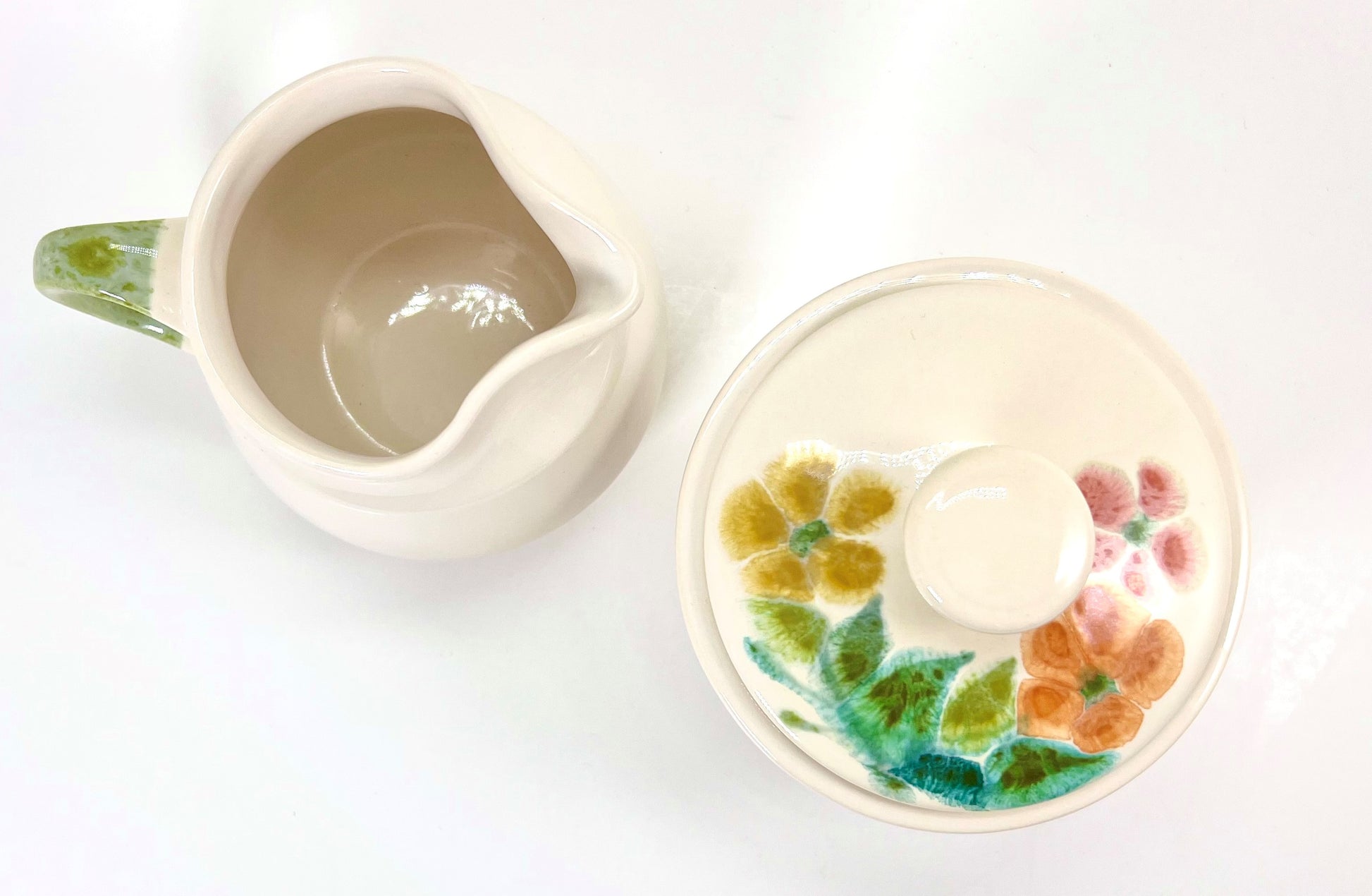 The Floral pattern was one of Franciscan's most popular earthenware lines in the 1970s. Manufacturing of this "flower power" design began in 1971 and continued until 1977. Vibrantly colored flowers in shades of orange, yellow, and pink adorn the lid of the sugar bowl (4 5/8" diameter) while a jaunty bright green handle accents the creamer (3 1/2" tall). Made in the U.S.A.