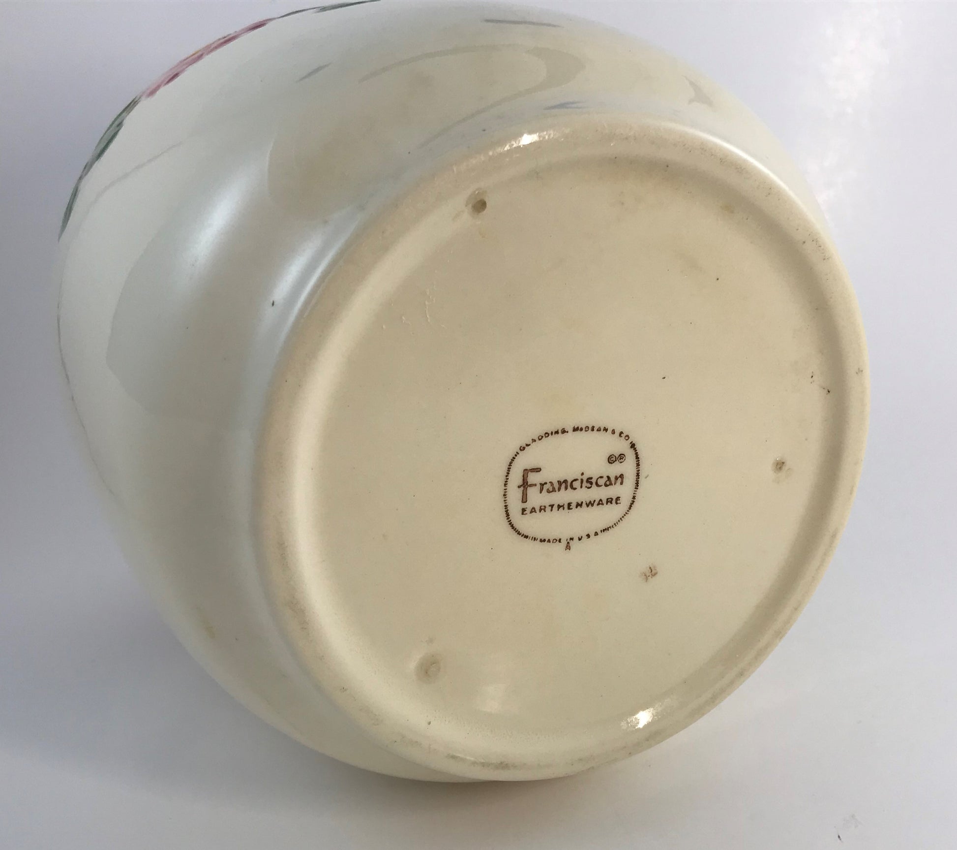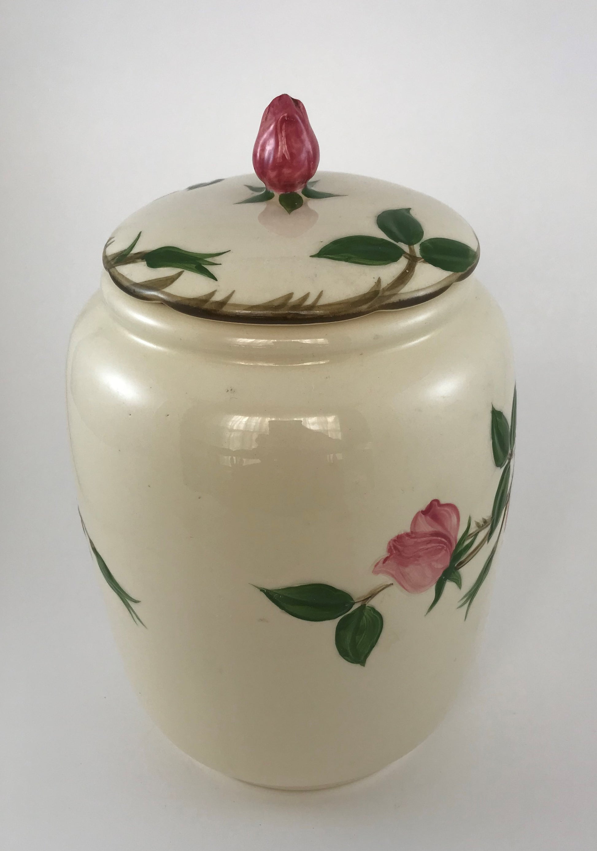 The lovely hand-painted rose motif on this cookie jar is further enhanced by the ceramic rose finial on the lid. Manufactured by Gladding, McBean & Co., Franciscan Earthenware was produced in Southern California through the middle of the 20th century.