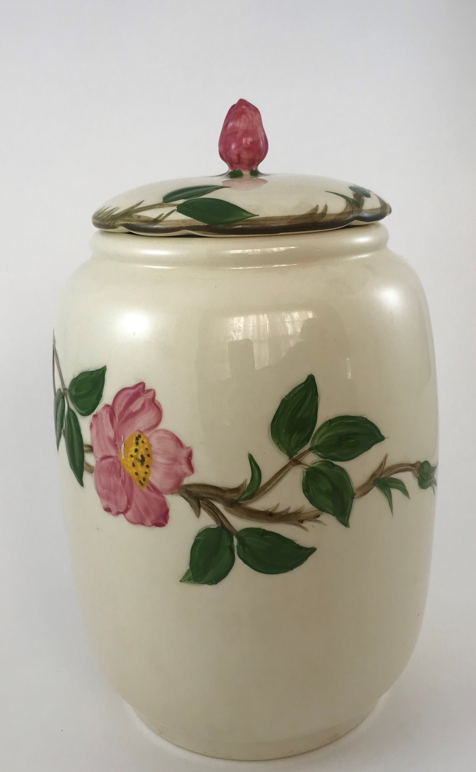 Sweet Franciscan Ware Pink Desert Rose Cookie Jar with Rose Finial.