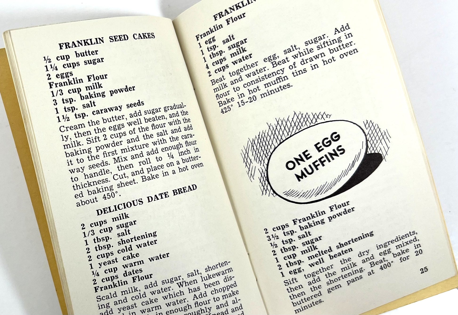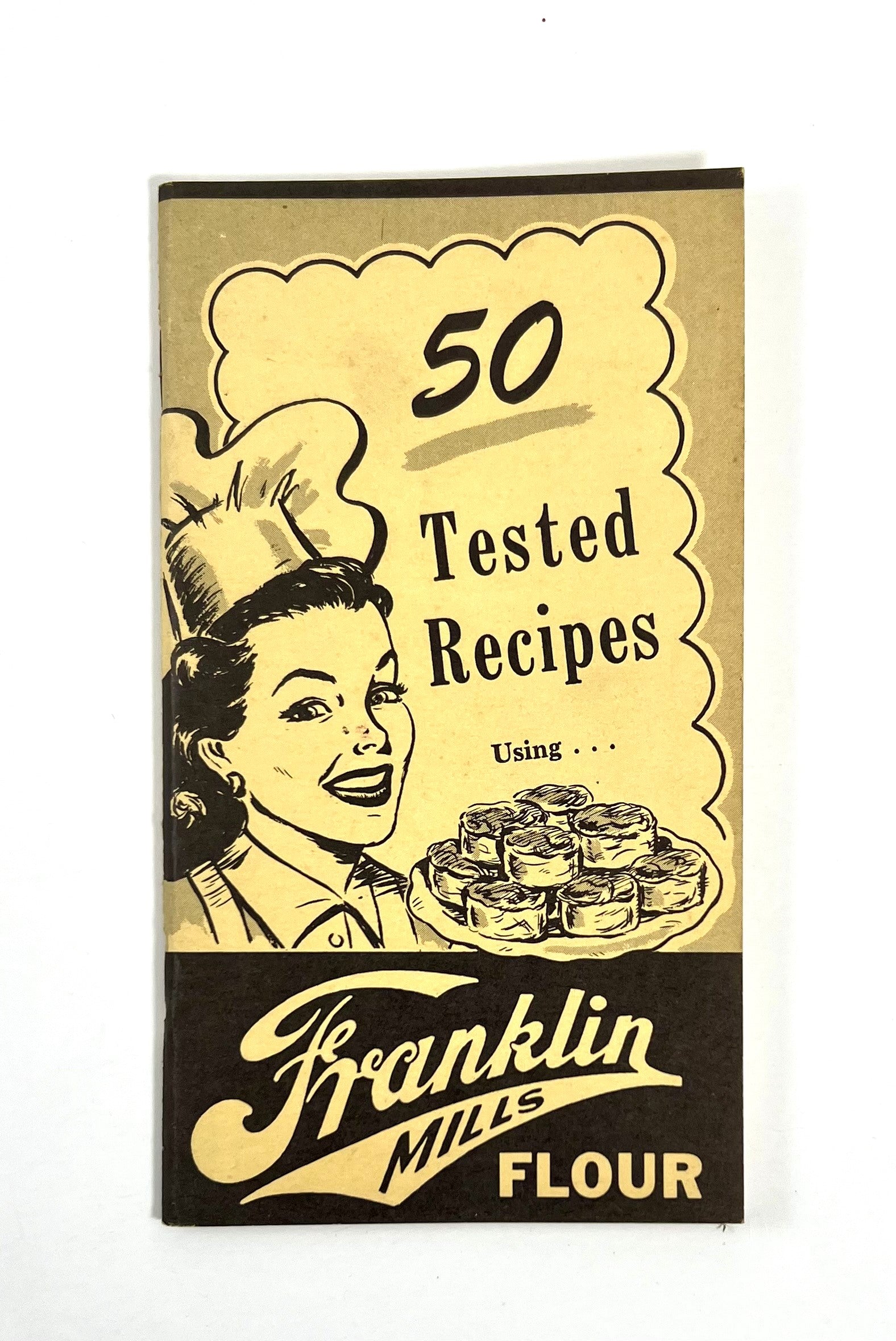 This charming little cookbooklet from the Franklin Mills Co. in Batavia, New York was published in the 1950s as a promotional tool to encourage sales of Franklin Mills Flour. 50 Tested Recipes Using Franklin Mills Flour focuses on baked goods recipes including a number of proprietary recipes like Franklin Date Buns, Franklin Cheese Sticks, Franklin Chocolate Cake, and Franklin Gingerbread, amongst others.