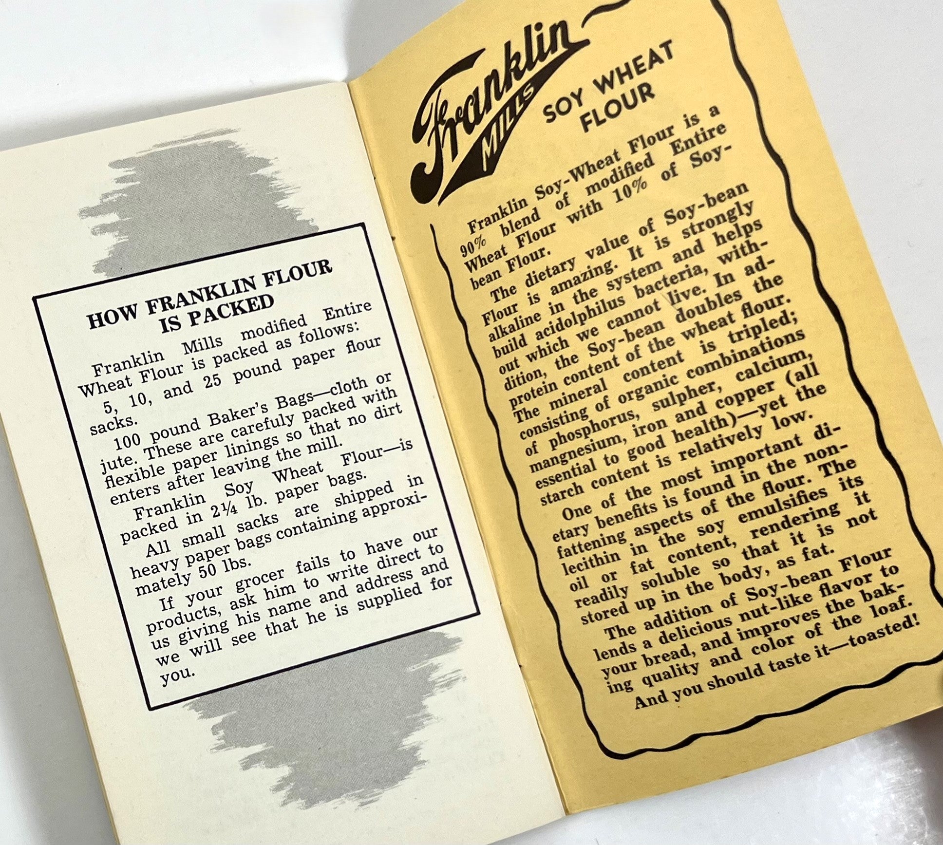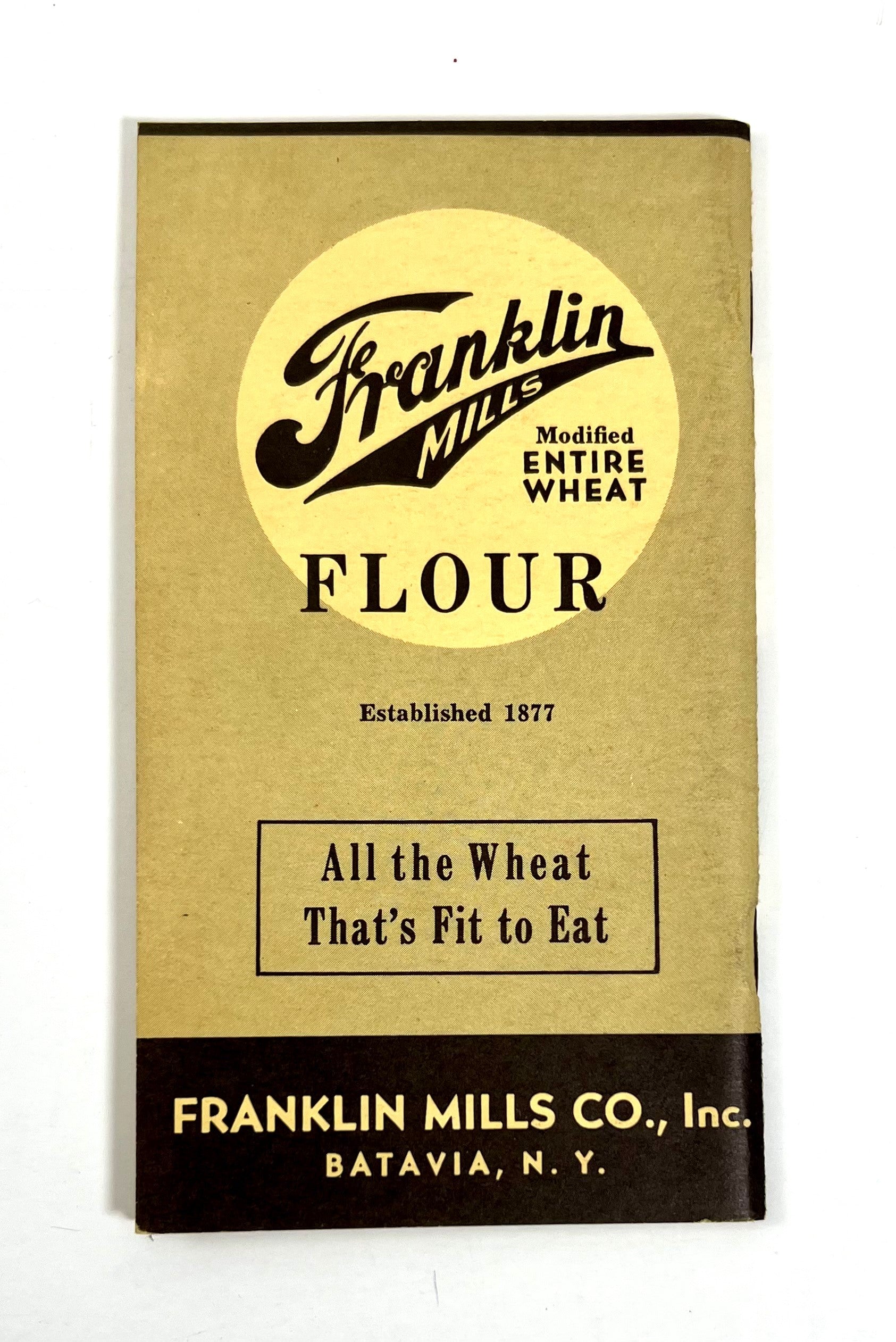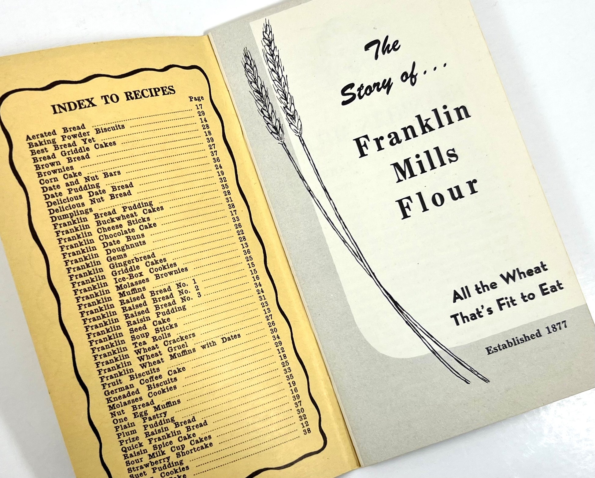 Measuring approximately 6" x 3 1/4" with 40 pages, this gem of a cookbook is wittily subtitled "The Story of Franklin Mills Flour, All the Wheat That's Fit to Eat".