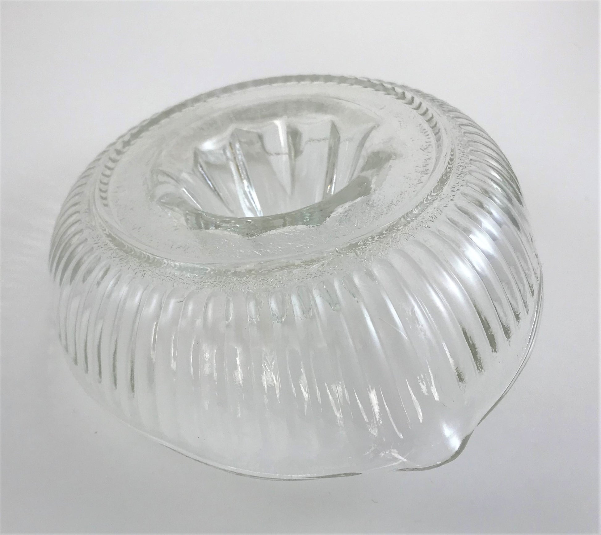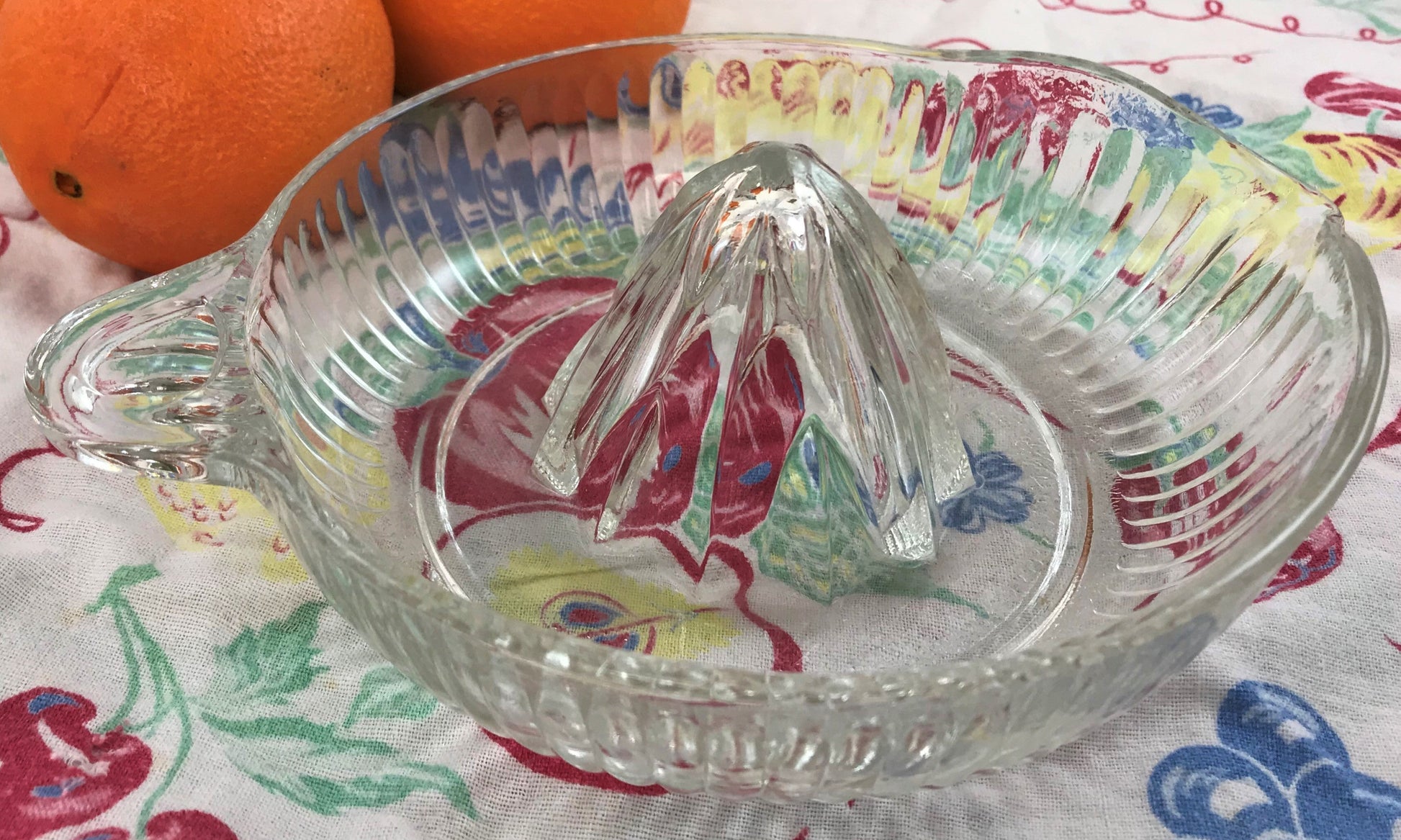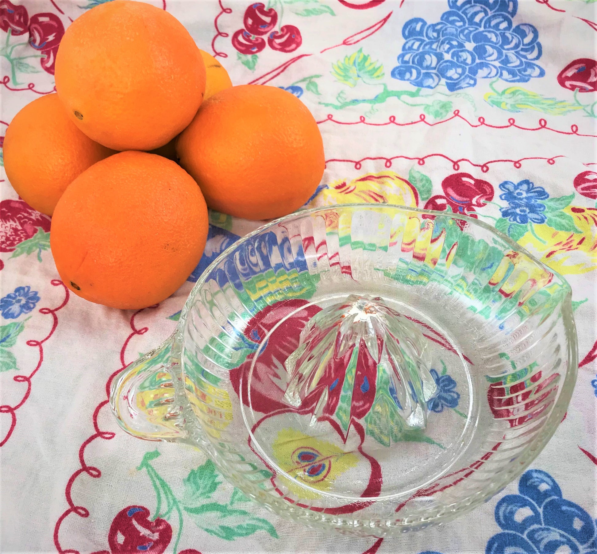 Through most of the 20th century, a juicer like this could be found in most every kitchen. Ranging in size and material - glass, ceramic, and plastic, which came later in the century - a juicer was an absolute necessary for making orange juice and squeezing other citrus like lemons and limes for cooking and baking. How much more elegant and joyful to use a lovely glass juicer instead of plastic? And, how much more delicious is fresh-squeezed than store bought?