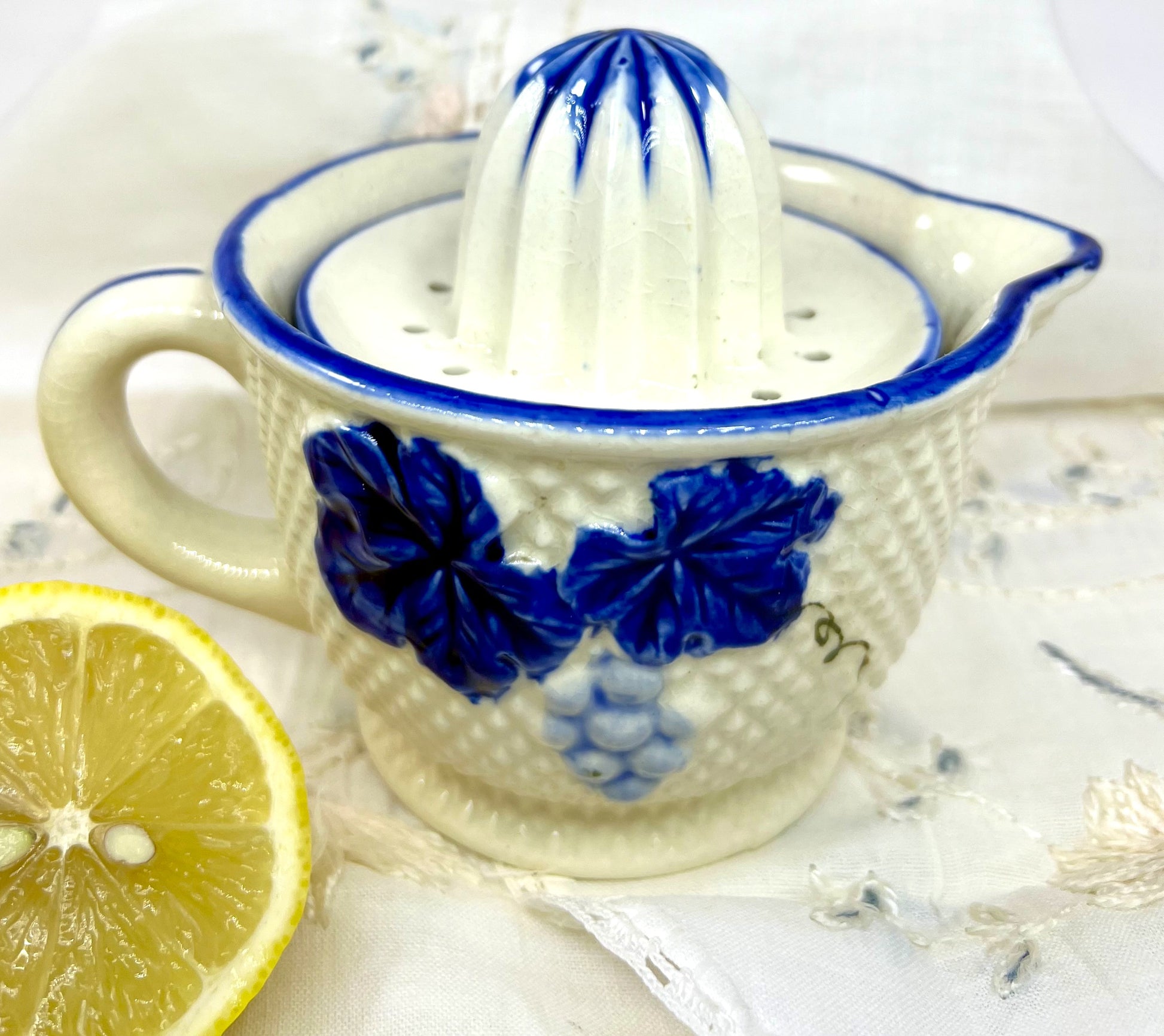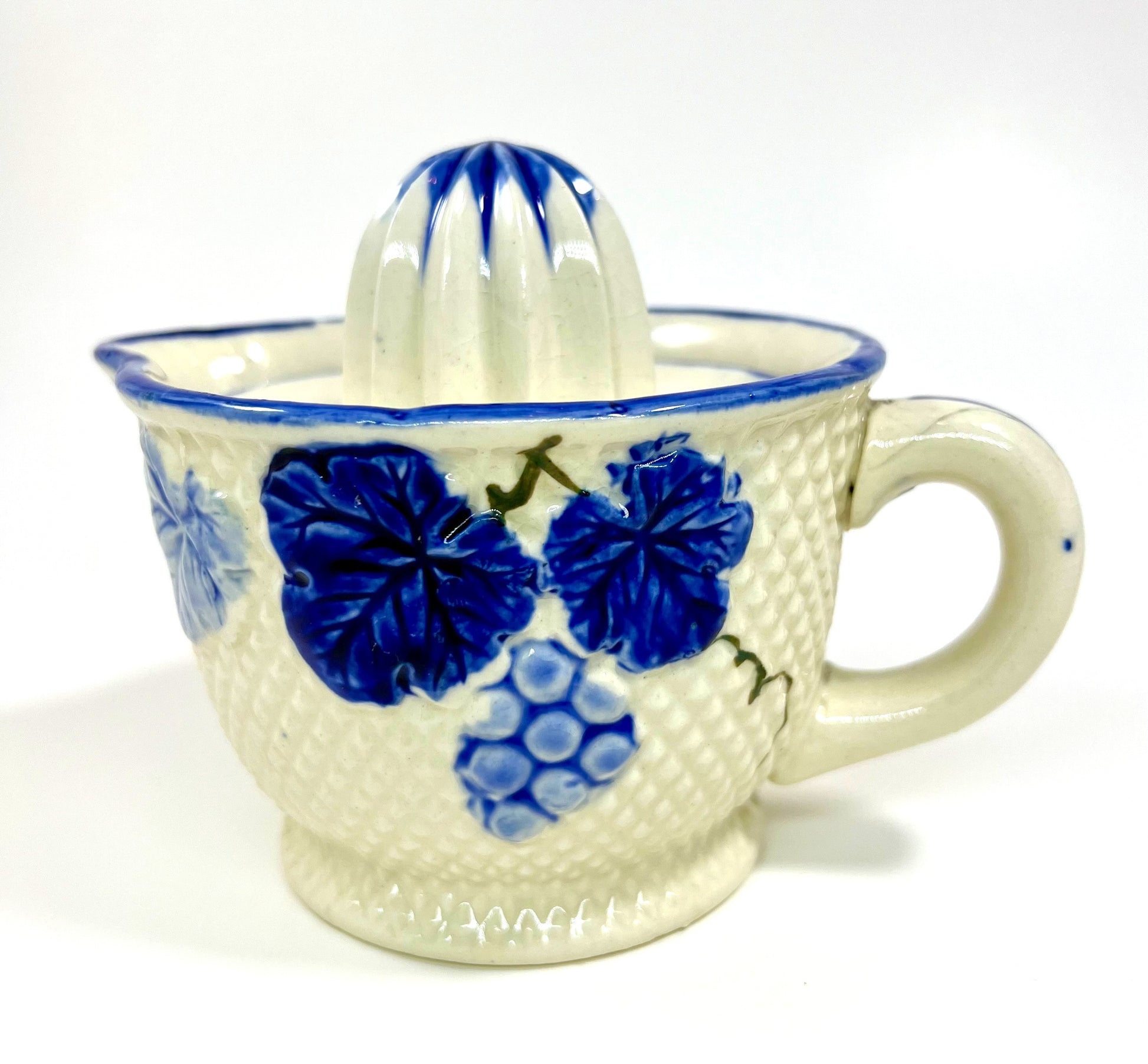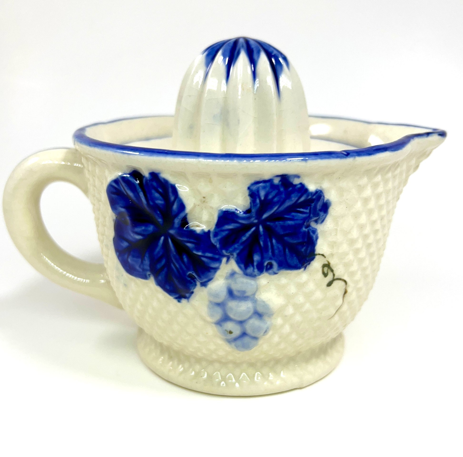 This lovely reamer (aka juicer) with pitcher was designed and manufactured during the prewar years in Japan. Likely dating to the late-1920s/early 1930s, this piece would make the perfect addition to a blue and white kitchen with its grapevine pattern and blue accents.