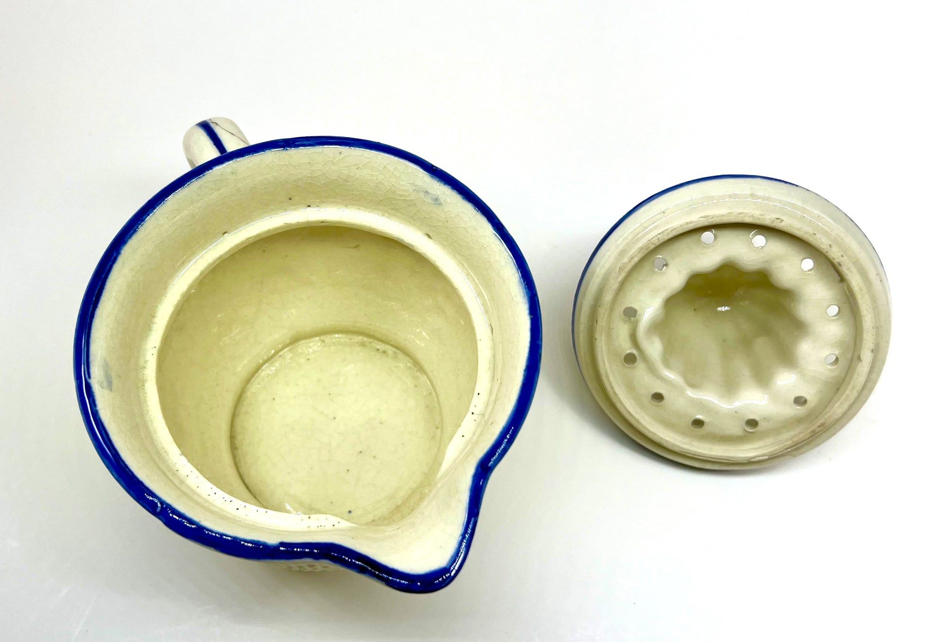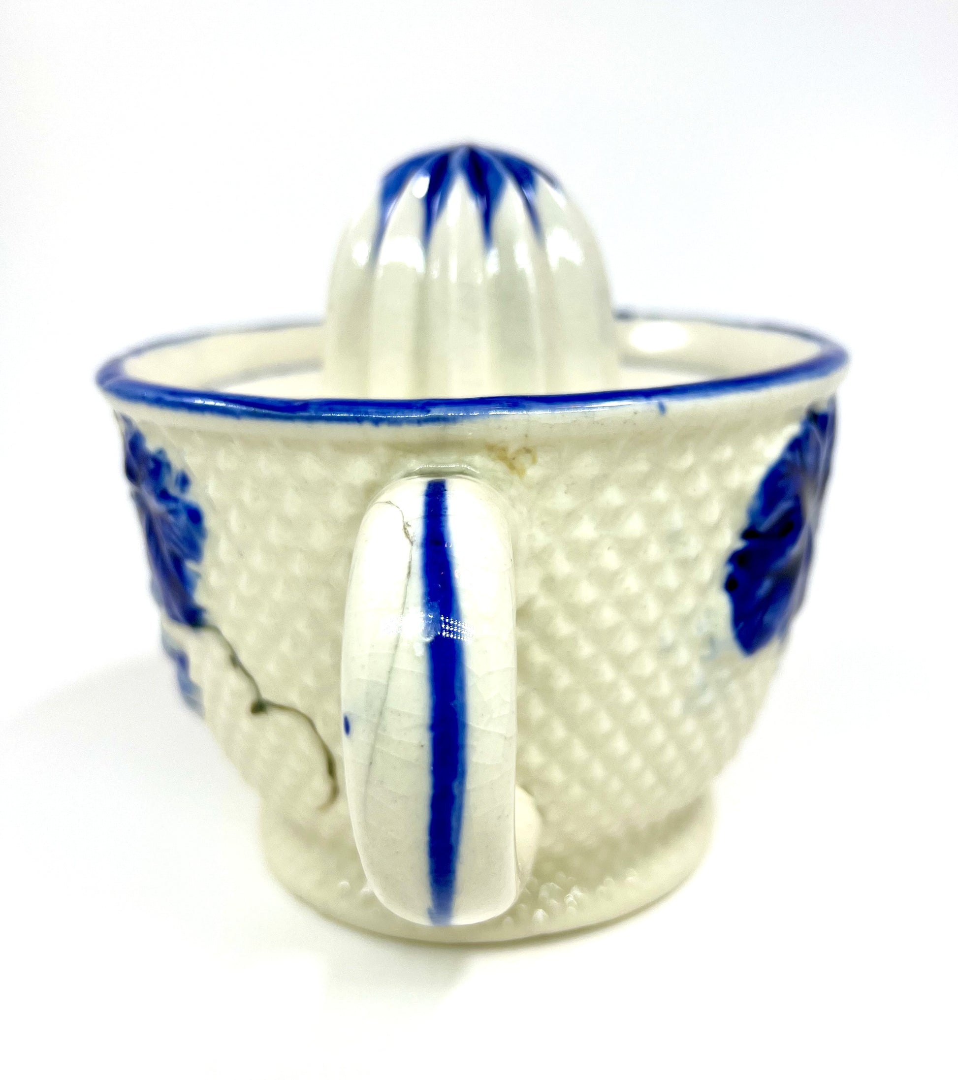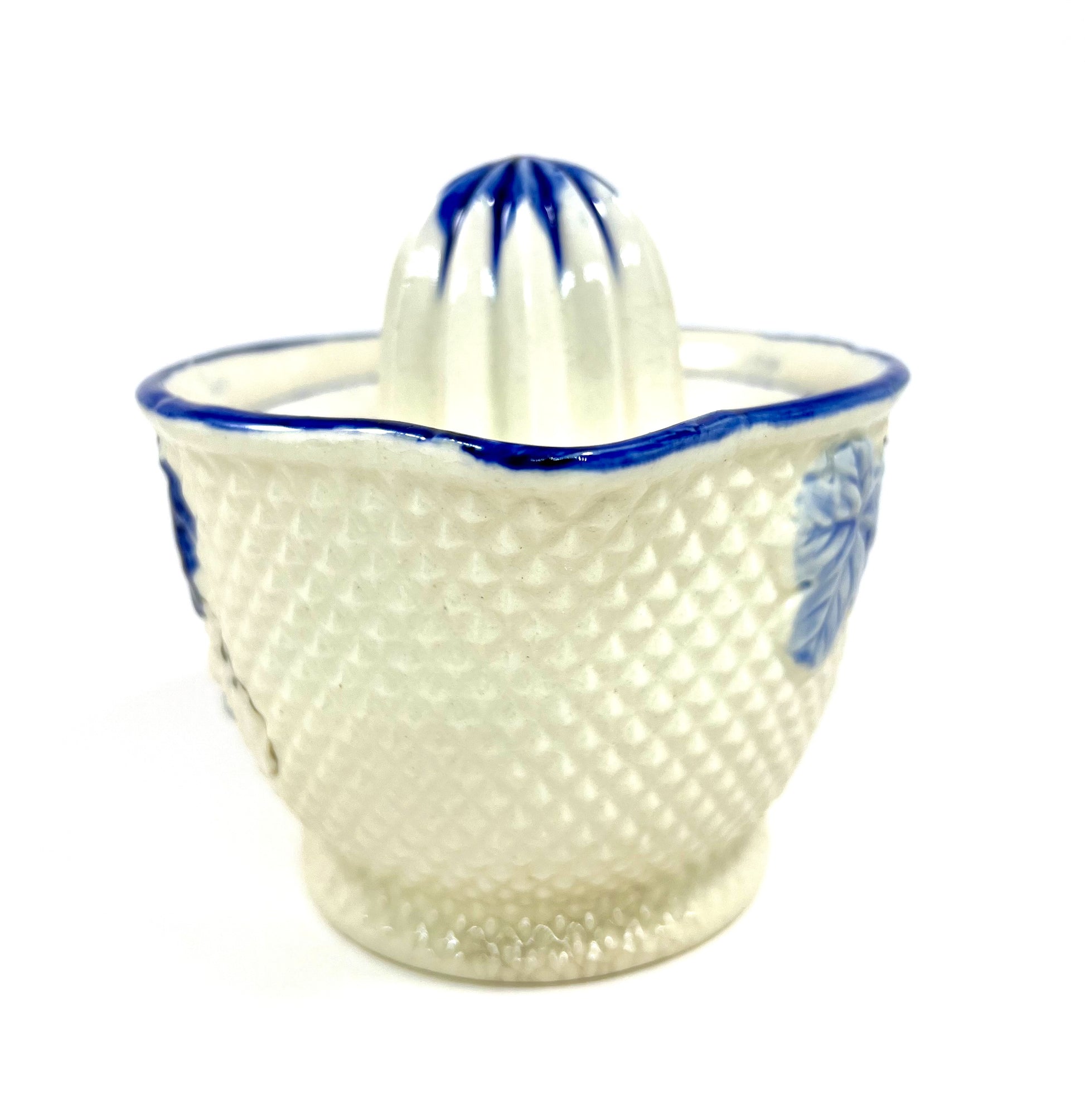 This lovely reamer (aka juicer) with pitcher was designed and manufactured during the prewar years in Japan. Likely dating to the late-1920s/early 1930s, this piece would make the perfect addition to a blue and white kitchen with its grapevine pattern and blue accents.