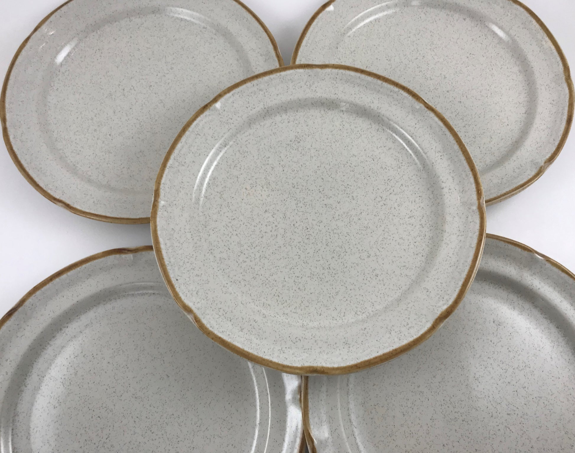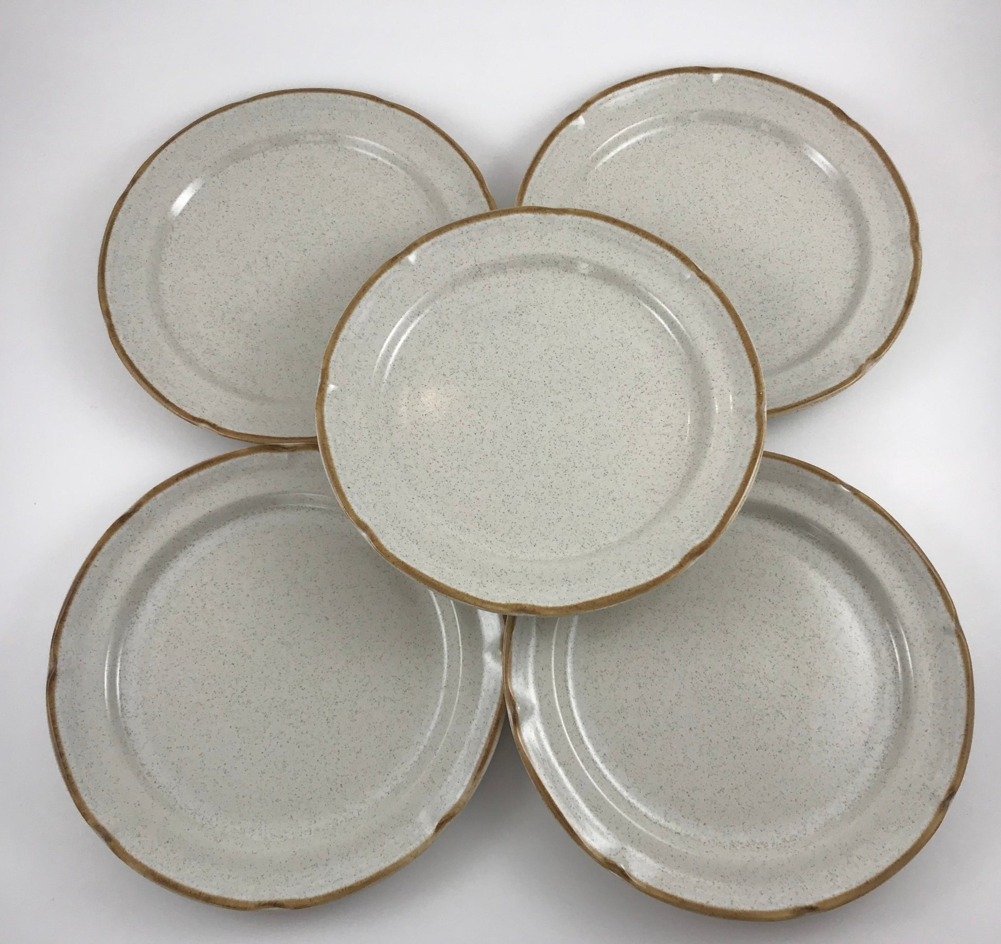 Beige speckled stoneware with brown rim trim. Made in Japan.