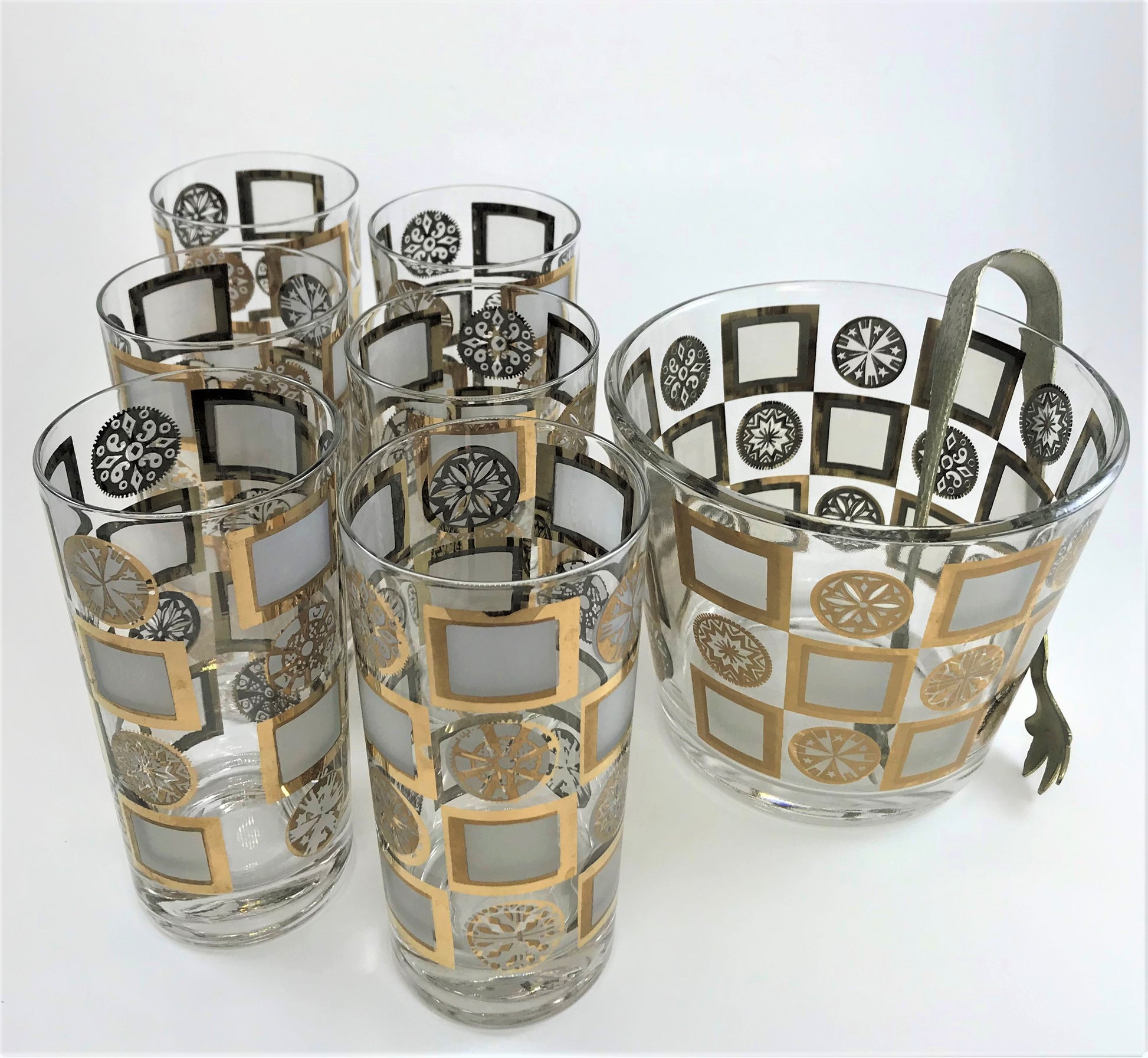 Gorgeous mid-century bar set with six highball glasses and a matching ice bucket with tongs.