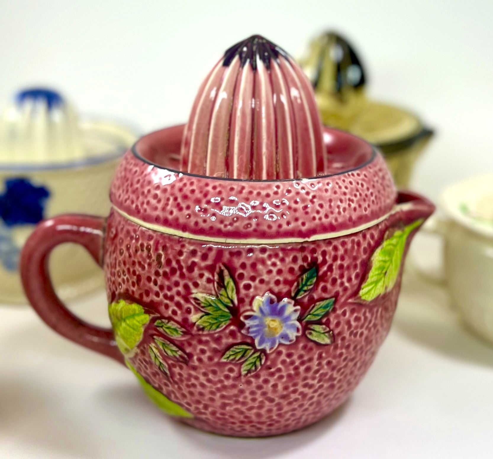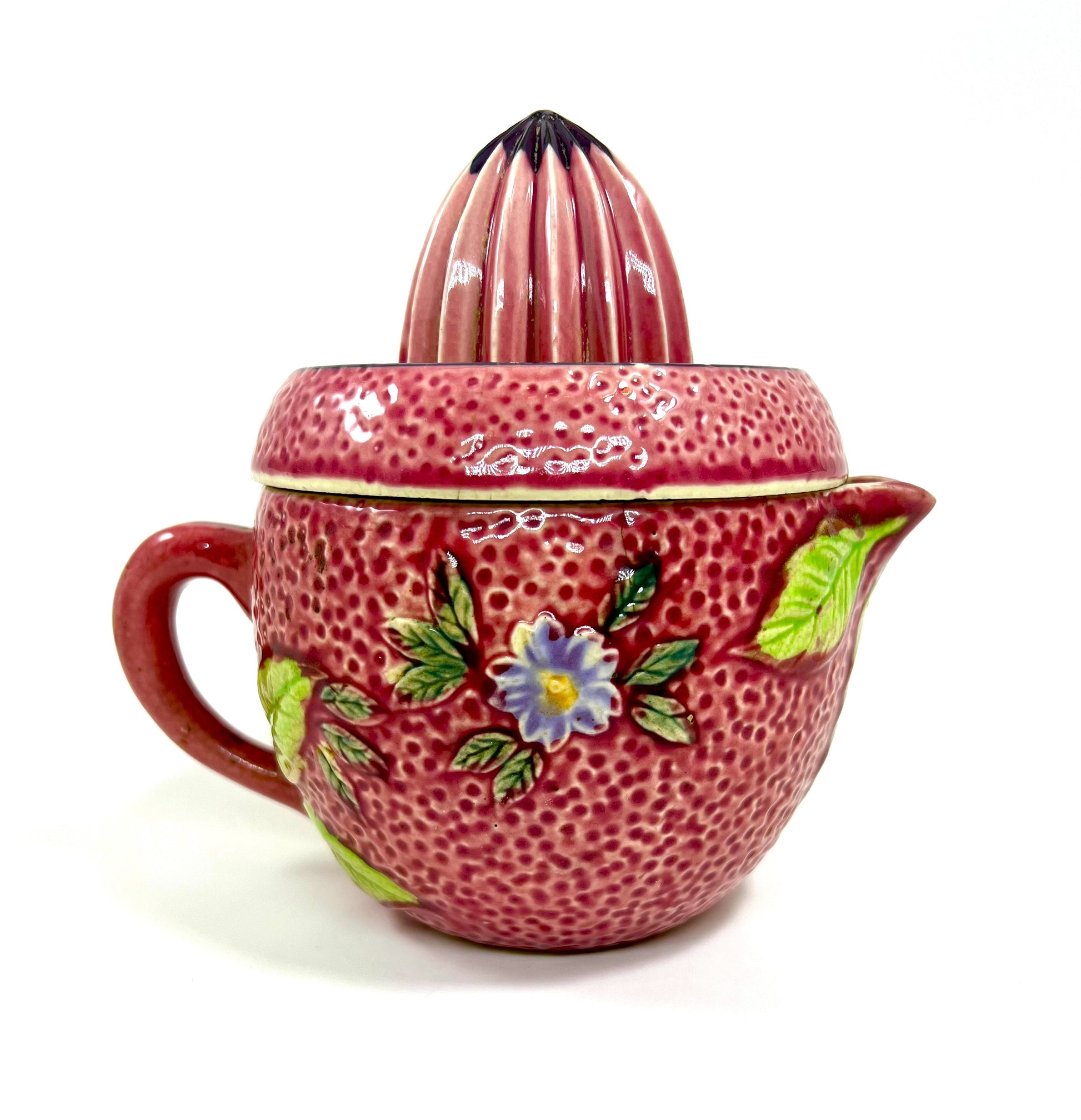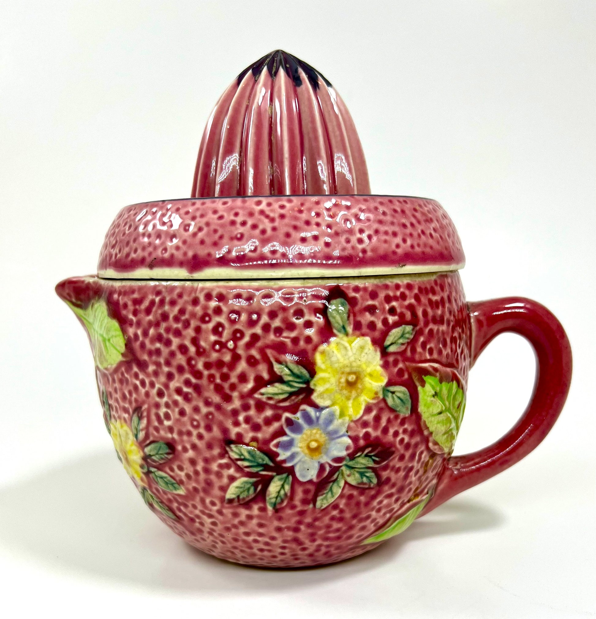 This lovely reamer (aka juicer) with pitcher was designed by the Hotta Yu company during the prewar years in Japan. Likely dating to the late-1920s/early 1930s, this piece is particularly striking given its beautiful pinkish reddish background covered in a floral pattern with leaves.