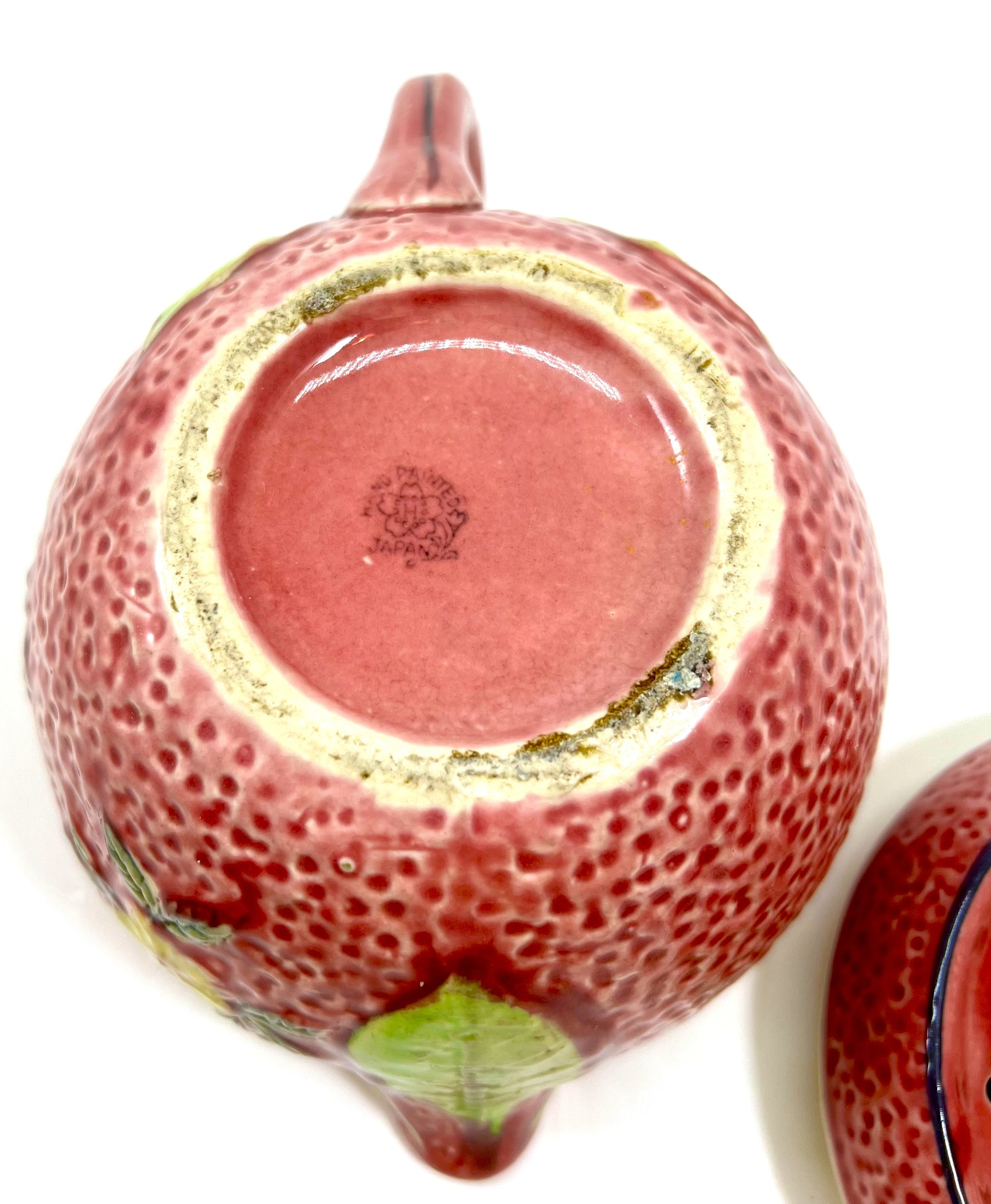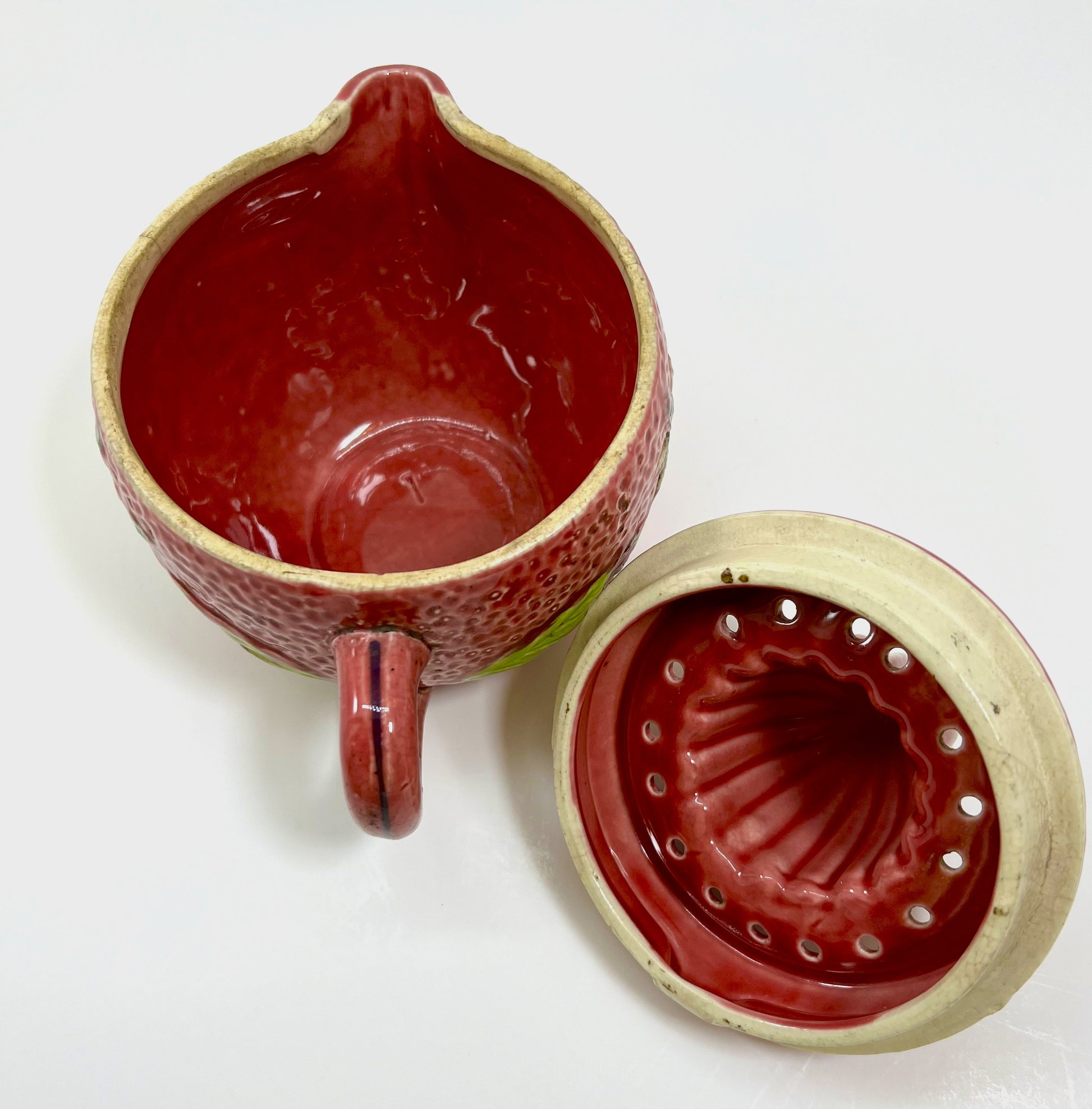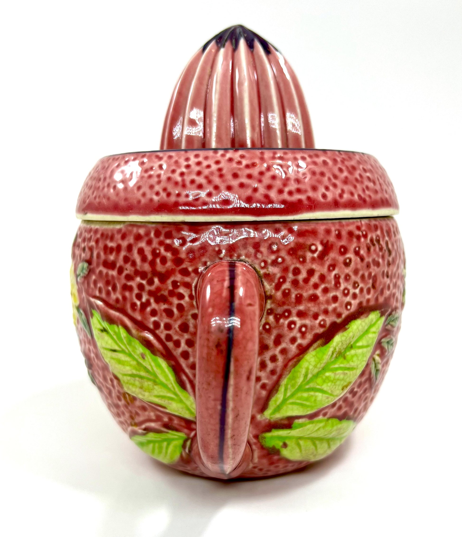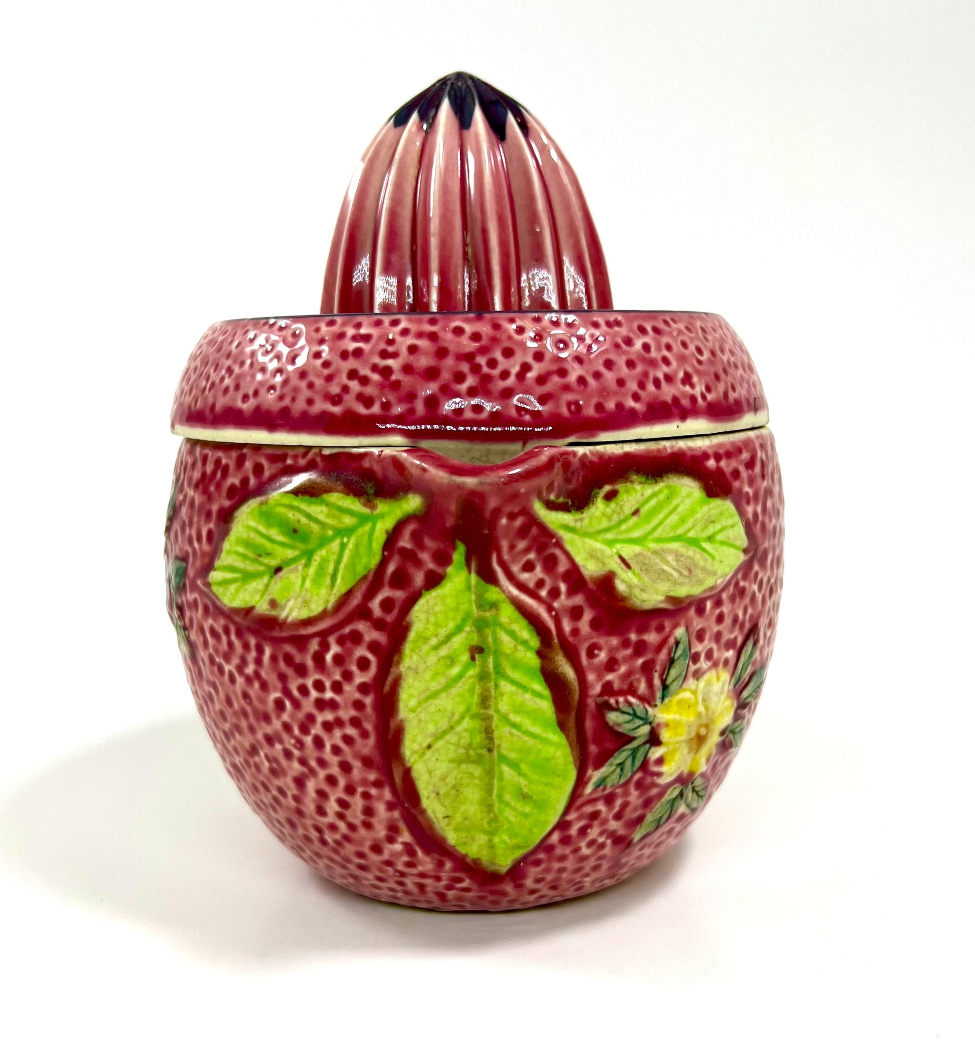 This lovely reamer (aka juicer) with pitcher was designed by the Hotta Yu company during the prewar years in Japan. Likely dating to the late-1920s/early 1930s, this piece is particularly striking given its beautiful pinkish reddish background covered in a floral pattern with leaves.
