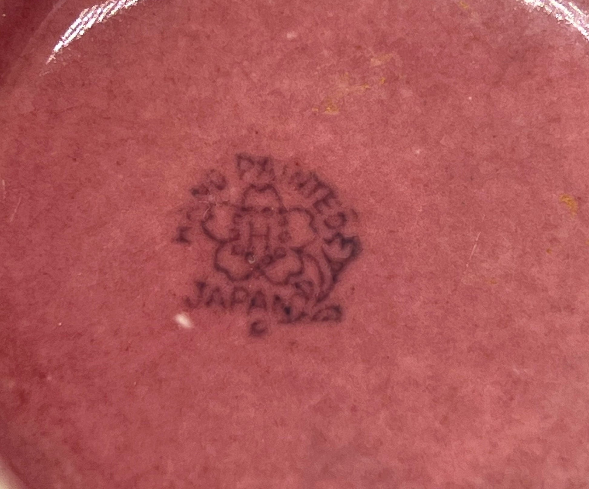 Although inexpensively mass produced, Japanese ceramics of the time were hand painted as indicated in the stamp on the bottom of the pitcher. The "H" inside the cherry blossom flower is the mark of the Hotta Yu company.