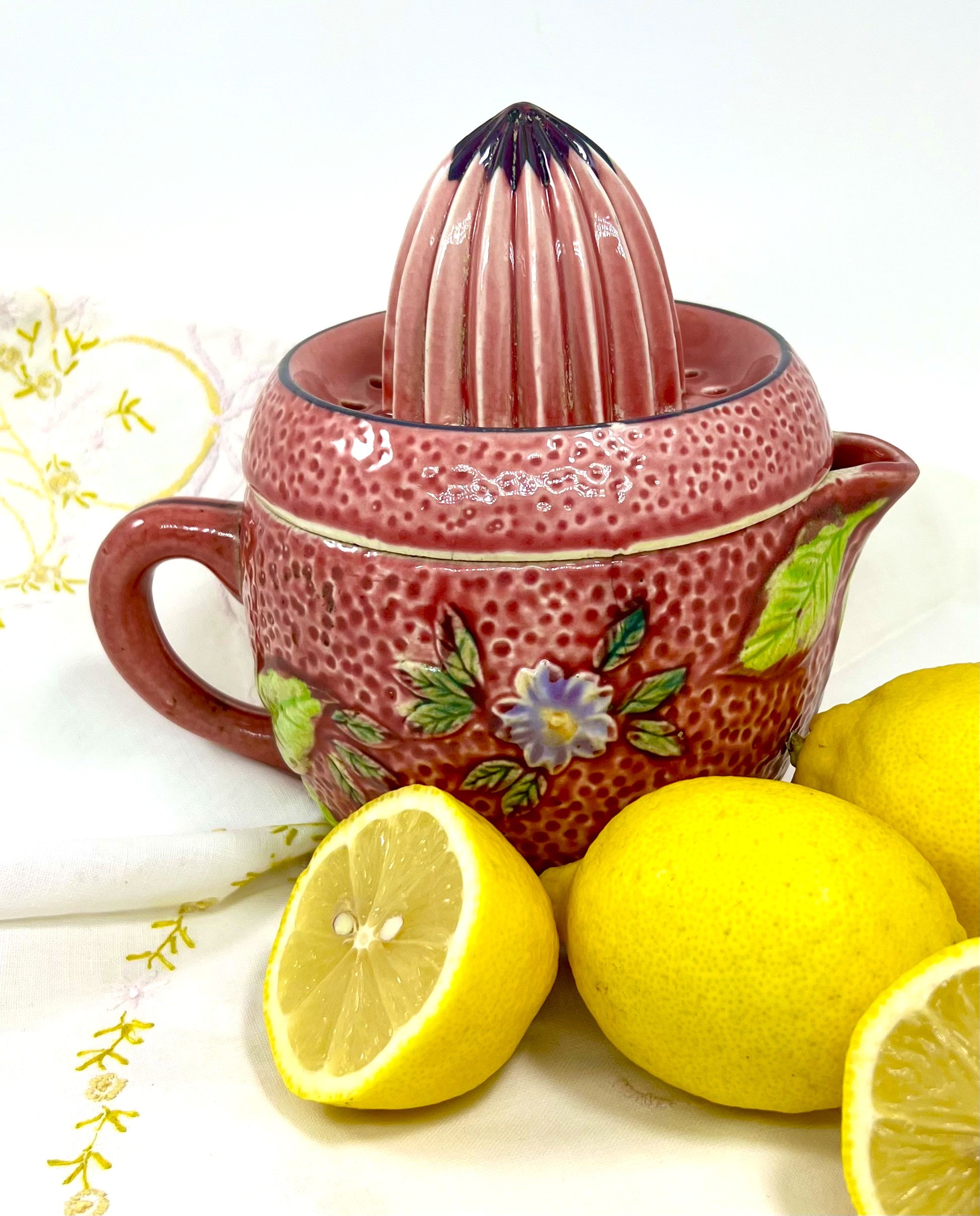 This charming reamer and pitcher is larger than most, measuring approximately 7" tall x 7" from spout to handle, and was most likely used for juicing oranges or grapefruits. The clever design allows for the fruit to be cut in half and then placed over the reamer. Squeezing and turning the fruit around the reamer releases the juices for collection in the pitcher below. The juice can then be brought to the table for serving or used in the kitchen as needed.