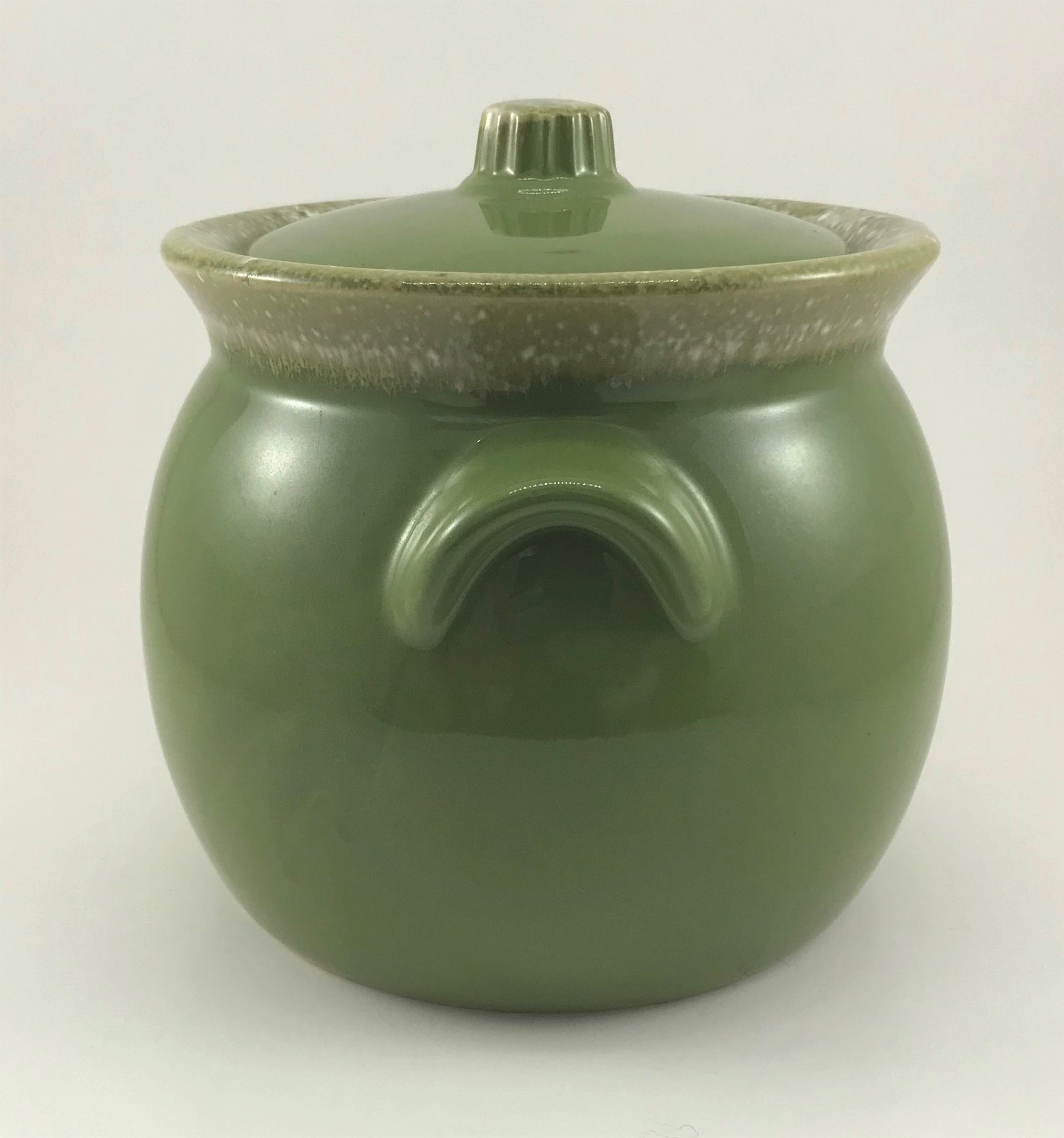 This vibrant green cookie jar dates to the 1950s and is sometimes also referred to as a bean pot since it is oven-proof as marked on the bottom. Measuring approximately 6 1/2" tall x 7 1/2" wide from handle to handle, this mid-century gem could be used for either purpose, or as a soup or stew tureen.