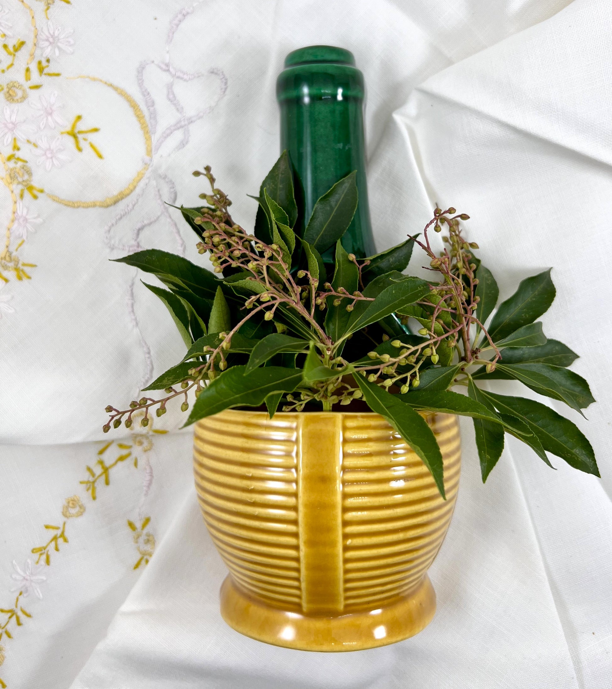 Charming ceramic wall pocket in the shape of a Italian wickered wine bottle.