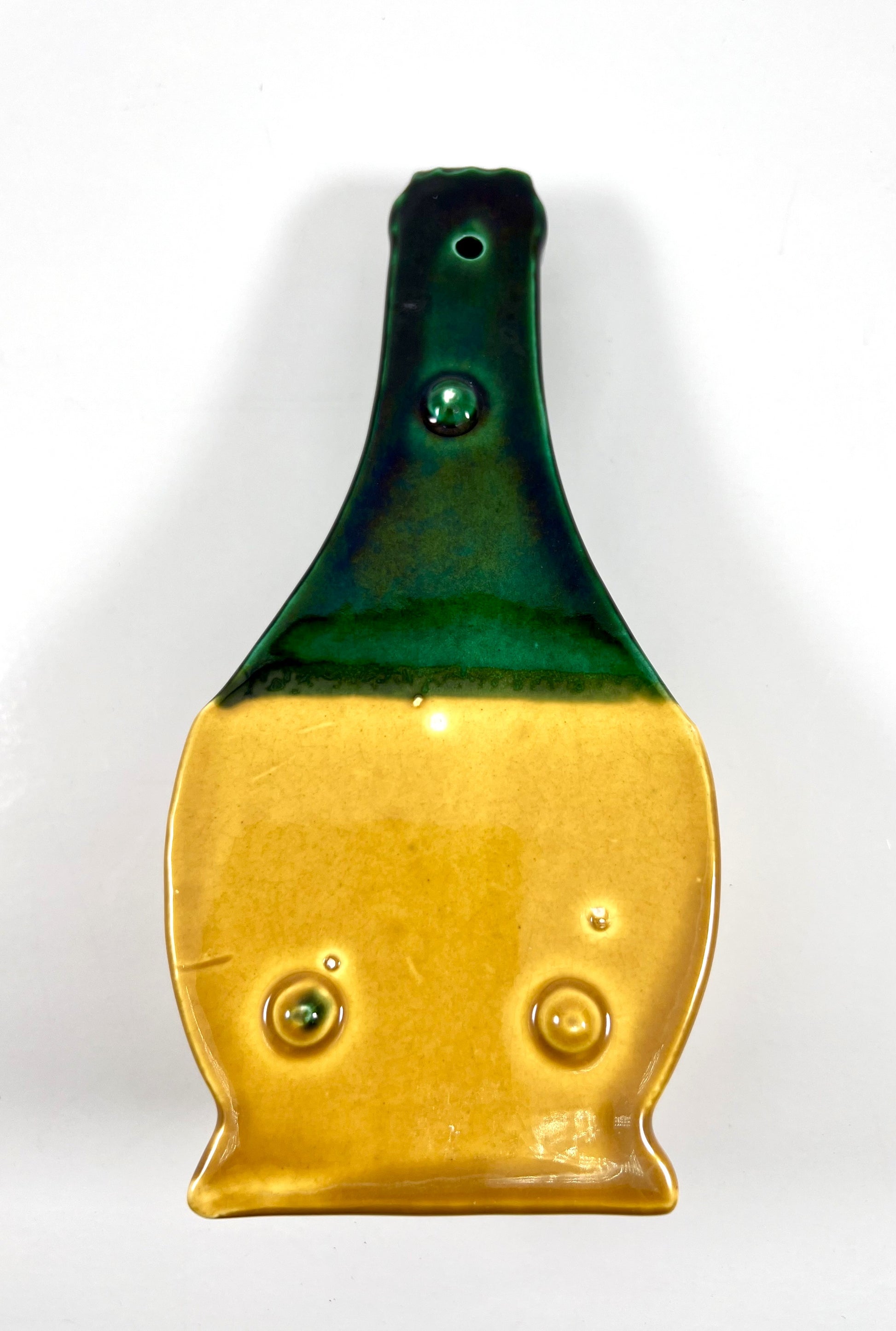 Glazed with classic mid-century colors, this wall pocket measures approximately 8"tall x 3 3/4" wide x 2 1/4" from front to back. There is a small fine crack in the glaze as shown in close-up photo.