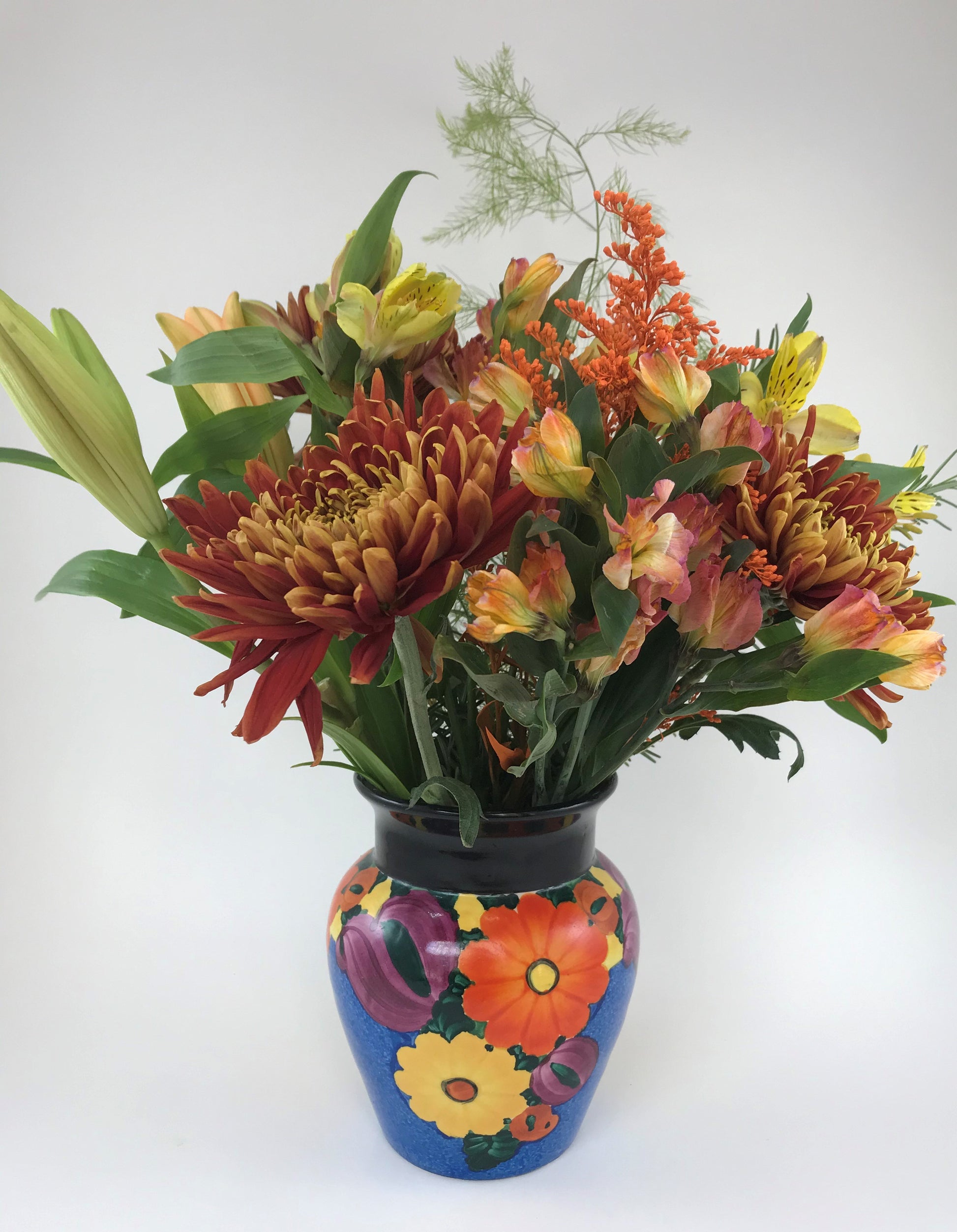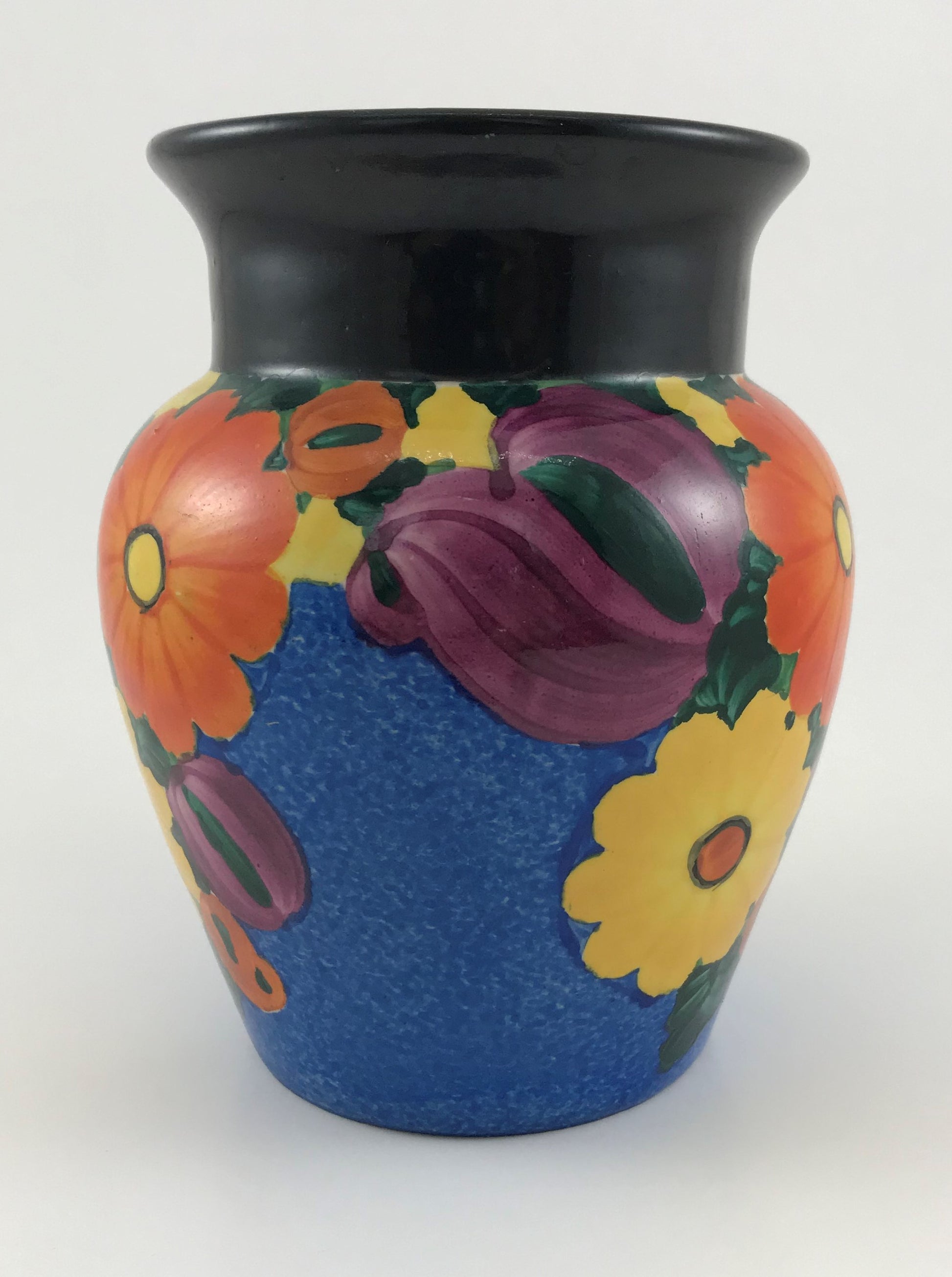 This vibrantly lovely Peasant Art Industries floral vase was made in 1920s Czechoslovakia and imported to the United States by Joseph Mrazek.