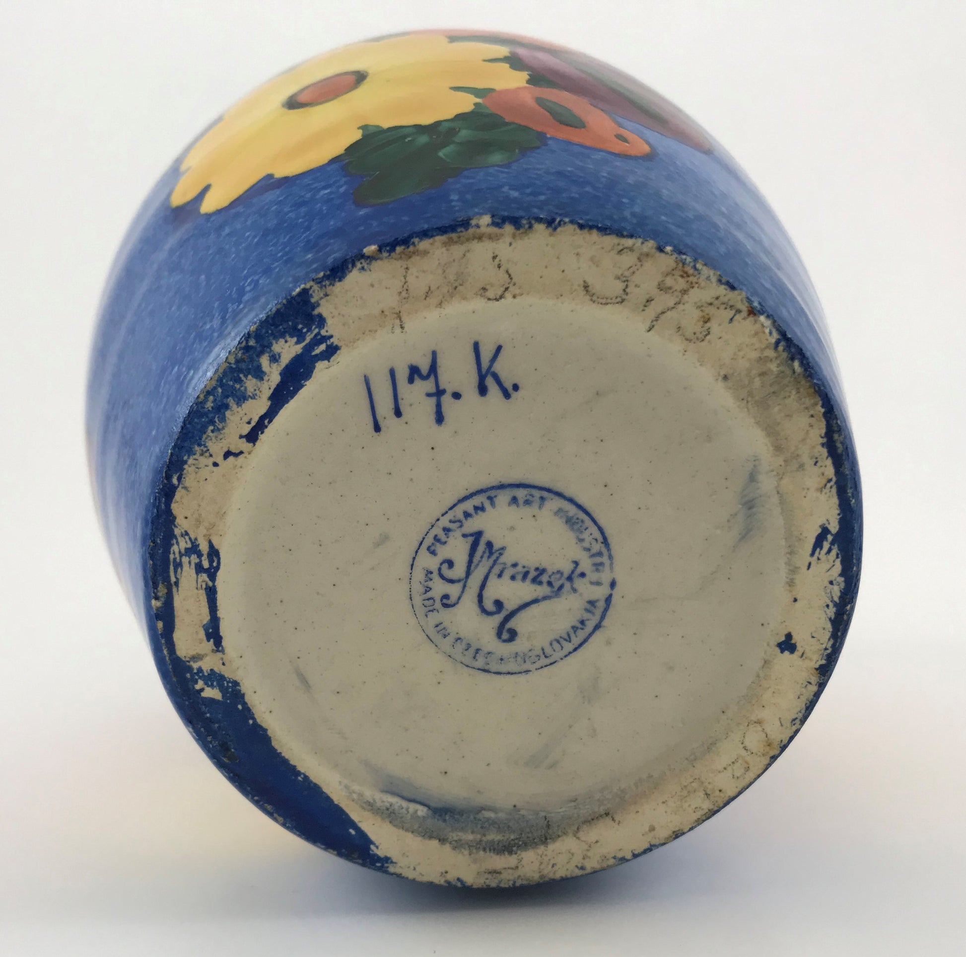 J. Mrazek Czechoslovakian Pottery Vase Floral, Peasant Art, 1920s, Blue