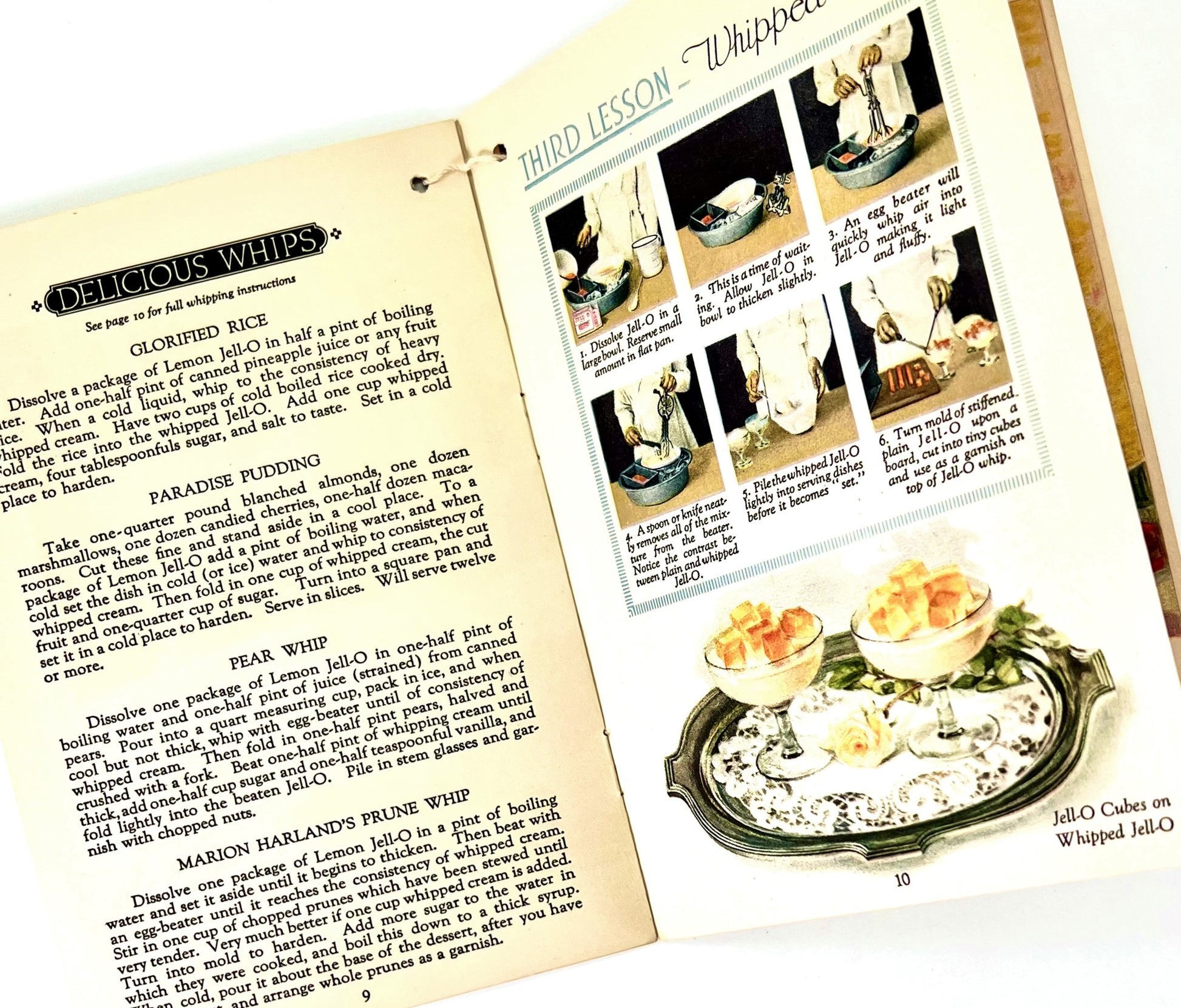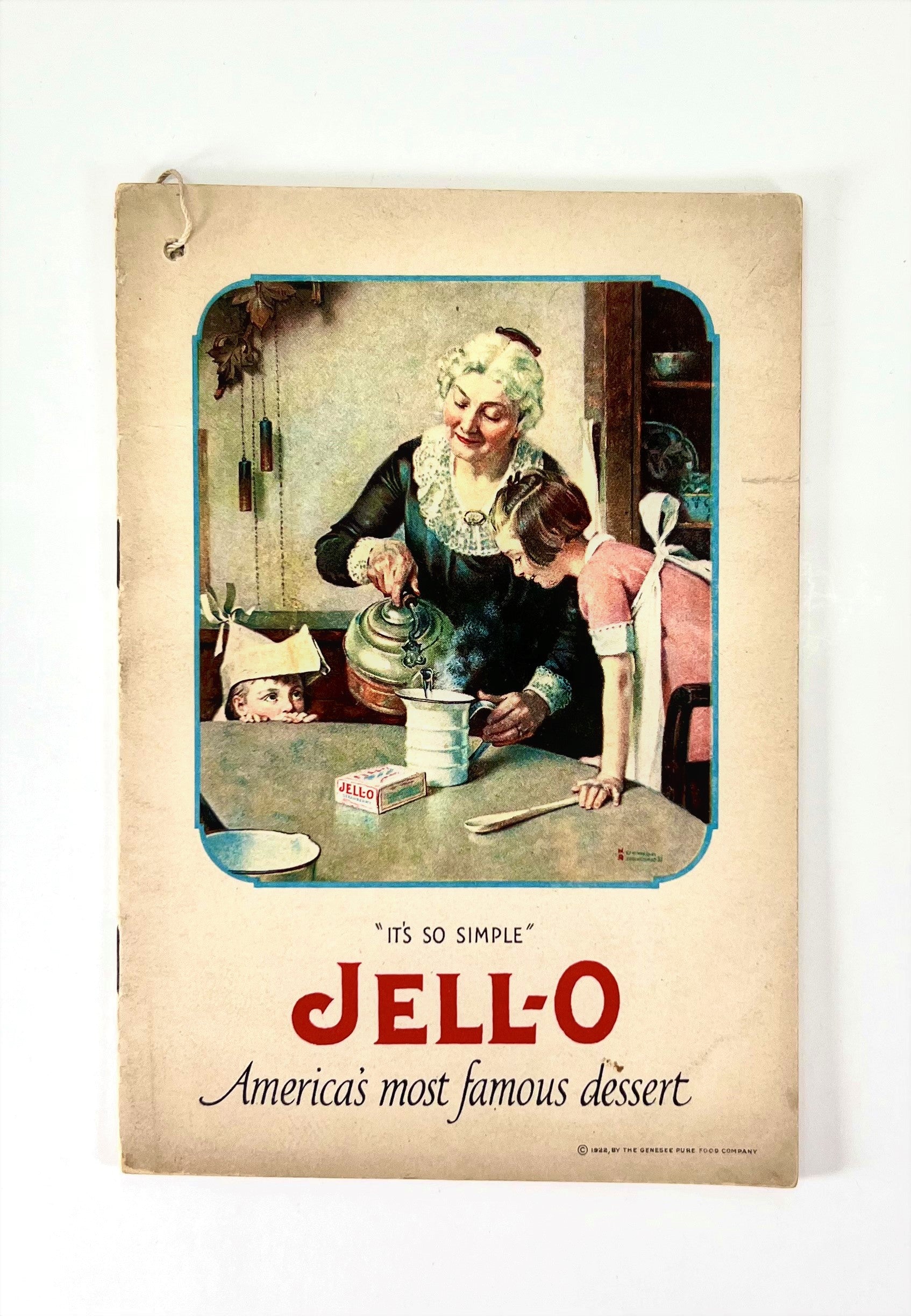 This charming little cookbooklet, measuring approximately 6 1/8" x 4 1/4" with 14 pages and string-attached ice cream insert, was published in 1922 to promote the simplicity of making a Jell-O recipe. The special added bonus is the insert, which promotes Jell-O Ice Cream Powder, a little-know product from Jell-O.