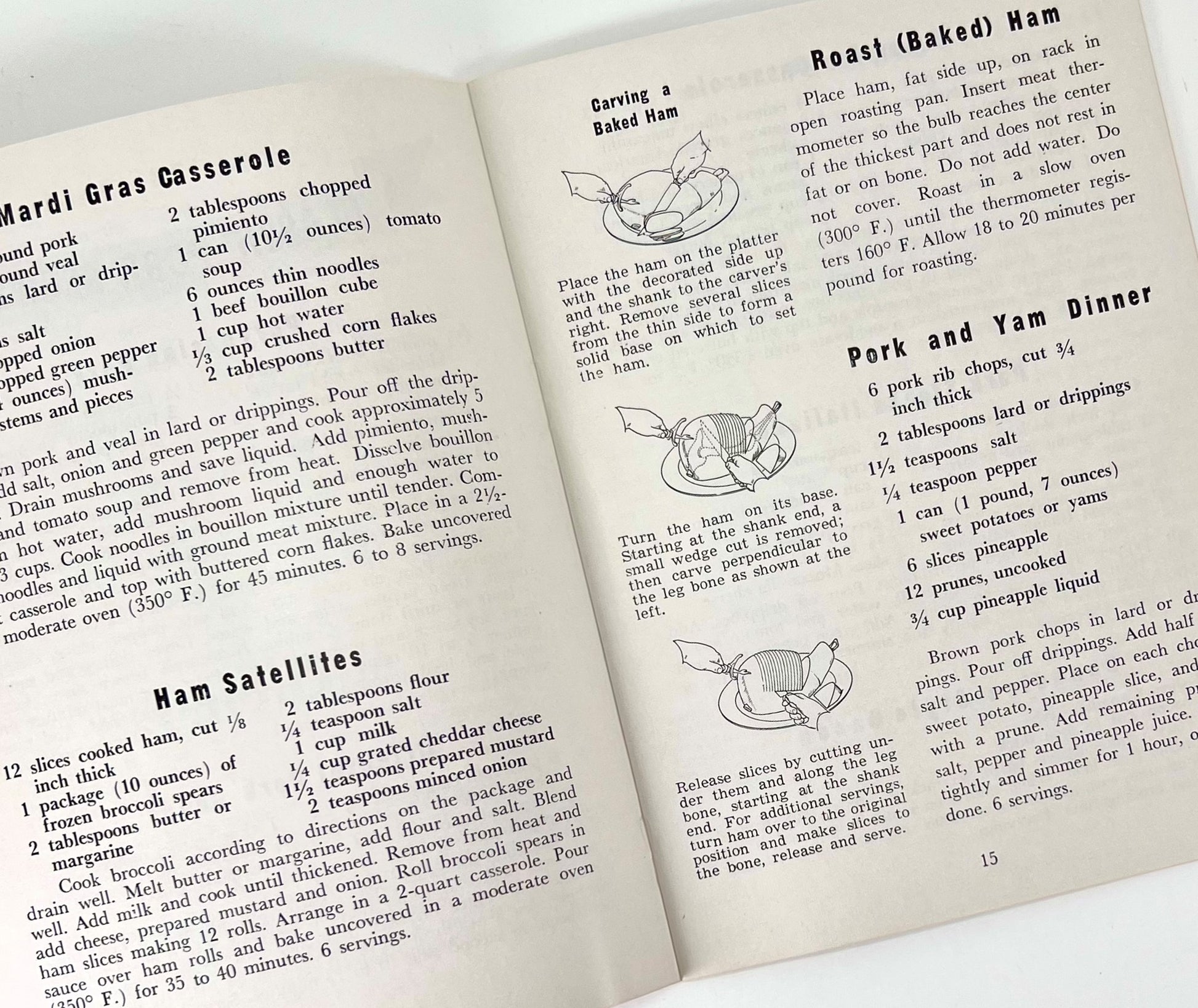 Measuring approximately 6 3/4" x 4 5/8" this souvenir of the WEEU-UGI Gas Cooking School held on 10, 11, 12, 13 November, 1959, includes 39 pages of recipes, tips about different cuts of meats and their preparation, and classic 1950s photos.
