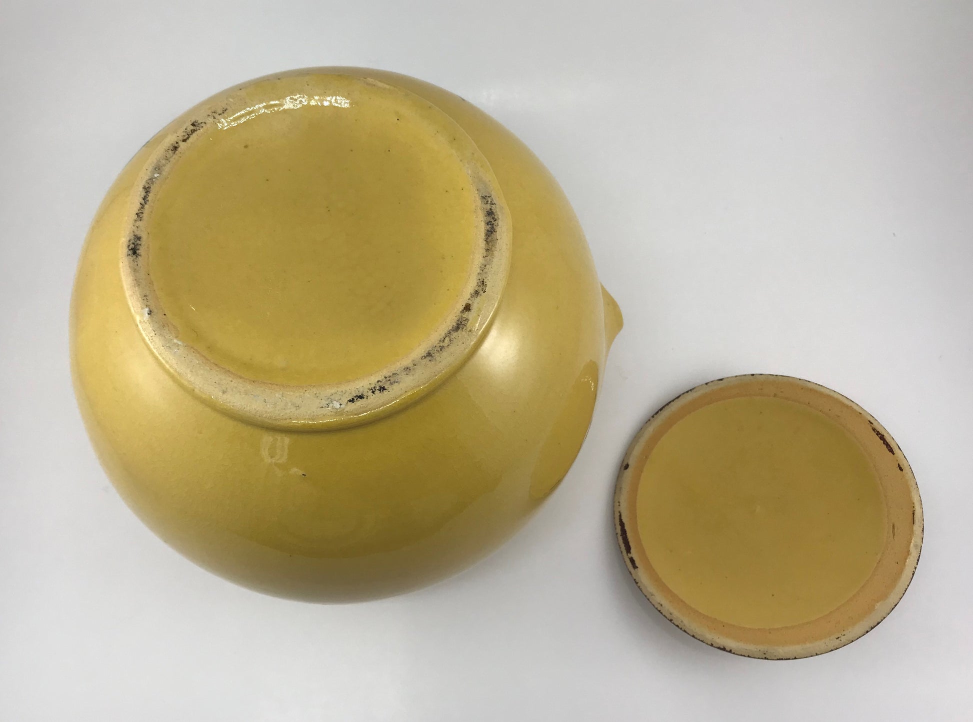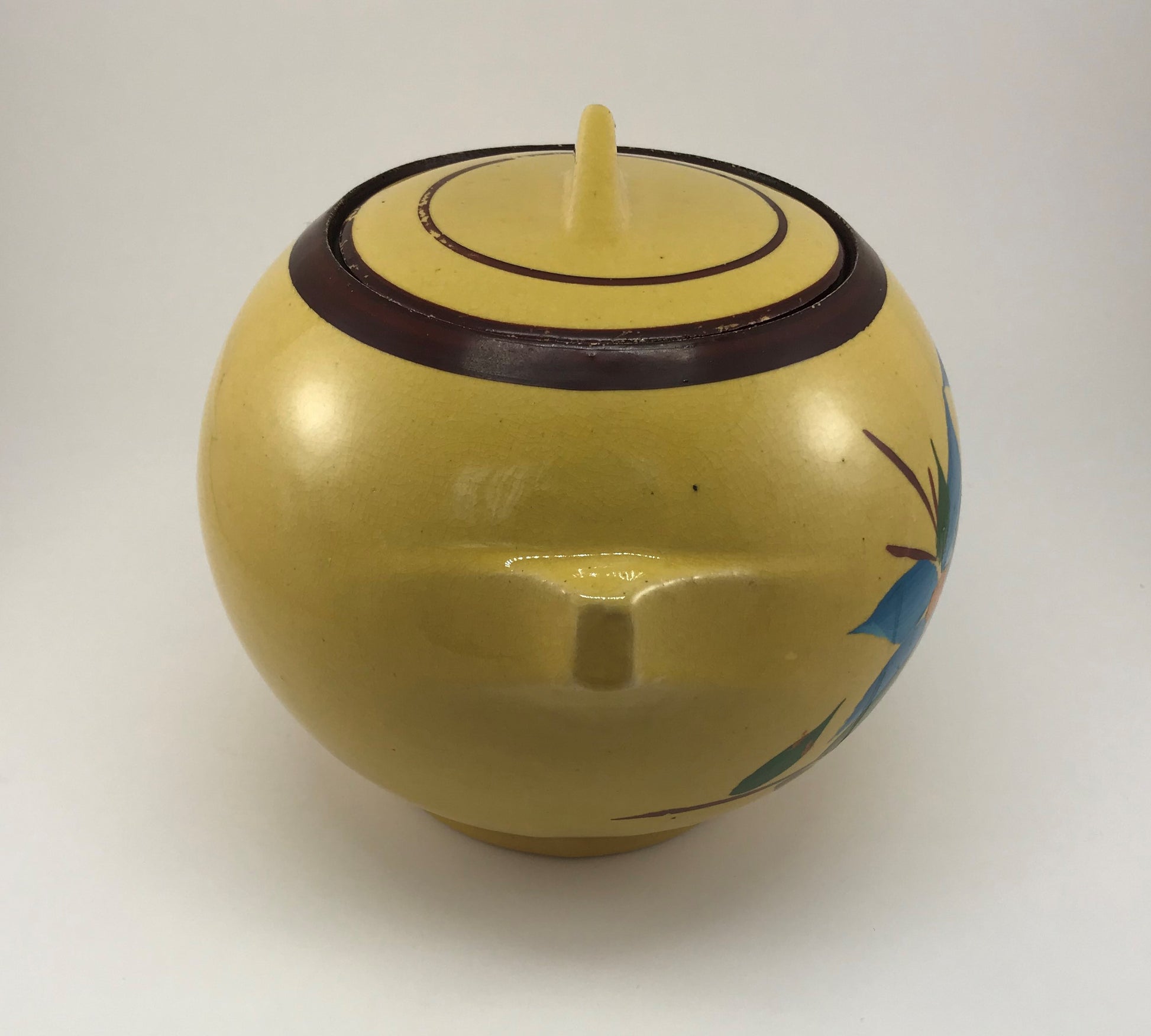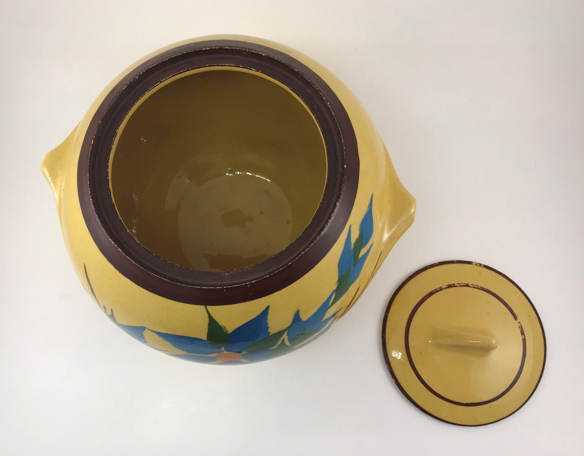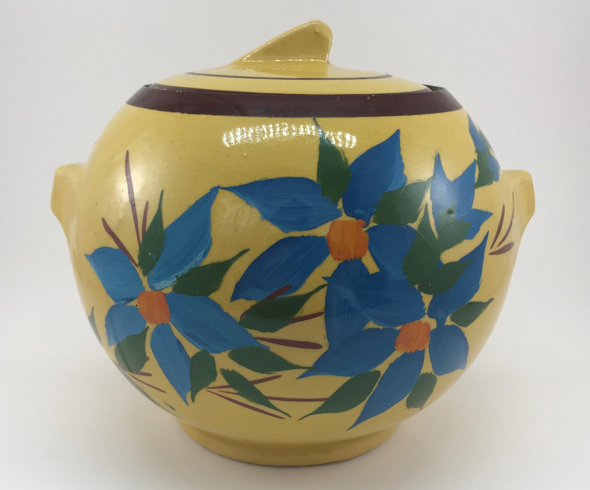 Manufactured in the late 1930s or early 1940s, this sunny yellow cookie jar by McCoy is charmingly hand-painted with lovely blue flowers overall. The style and decorative method for this McCoy line insured that no two are exactly the same given the artist's personal touch. As with so many kitchen pieces from the early years of the 20th century beauty and function were given equal billing - why not have a cookie jar that is designed with classic 1930s styling features and beautiful flowers as well? And, measuring approximately 7" in height x 8.5" in width from handle to handle, there is plenty of room for lots of favorite cookies!