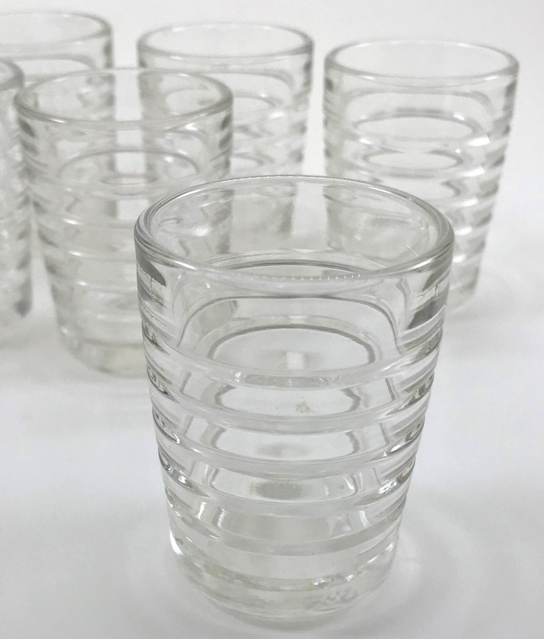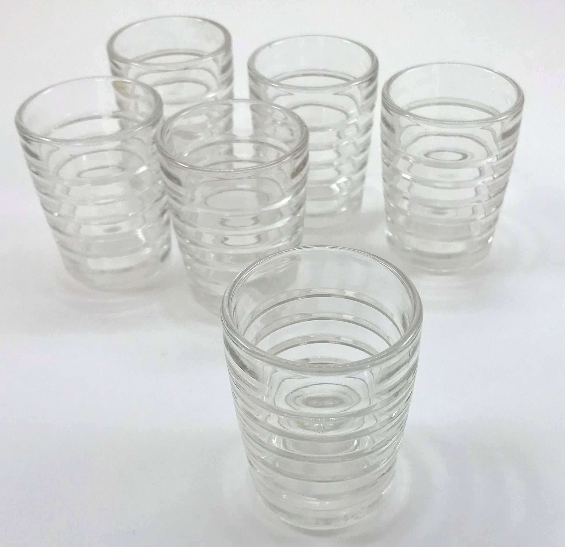 Set of six mid-century clear glass shot glasses. Classic horizontal ribbed pattern. Starting in 1950s suburbia, home bars were a must, whether it was a bar cart in the living room or den or a separate room dedicated to entertaining and imbibing.