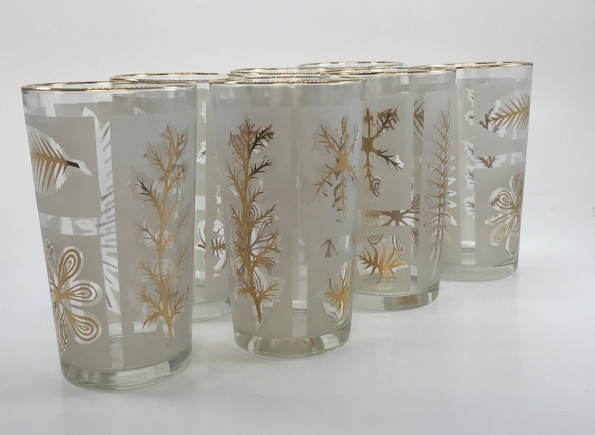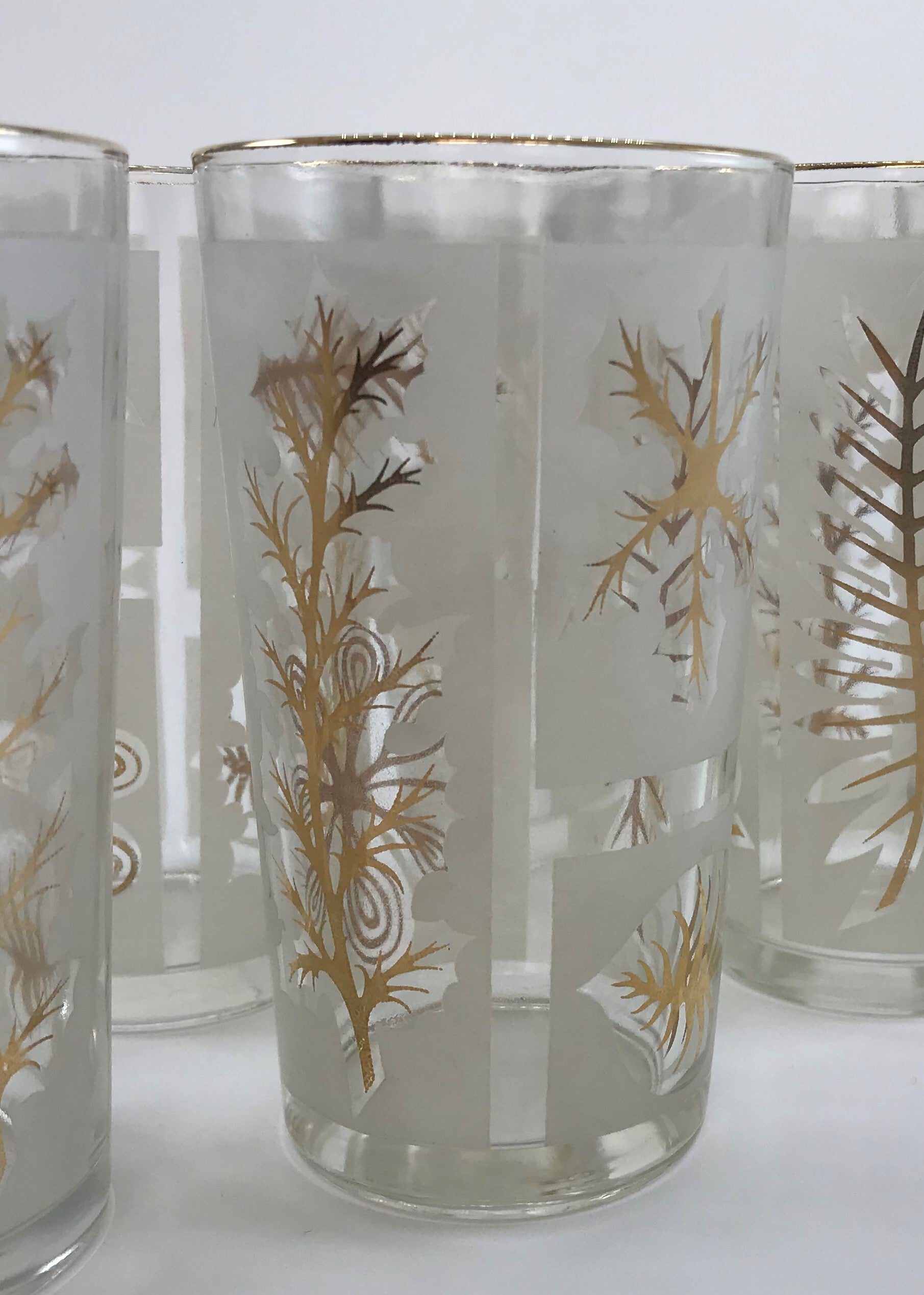 Mid-century Frosted Drinks Glass Set of Seven, Gold-rimmed with Leaf Pattern