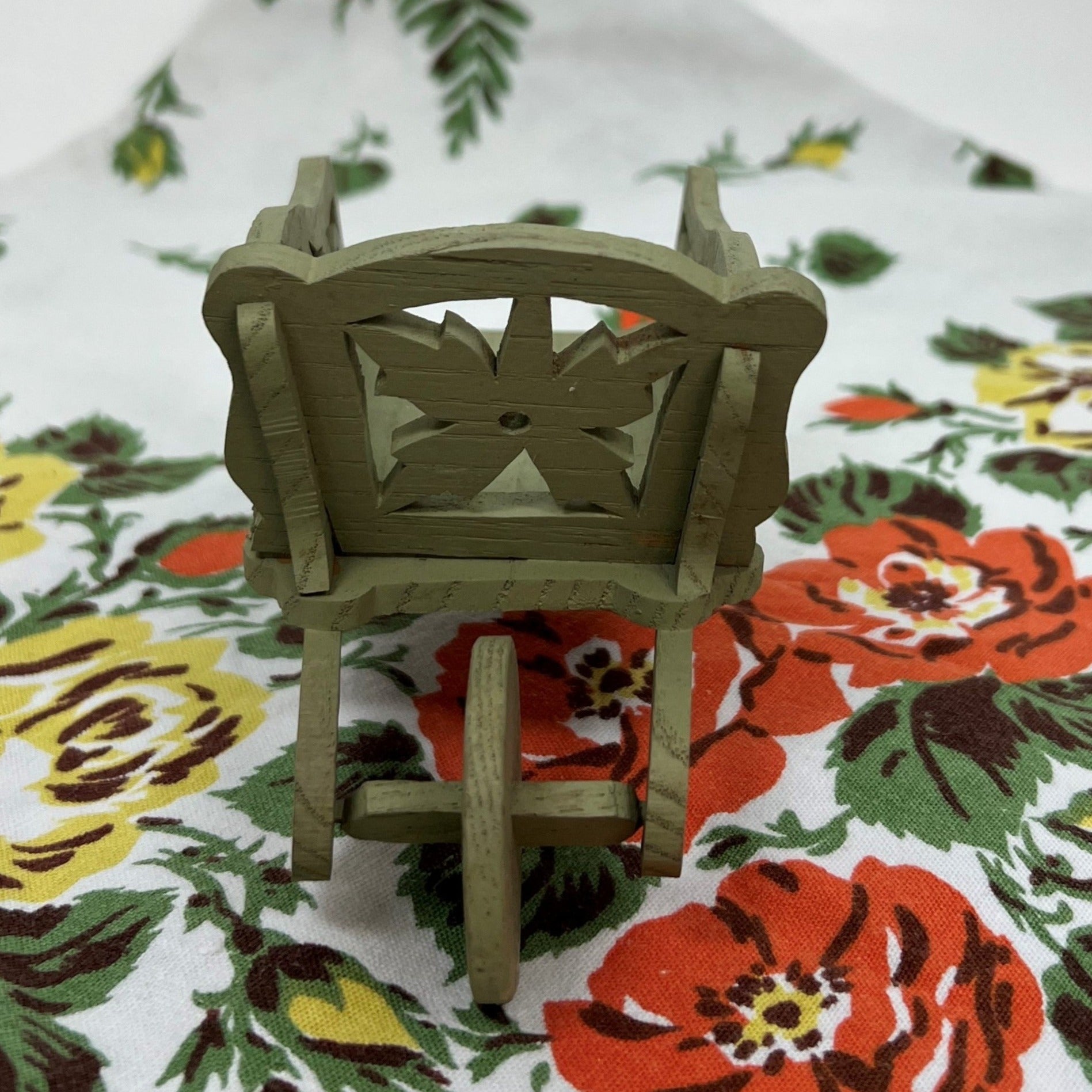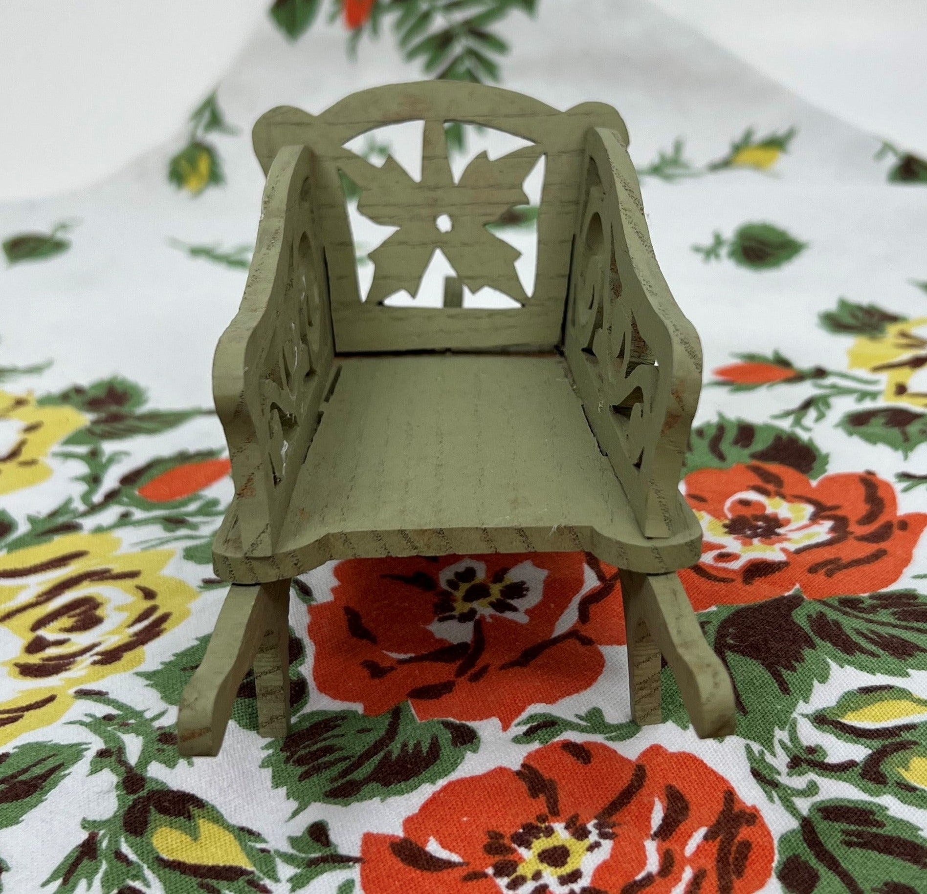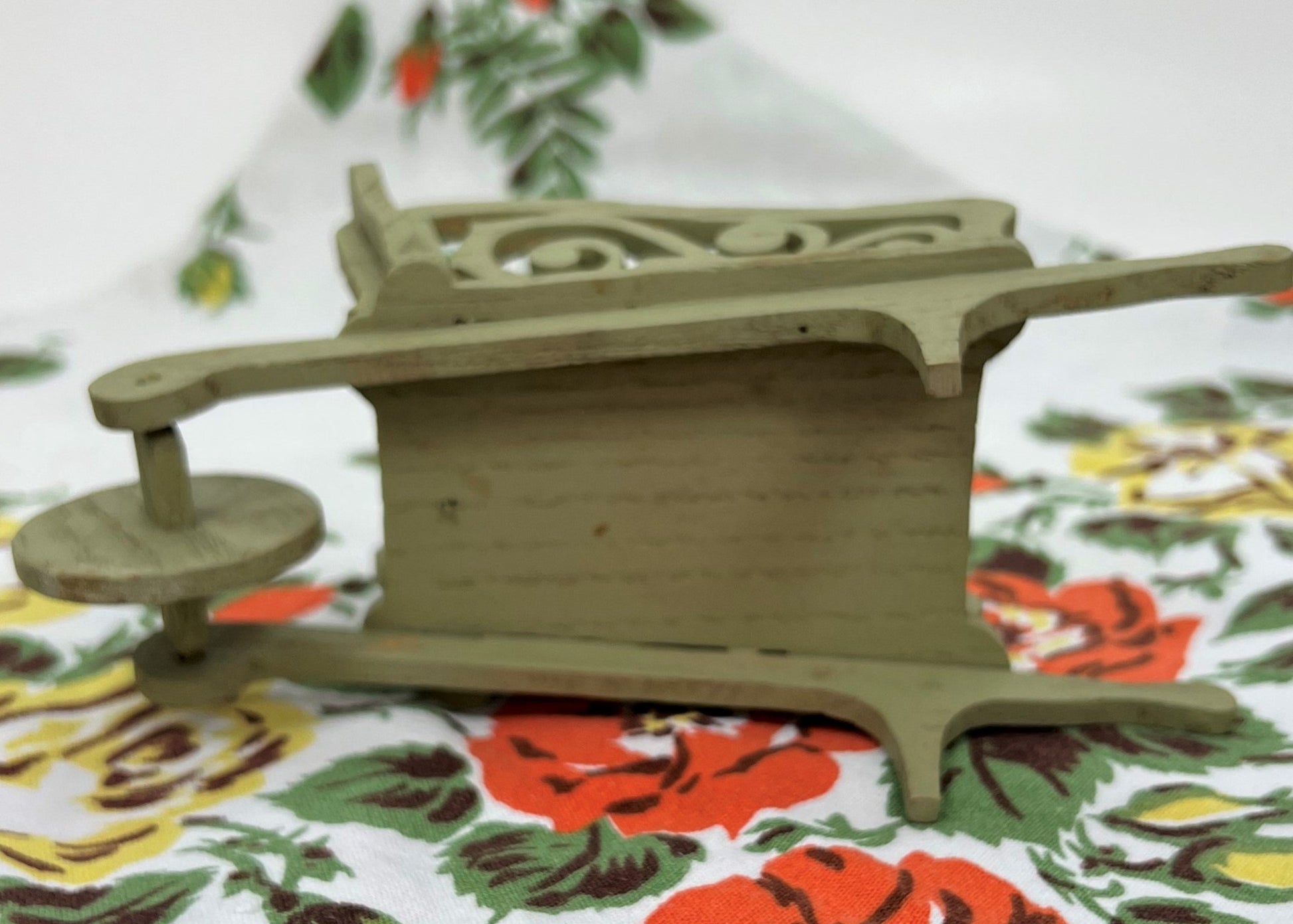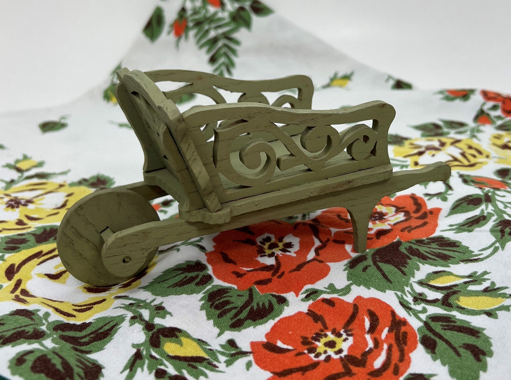 This delightfully charming miniature wheelbarrow is painted garden green and made from die-cut wood. Dating from the 1940s and measuring approximately 7 1/8" from front to back x 3" wide x 3 1/2" tall, the possibilities for its display or use are endless!