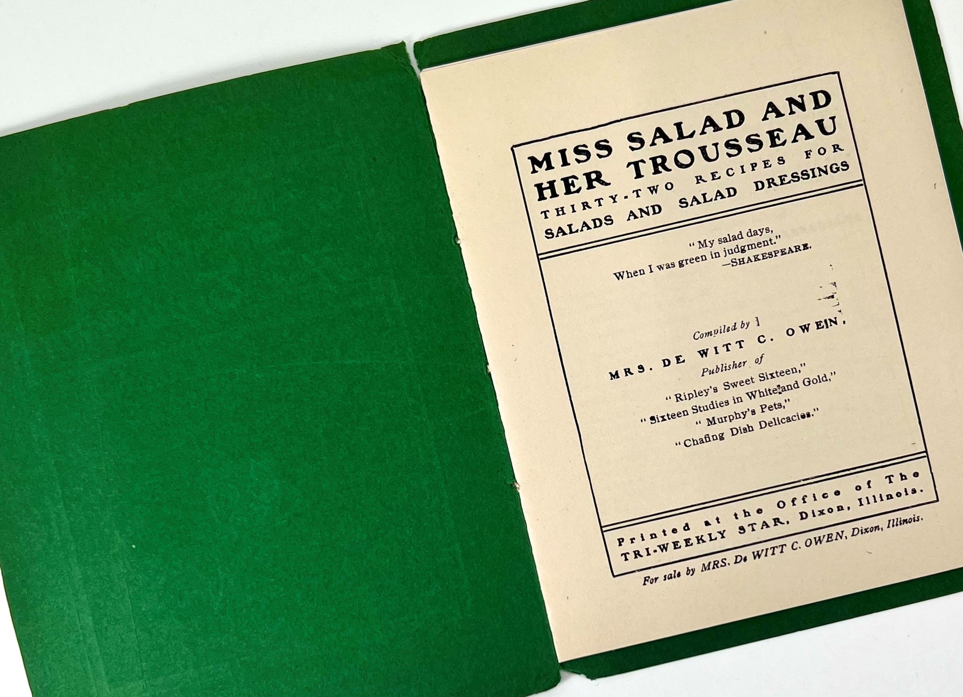 Published in 1901, Miss Salad and Her Trousseau was compiled by Mrs. De Witt C. Owen and printed at the office of The Tri-Weekly Star in Dixon, Illinois. Measuring approximately 6" x 4 5/8" with 15 pages, the booklet includes so many simple and tempting salads, it's hard to choose which to make first. Vegetable salads, fruits salads, and seafood salads abound and the ingredient choices paint a colorful picture of entertaining life at the turn of the 20th century.