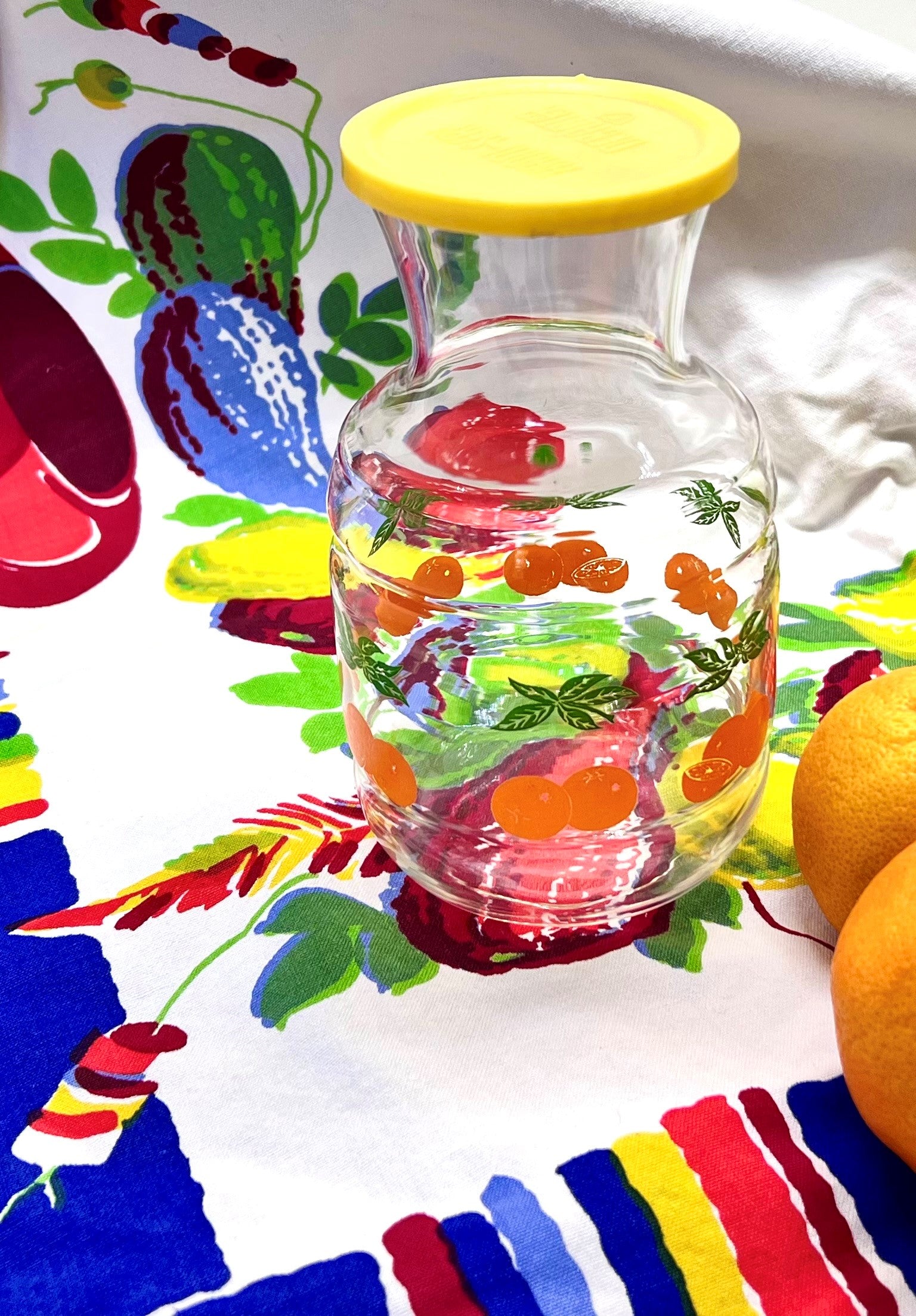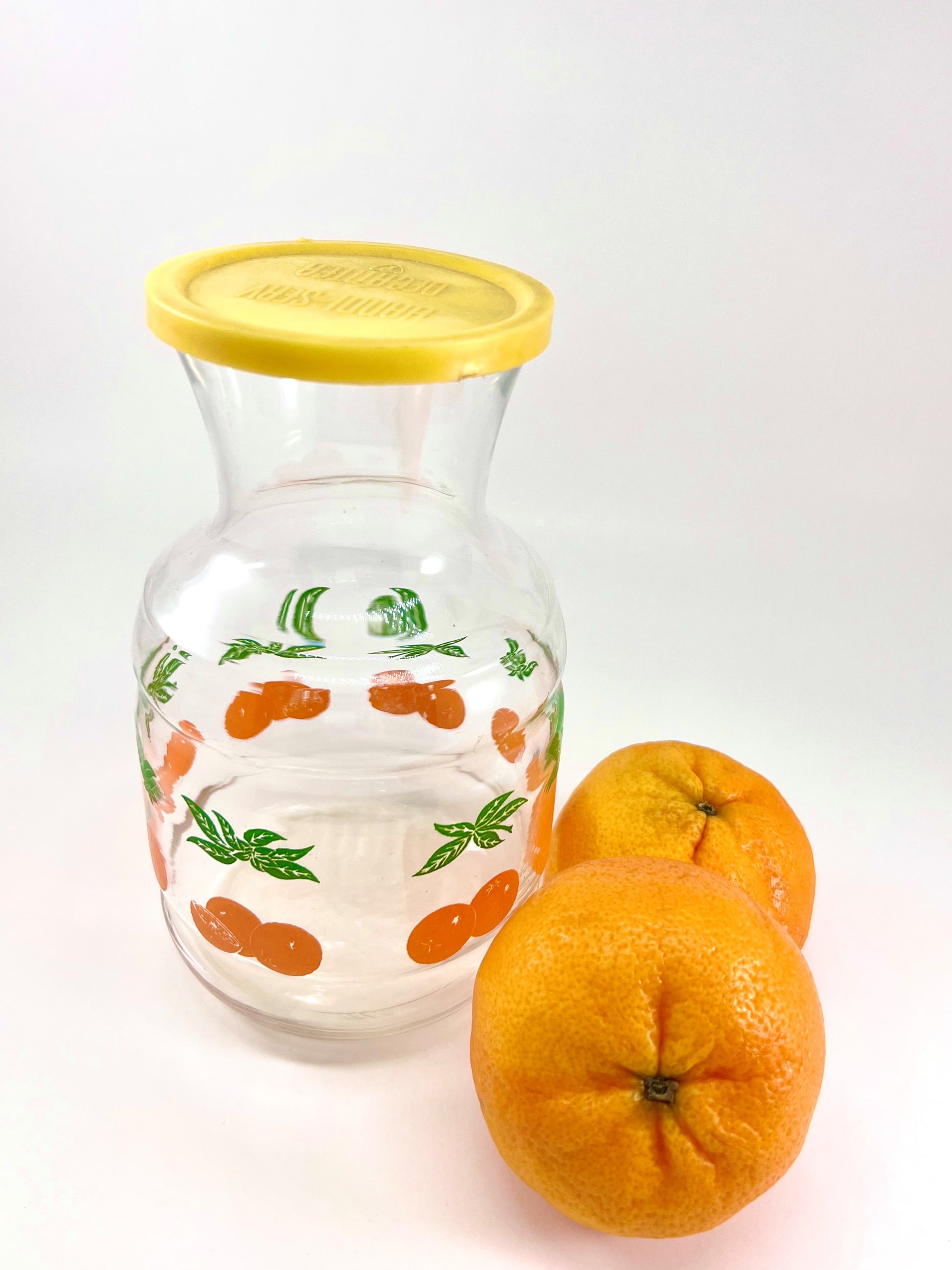 Measuring approximately 6 1/4" tall with its bright yellow "Handi-serv Decanter" lid, it's just the right size to hold what you need, but not too big to take up too much space. And, this carafe could be used for so many purposes in addition to a juice vessel (cocktails? vase? plant watering jug?).