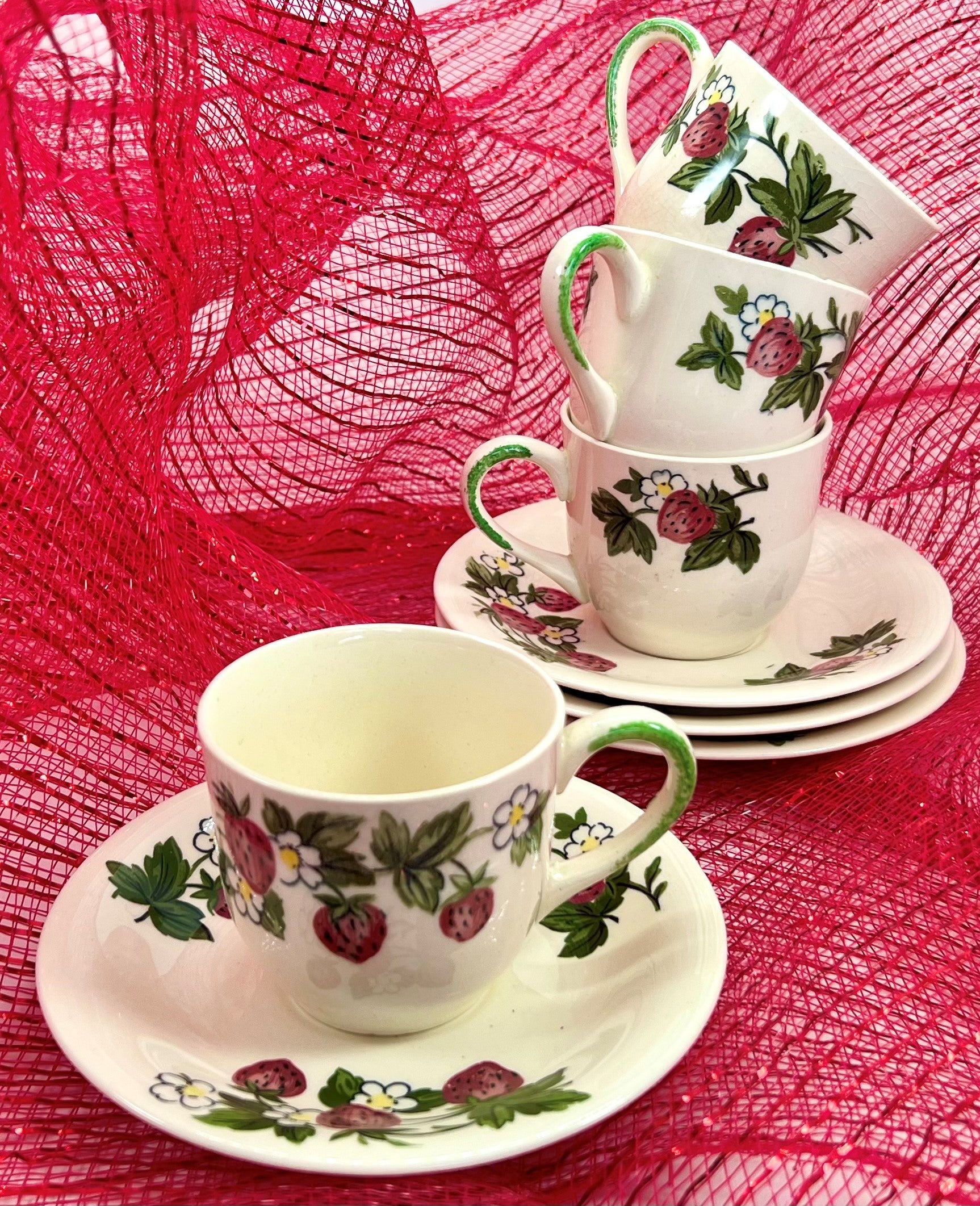 Strawberries and Flowers, Paden City Pottery Shenandoah Ware Demitasse Cup and Saucer, Set of Four