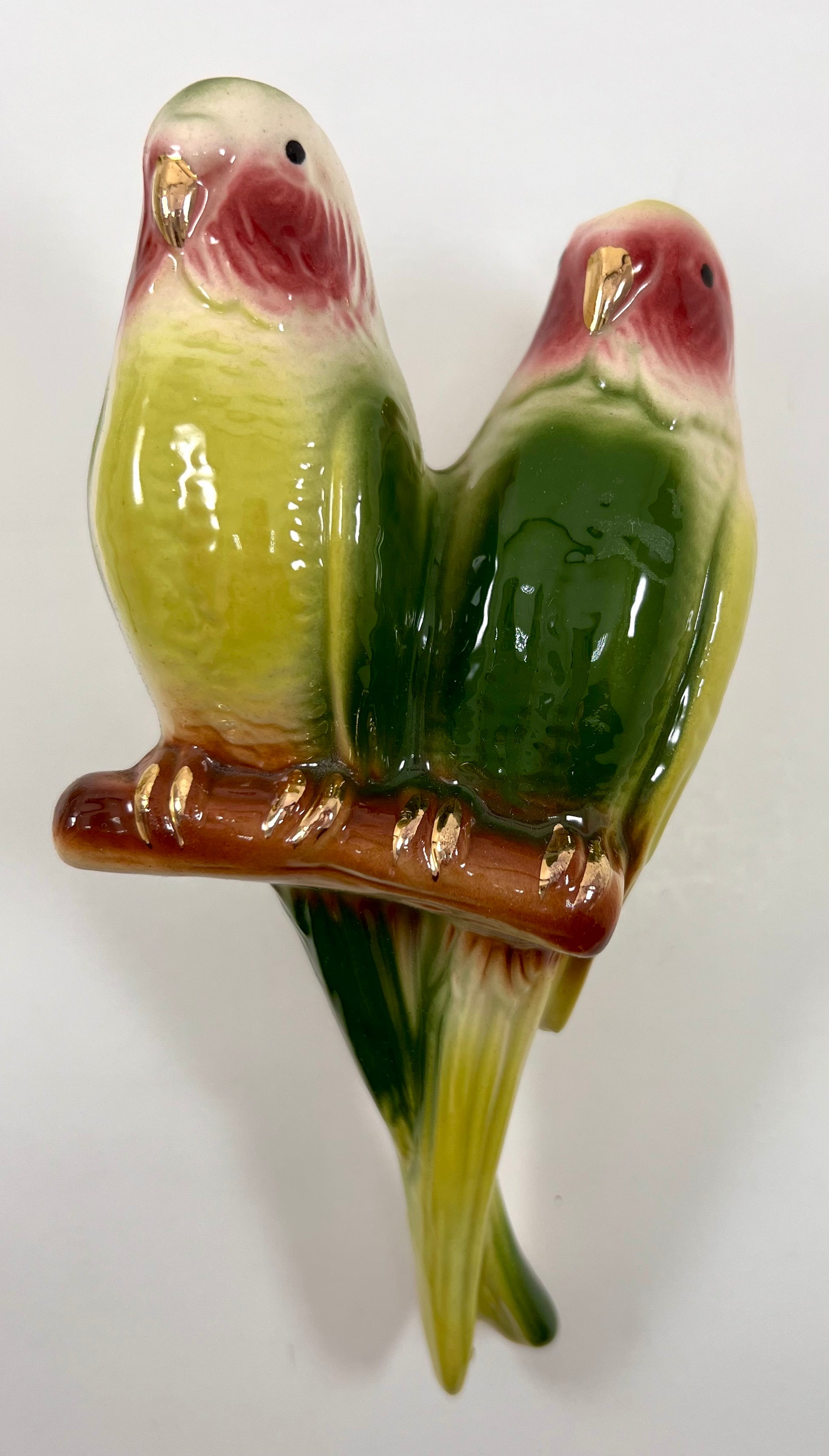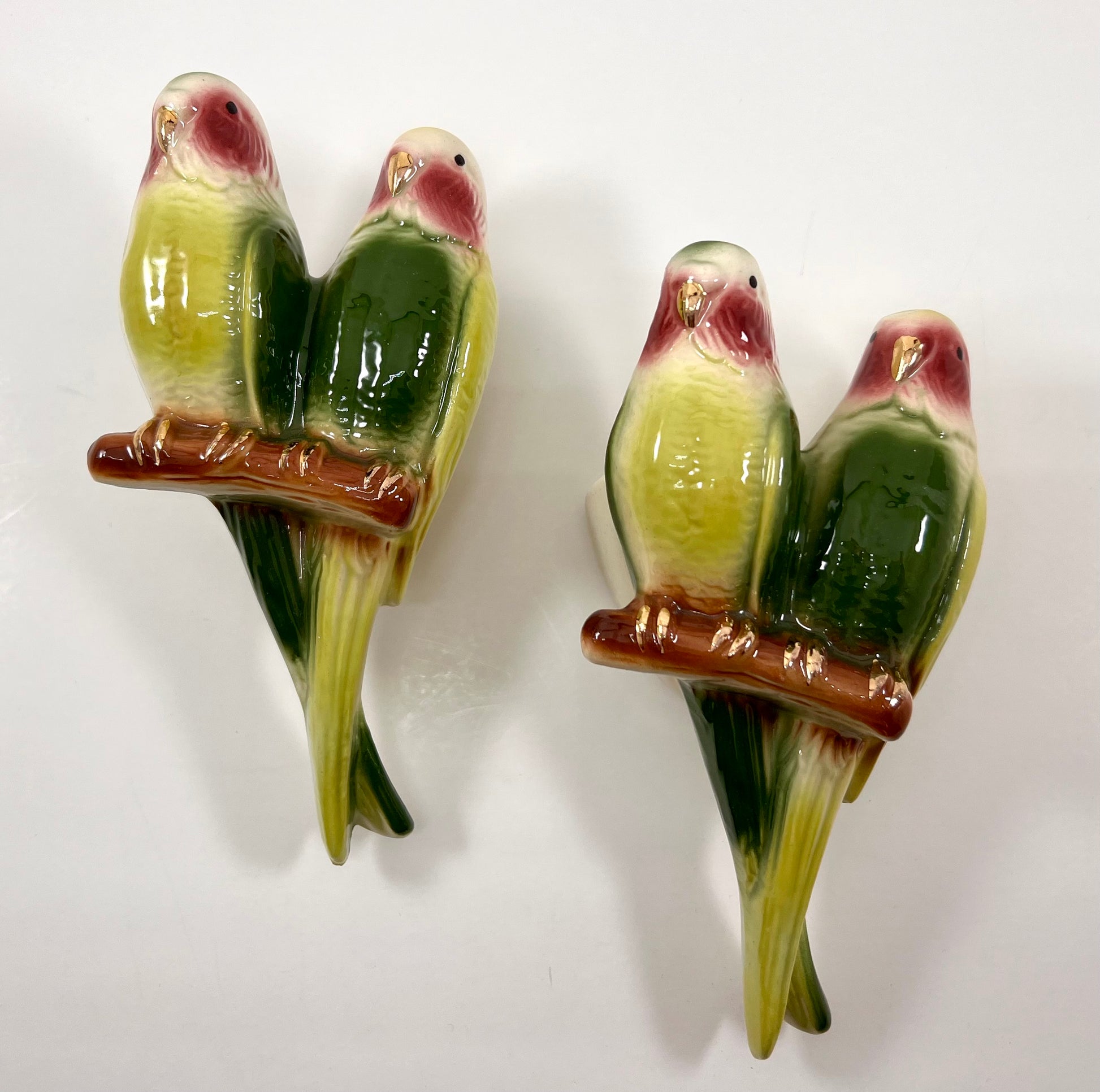 Royal Copley ceramics were manufactured by the Spaulding China Company of Sebring, Ohio between 1941 and 1957. This striking set of wall pockets, each featuring a pair of parakeets perched on a branch, is glazed in an evocative mid-century color palette which combining the two products for which Royal Copley was best known: figural planters and small figurines. These shades of green and burgundy were at the height of trendiness during the middle years of the 20th century and would have been used in fabrics, decorative housewares, dinnerware, and furnishings.